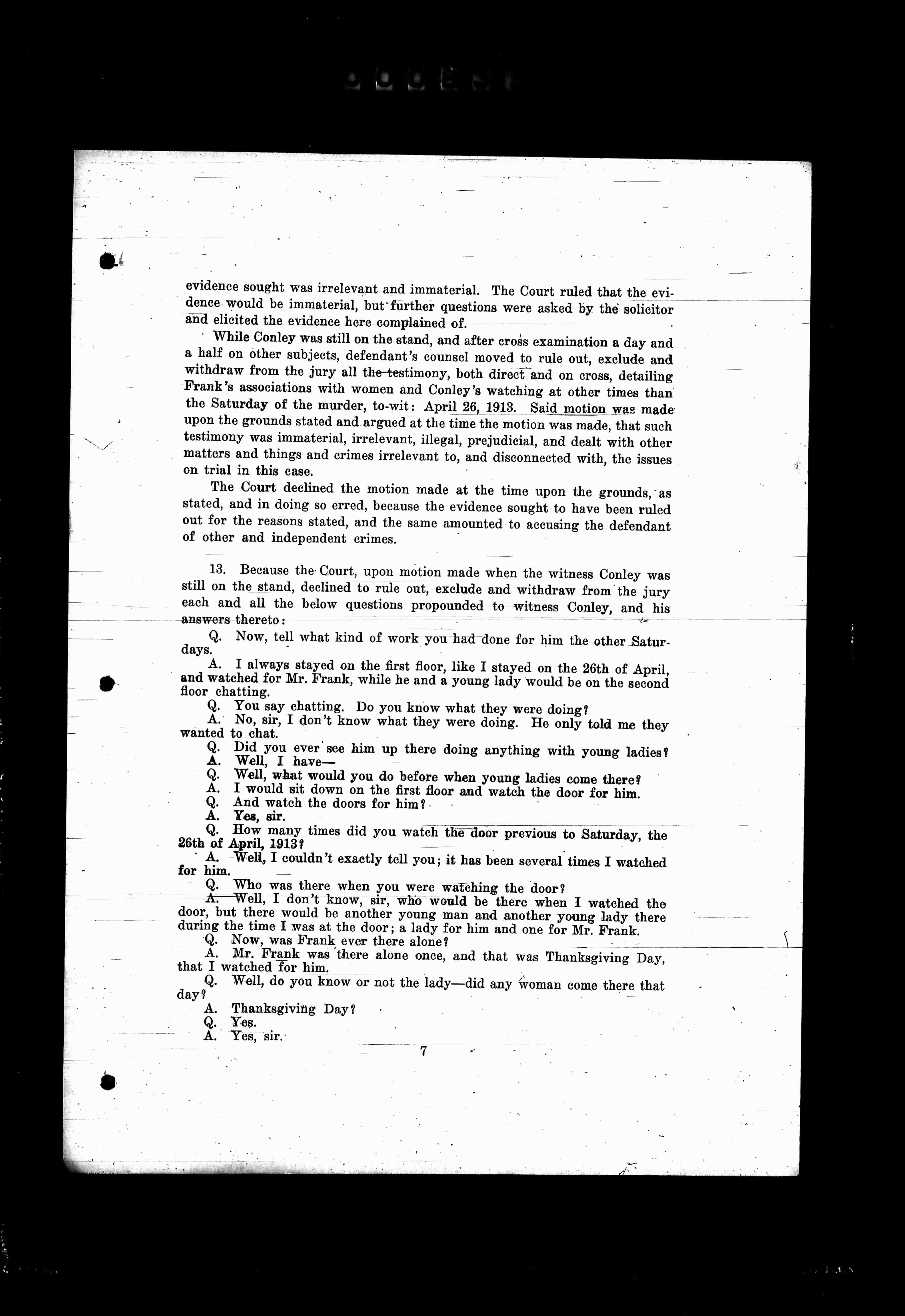 While Conley was still on the stand, and after cross examination a day and a half on other subjects, defendant's counsel made a motion to rule out, exclude and withdraw from the jury all the-testimony, both direct and on cross, detailing Frank's associations with women and Conley's watching at other times than the Saturday of the murder, to-wit: April 26, 1913. Said motion was made upon the grounds stated and argued at the time the motion was made, that such testimony was immaterial, irrelevant, illegal, prejudicial, and dealt with other matters and things and crimes irrelevant to, and disconnected with, the issues on trial in this case.