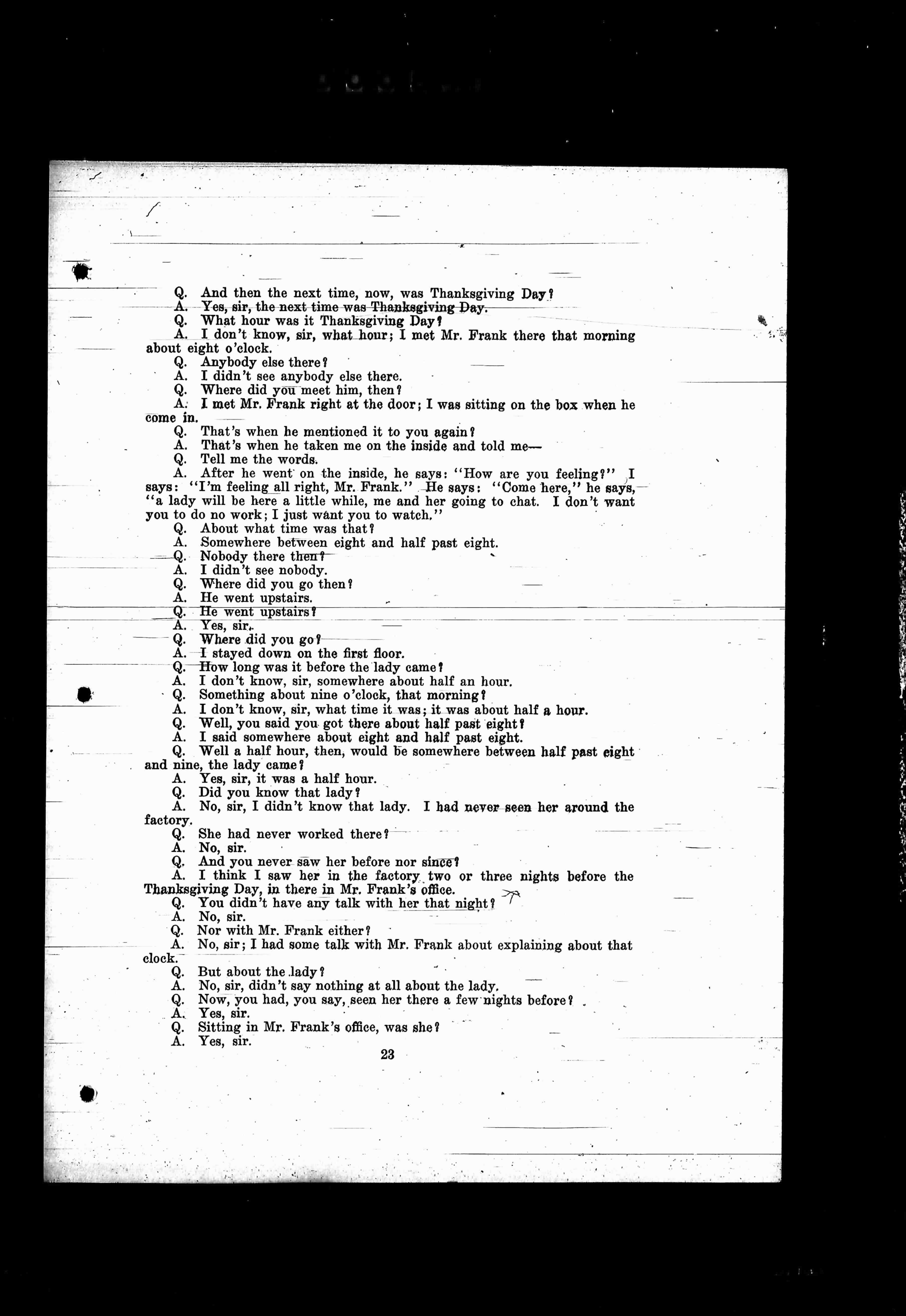 A. I think I saw her in the factory two or three nights before the Thanksgiving Day, in there in Mr. Frank's office.