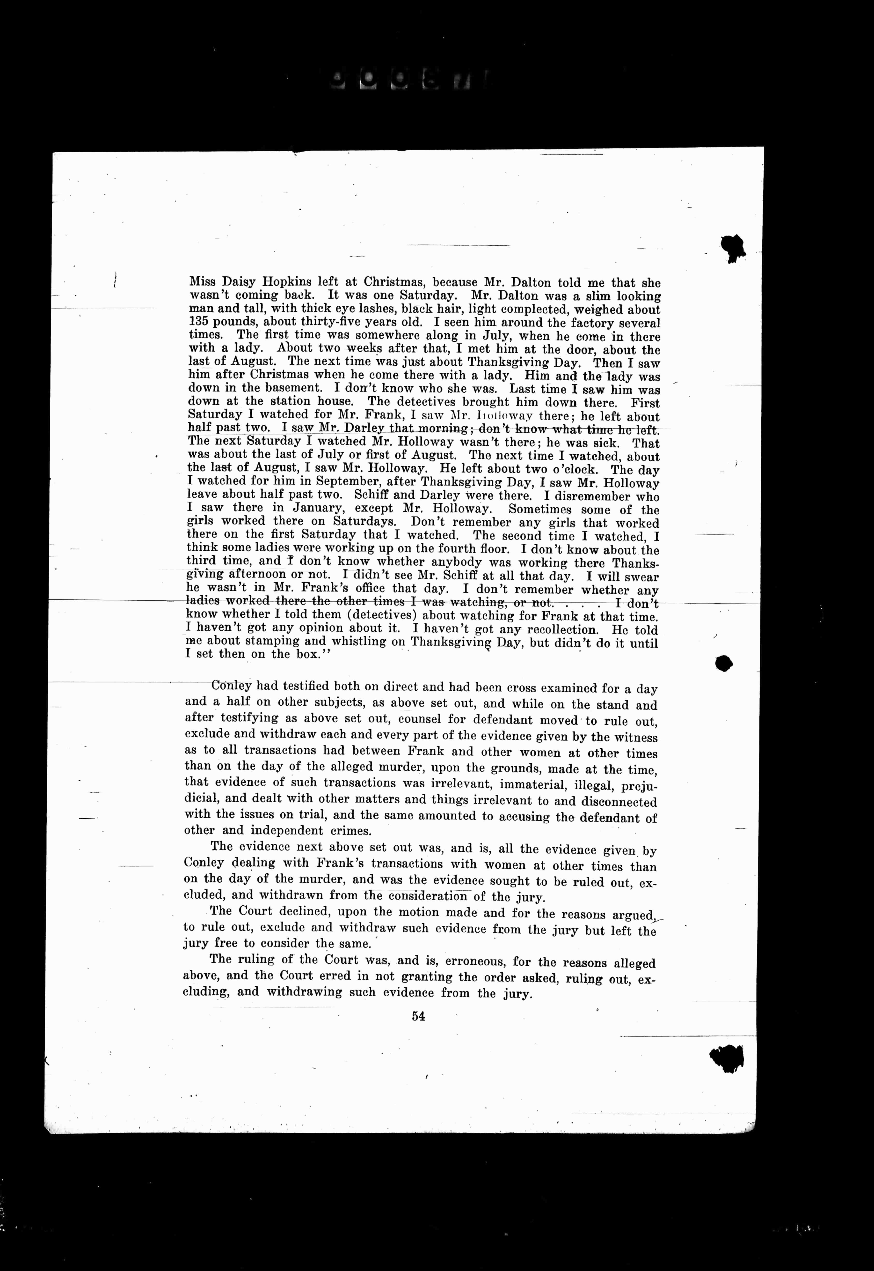 Miss Daisy Hopkins left at Christmas, because Mr. Dalton told me that she wasn't coming back. It was one Saturday. Mr. Dalton was a slim looking man and tall, with thick eye lashes, black hair, light complected, weighed about 135 pounds, about thirty-five years old. I seen him around the factory several times. The first time was somewhere along in July, when he come in there with a lady. About two weeks after that, I seen him at the door, about the last of August. The next time was just about Thanksgiving Day. Then I saw him after Christmas when he come there with a lady. Him and the lady was down in the basement. I don't know who she was. Last time I saw him was down at the station house. The detectives brought him down there. First Saturday I watched for Mr. Frank, I saw Mr. Holloway there; he left about half past two. I saw Mr. Darley that morning; don't know what time he left. The next Saturday I watched Mr. Holloway wasn't there; he was sick. That was about the last of July or first of August. The next time I watched, about the last of August, I saw Mr. Holloway. He left about two o'clock. The day I watched for him in September, after Thanksgiving Day, I saw Mr. Holloway leave about half past two. Schiff and Darley were there. I disremember who I saw there in January, except Mr. Holloway. Sometimes some of the girls worked there on Saturdays. Don't remember any girls that worked there on the first Saturday that I watched. The second time I watched, I think some ladies were working up on the fourth floor. I don't know about the third time, and I don't know whether anybody was working there Thanksgiving afternoon or not. I didn't see Mr. Schiff at all that day. I will swear he wasn't in Mr. Frank's office that day. I don't remember whether any ladies worked there the other times I was watching or not. I don't know whether I told them (detectives) about watching for Frank at that time. I haven't got any opinion about it. I haven't got any recollection. He told me about stamping and whistling on Thanksgiving Day, but didn't do it until I set then on the box."