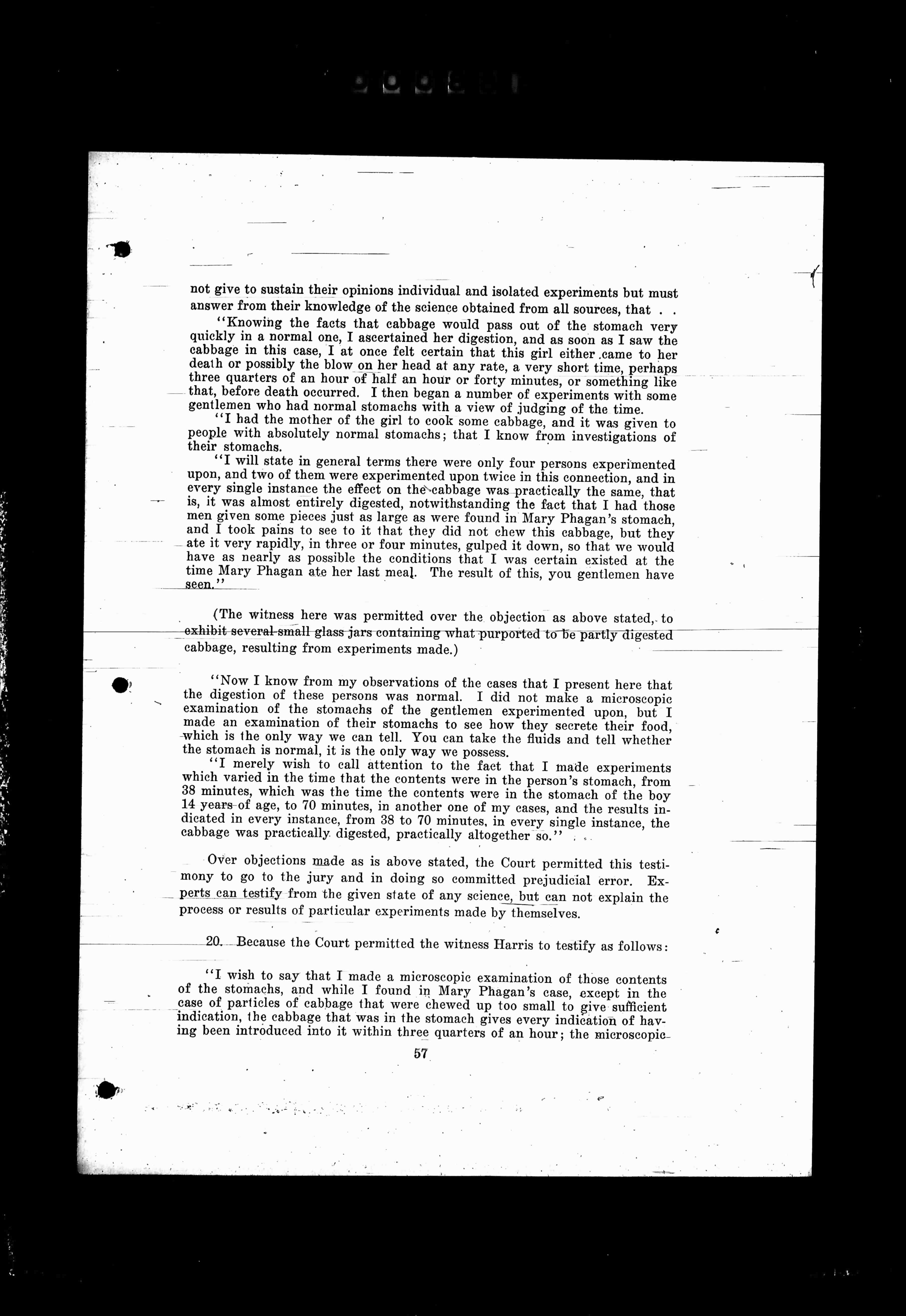 "I will state in general terms there were only four persons experimented upon, and two of them were experimented upon twice in this connection, and in every single instance the effect on the cabbage was practically the same, and that is, it was almost entirely digested, notwithstanding the fact that cabbage is one of the slowest articles of food to be found in Mary Phagan's stomach, and I took pains to see to it that they did not chew this cabbage as they ate it very rapidly, in three or four minutes, gulped it down, so that we would have as nearly as possible the conditions that I was certain existed at the time Mary Phagan ate her last meal. The result of this, you gentlemen have seen."