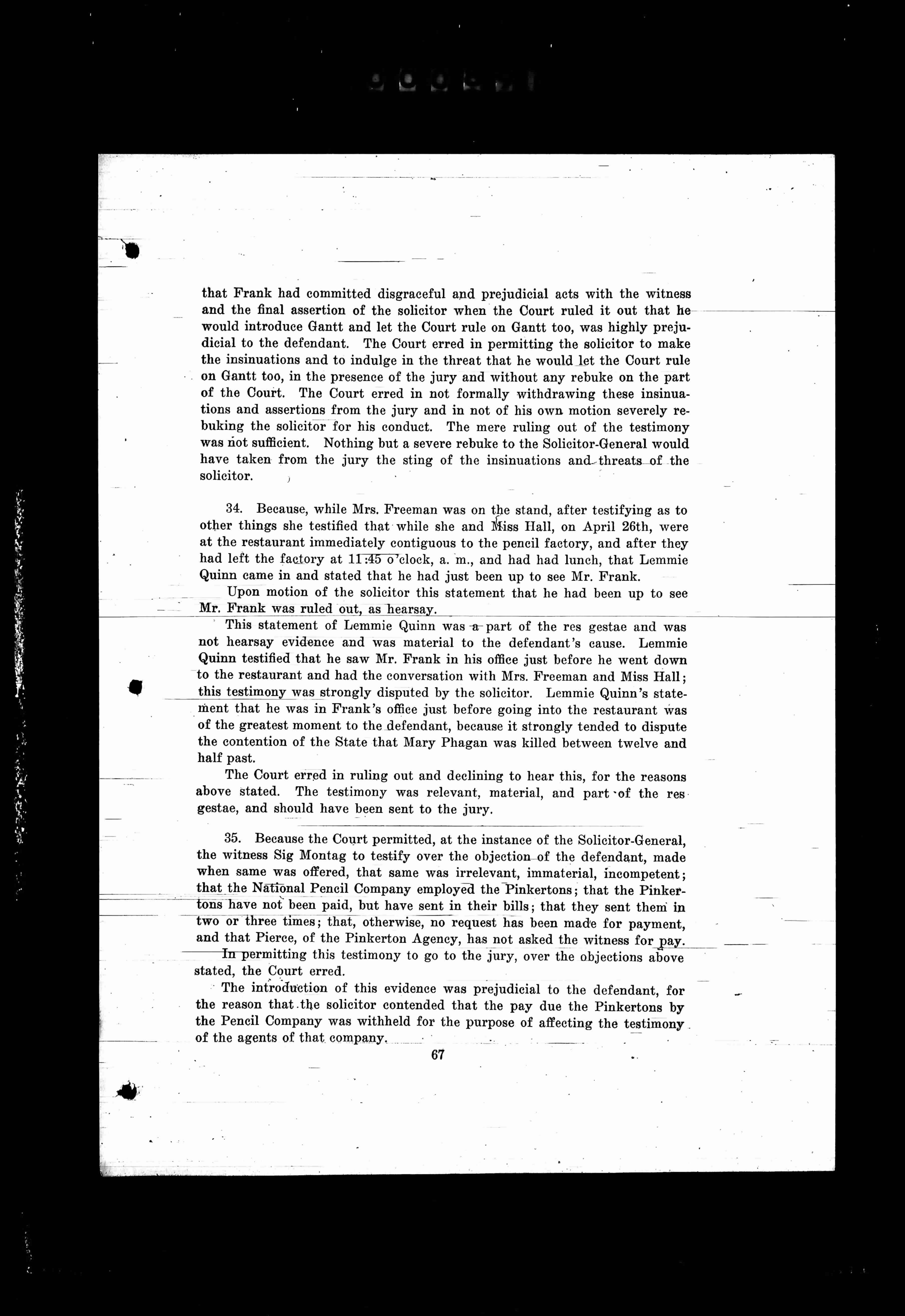 34. Because, while Mrs. Freeman was on the stand, after testifying as to other things she testified that while she and Miss Hall, on April 26th, were at the restaurant immediately contiguous to the pencil factory, and after they had left the factory at 11:45 o'clock, a. m., and had had lunch, that Lemmie Quinn came in and stated that he had just been up to see Mr. Frank.
