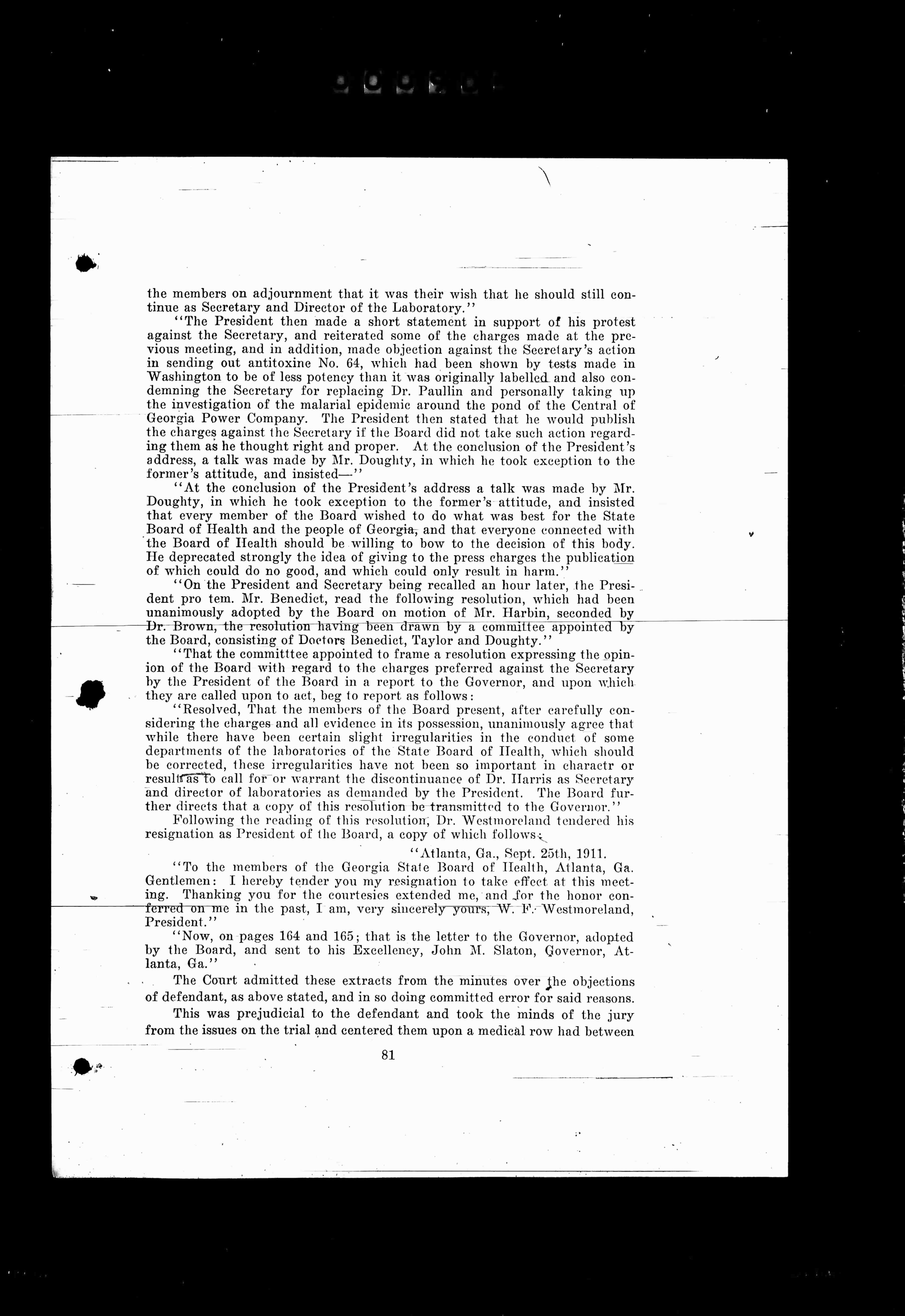"The President then made a short statement in support of his protest against the Secretary, and reiterated some of the charges made at the previous meeting, and in addition made objection against the Secretary's action in sending out antitoxine No. 64, which had been recalled by tests made in Washington to be of less potency than it was originally labelled and also condemning the Secretary for replacing Dr. Paulin and personally taking up the investigation of the malarial epidemic around the pond of the Central of Georgia Power Company. The President then stated that he would publish the charges against the Secretary if the Board did not take such action regarding them as he thought right and proper. At the conclusion of the President's address, a talk was made by Mr. Dougherty, in which he took exception to the former's attitude, and insisted--"