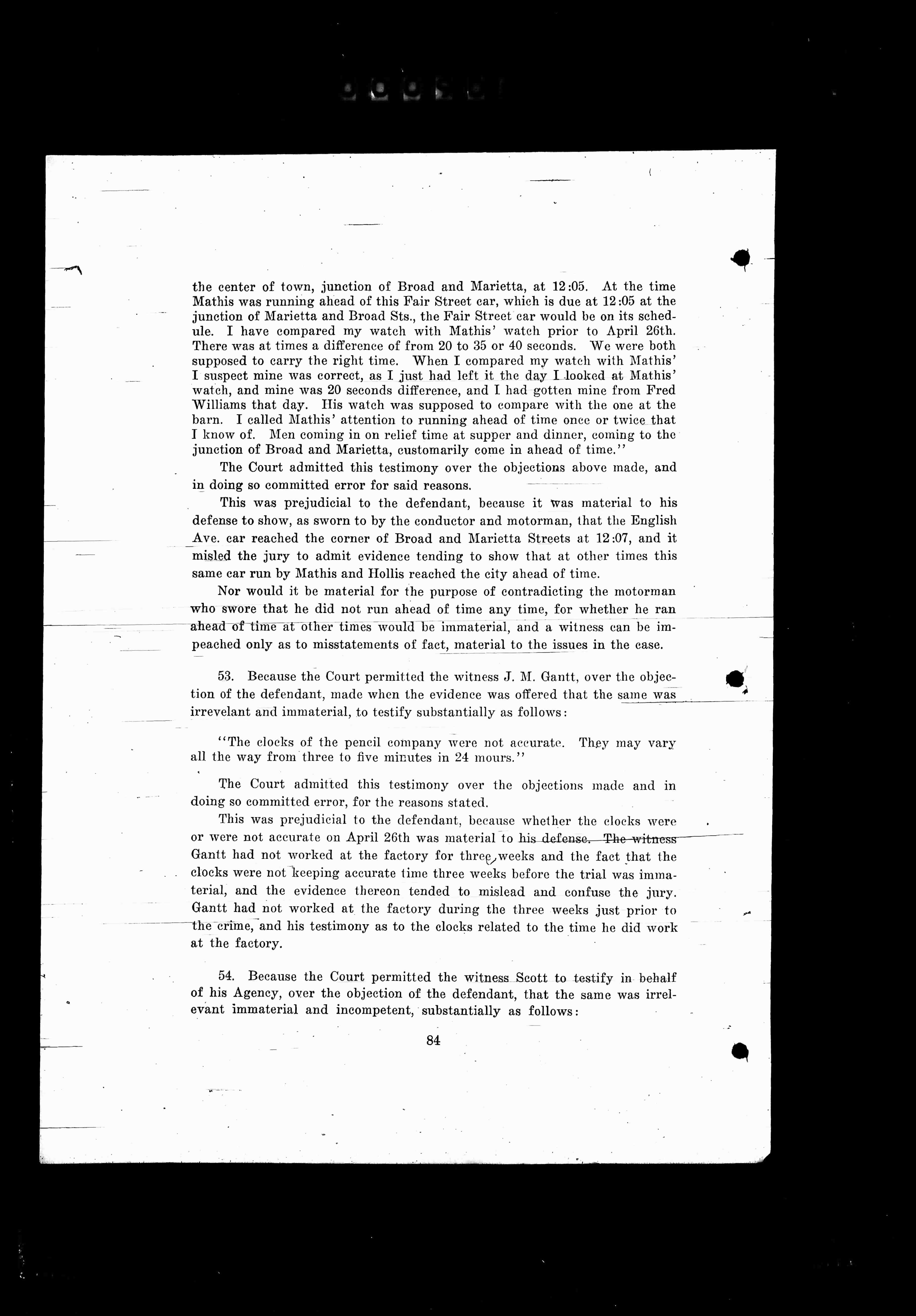 54. Because the Court permitted the witness Scott to testify in behalf of his Agency, over the objection of the defendant, that the same was irrelevant immaterial and incompetent, substantially as follows: