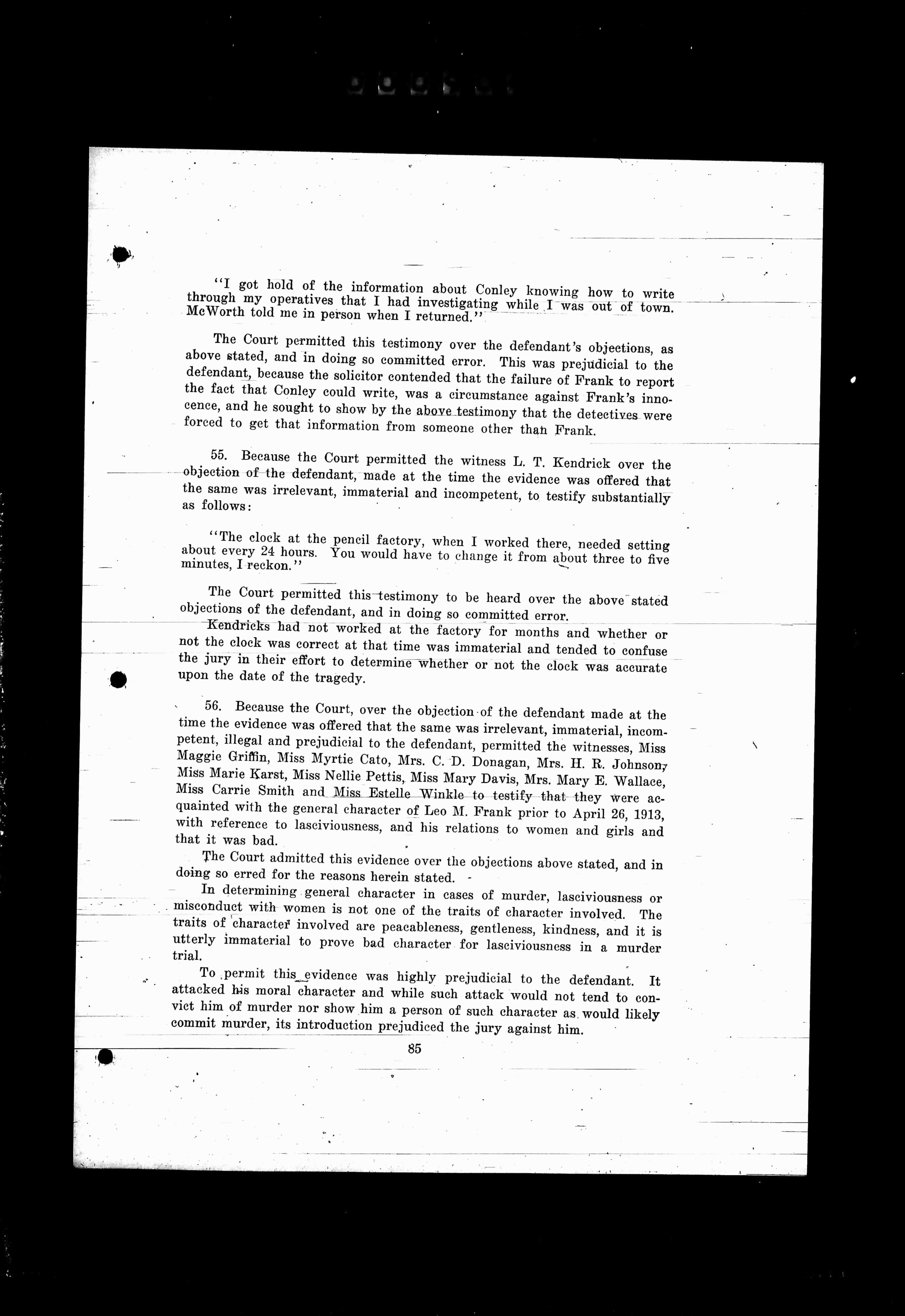 56. Because the Court, over the objection of the defendant made at the time the evidence was offered that the same was irrelevant, immaterial, incompetent, illegal and prejudicial to the defendant, permitted the witnesses, Miss Maggie Griffin, Miss Myrtie Cato, Mrs. C. D. Donagan, Mrs. H. R. Johnson, Miss Marie Karst, Miss Nellie Pettis, Mrs. Mary Davis, Mrs. Mary E. Wallace, Miss Carrie Smith and Miss Estelle Winkle to testify that they were acquainted with the general character of Leo M. Frank prior to April 26, 1913, with reference to lasciviousness, and his relations to women and girls and that it was bad.