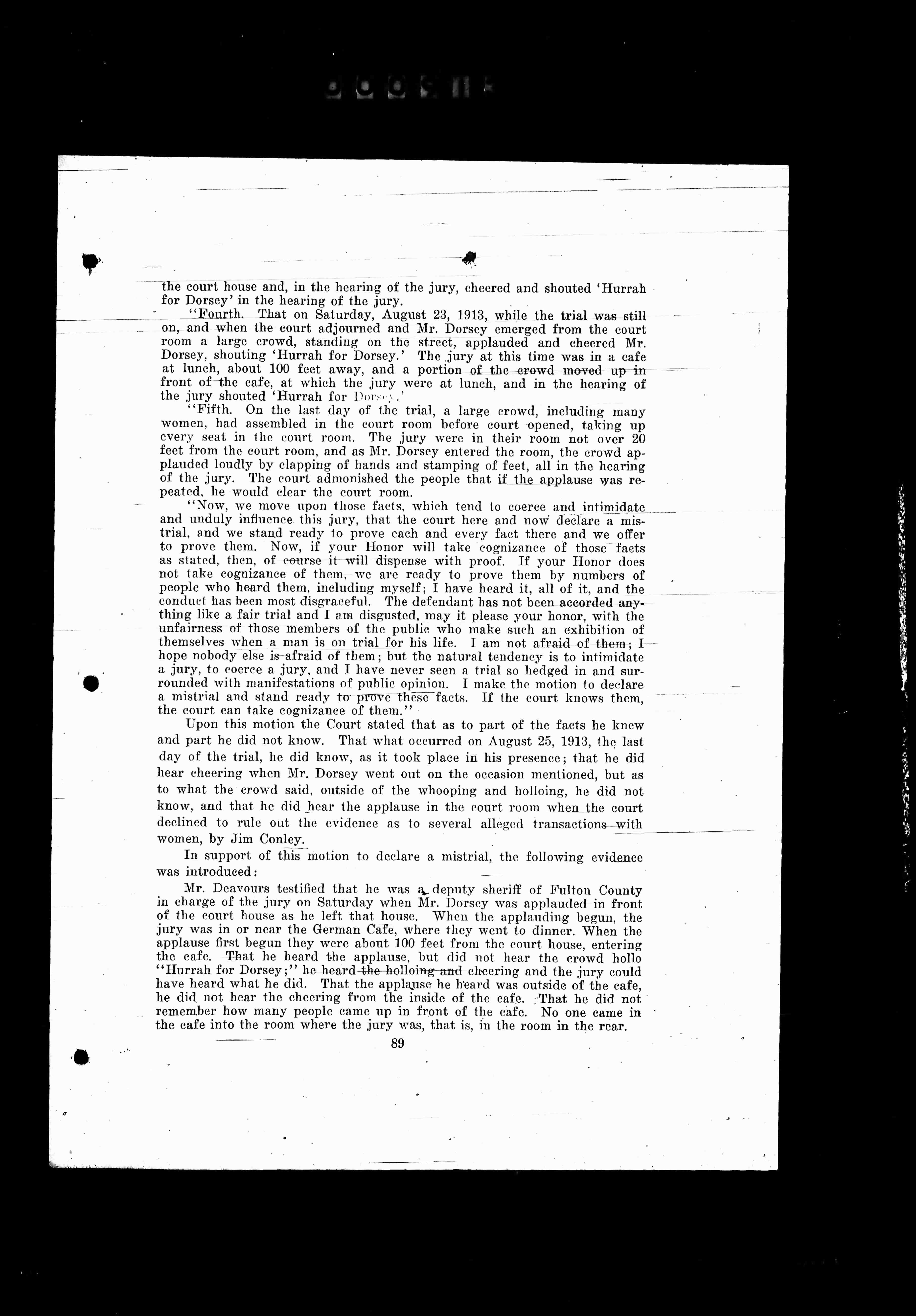 That on Saturday, August 23, 1913, while the trial was still on, and when the court adjourned and Mr. Dorsey emerged from the court room a large crowd, standing on the street, applauded and cheered Mr. Dorsey, shouting 'Hurrah for Dorsey.'