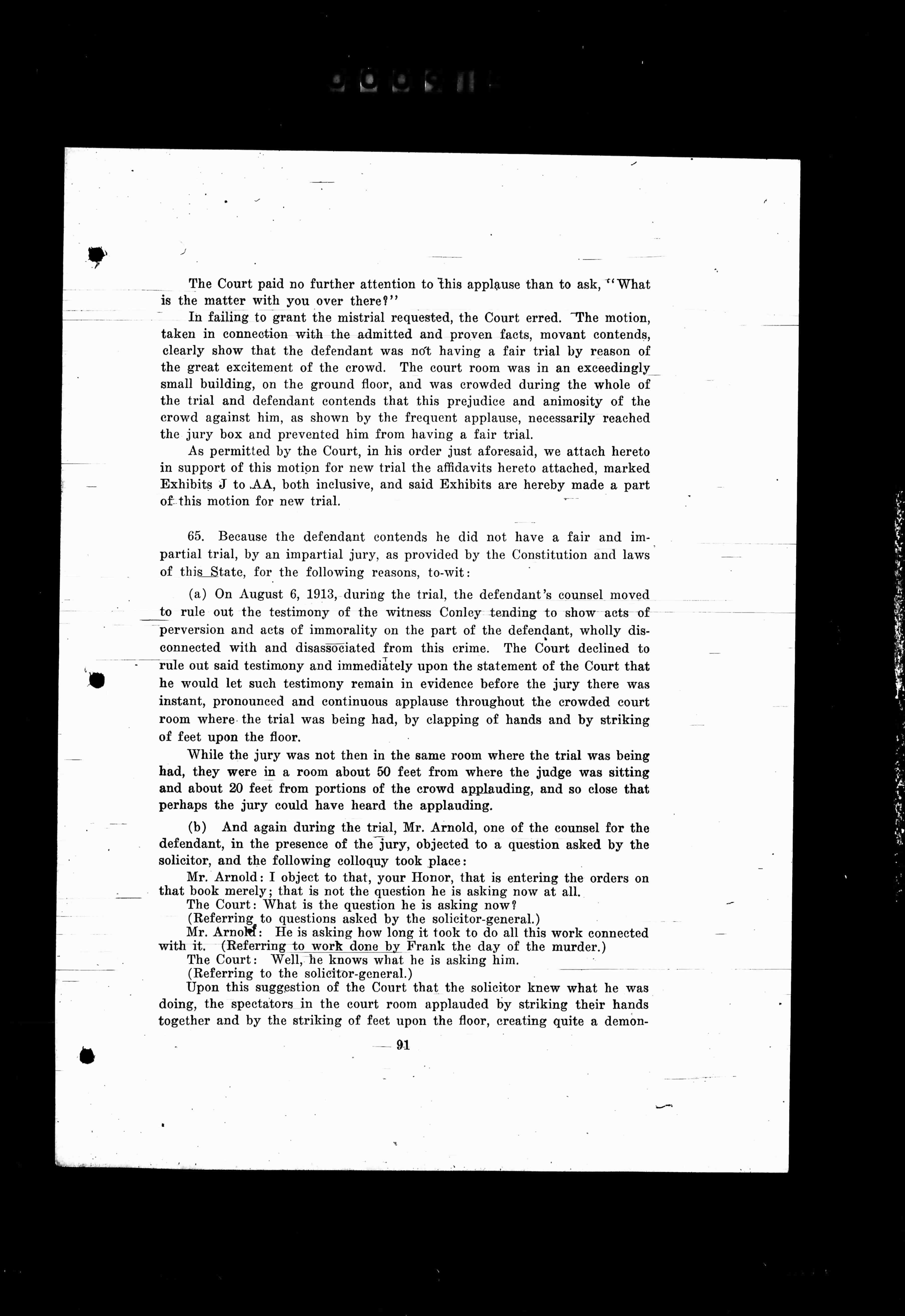 (a) On August 6, 1913, during the trial, the defendant's counsel moved to rule out the testimony of the witness Conley tending to show acts of perversion and acts of immorality on the part of the defendant, wholly disconnected with and disassociated from this crime. The Court declined to rule out said testimony and immediately upon the statement of the Court that he would let such testimony remain in evidence before the jury there was instant, pronounced and continuous applause throughout the crowded court room where the trial was being had, by clapping of hands and by striking of feet upon the floor.