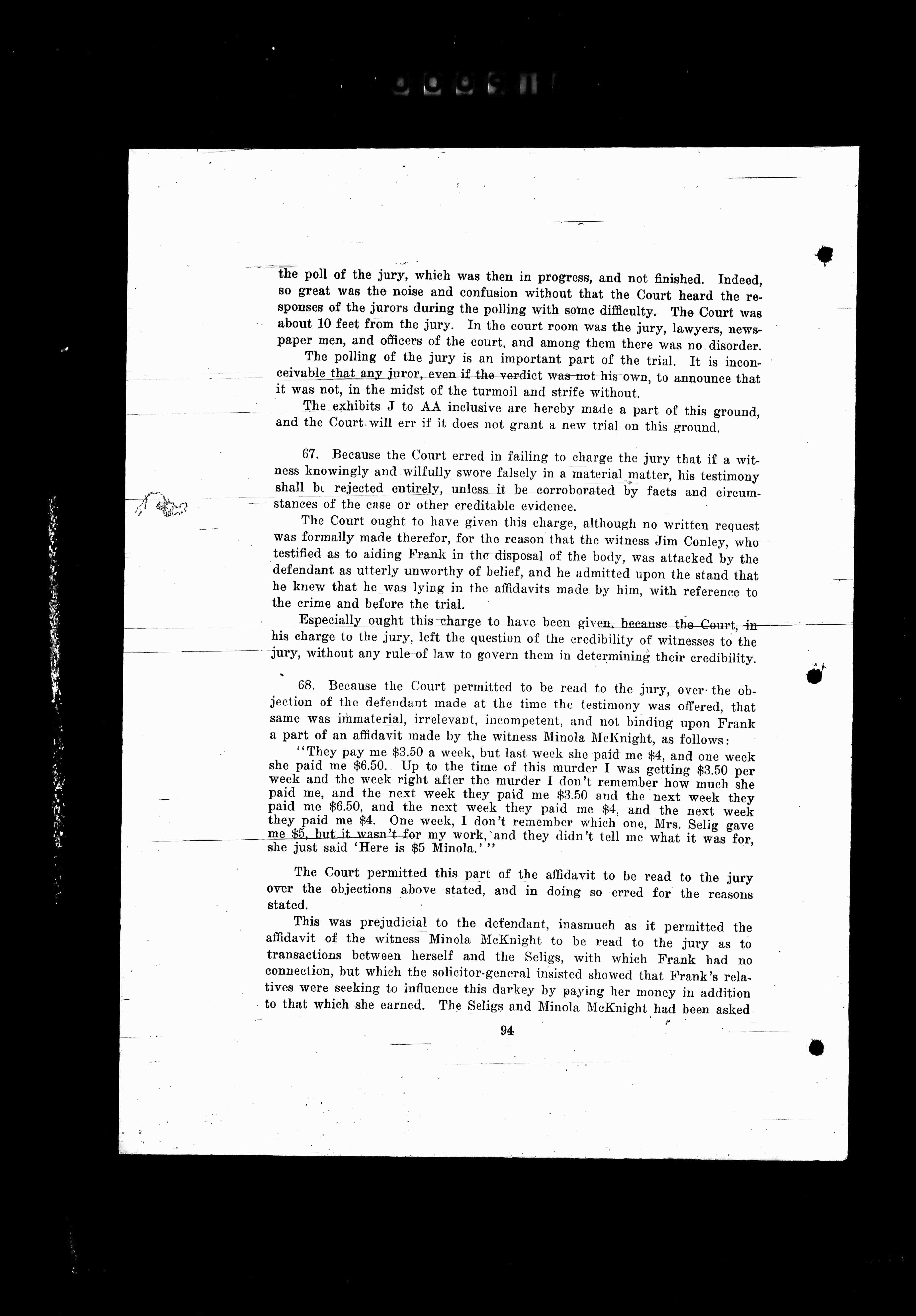 68. Because the Court permitted to be read to the jury, over the objection of the defendant made at the time the testimony was offered, that same was immaterial, irrelevant, incompetent, and not binding upon Frank a part of an affidavit made by the witness Minola McKnight, as follows: