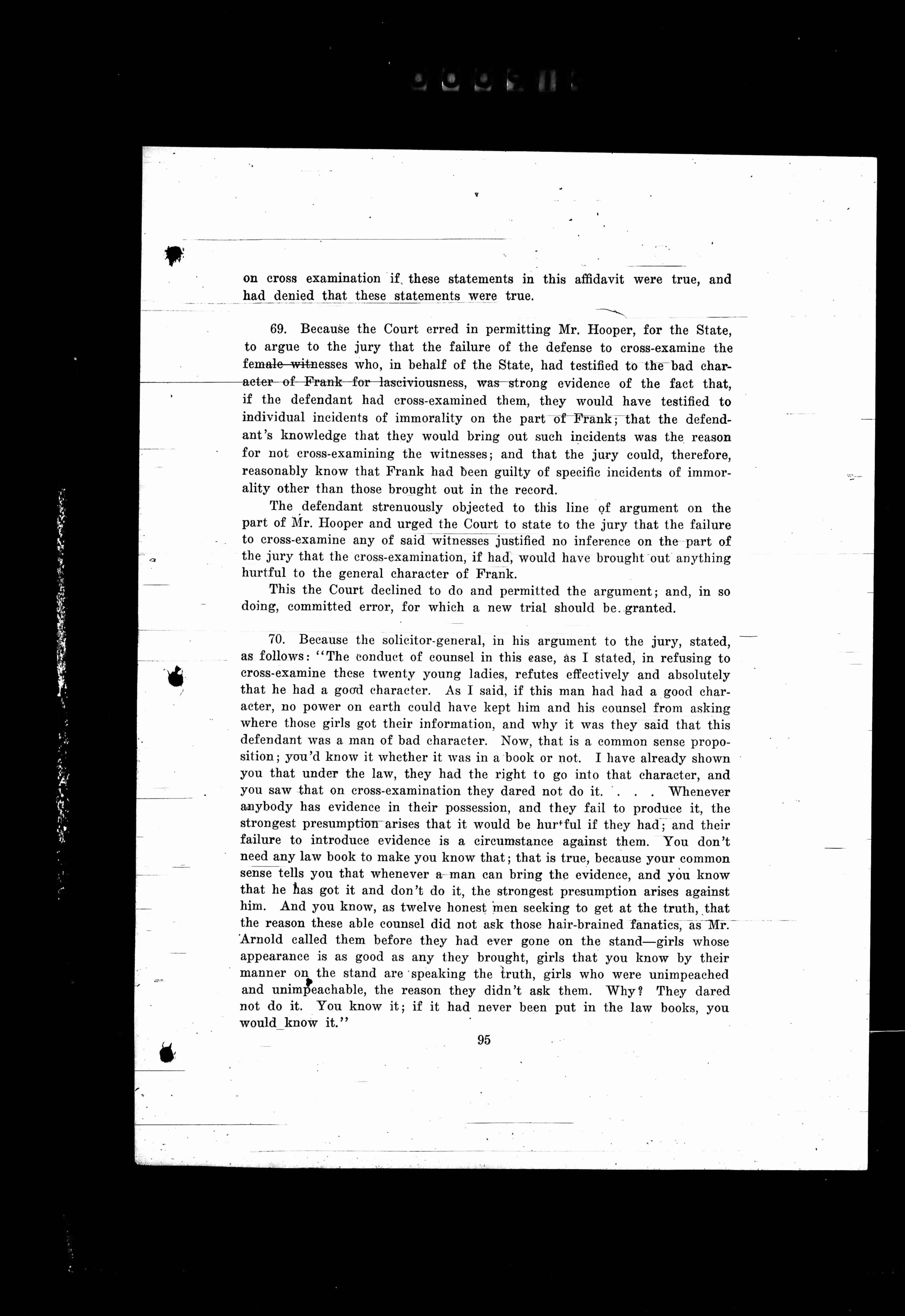69. Because the Court erred in permitting Mr. Hooper, for the State, to argue to the jury that the failure of the defense to cross-examine the female witnesses who, in behalf of the State, had testified to the bad character of Frank for lasciviousness, was strong evidence of the fact that, if the defendant had cross-examined them, they would have testified to individual incidents of immorality on the part of Frank; that the defendant's knowledge that they would bring out such incidents was the reason for not cross-examining the witnesses; and that the jury could, therefore, reasonably know that Frank had been guilty of specific incidents of immorality other than those brought out in the record.