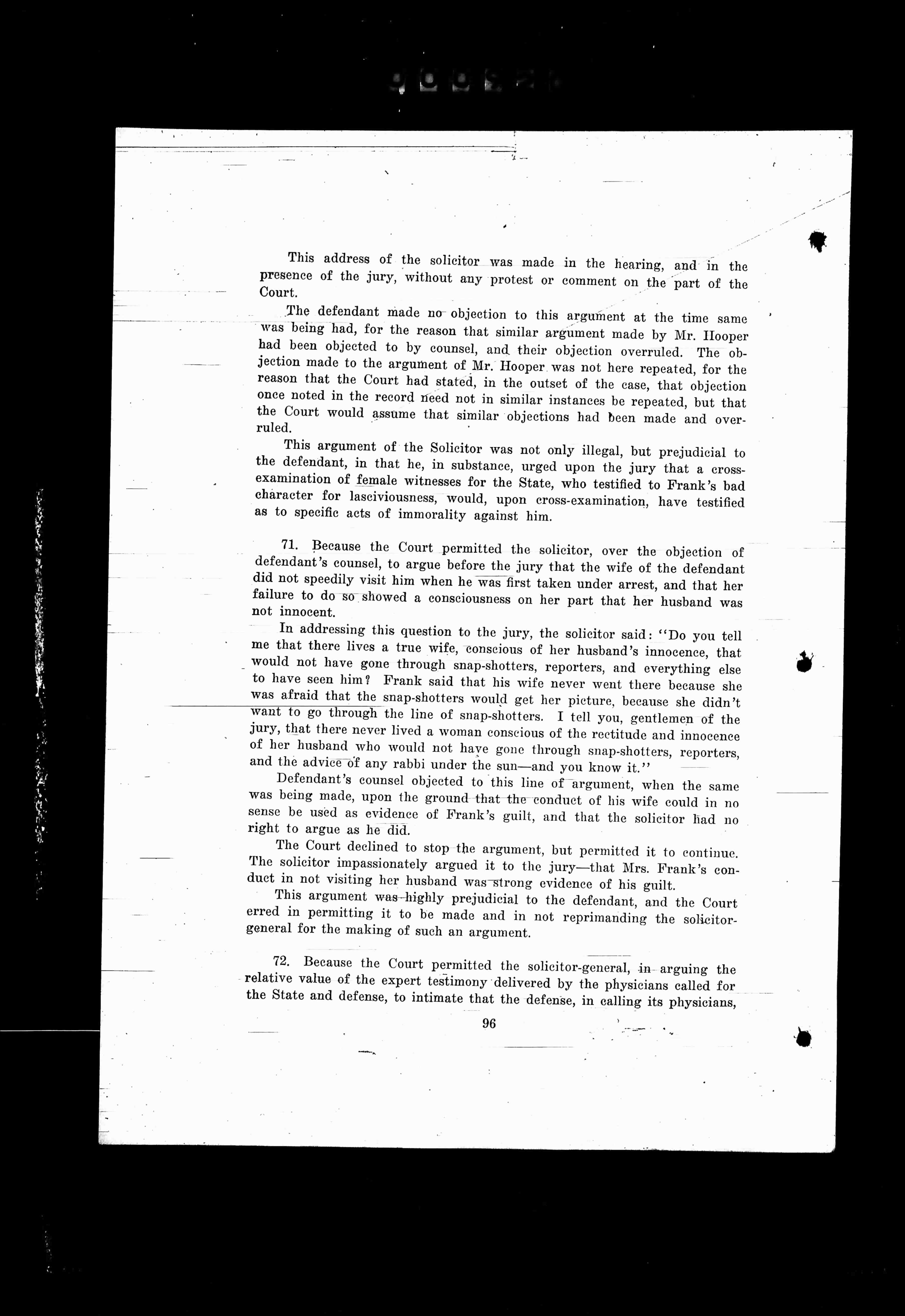 The Court declined to stop the argument, but permitted it to continue. The solicitor impassionately argued it to the jury—that Mrs. Frank's conduct in not visiting her husband was strong evidence of his guilt.