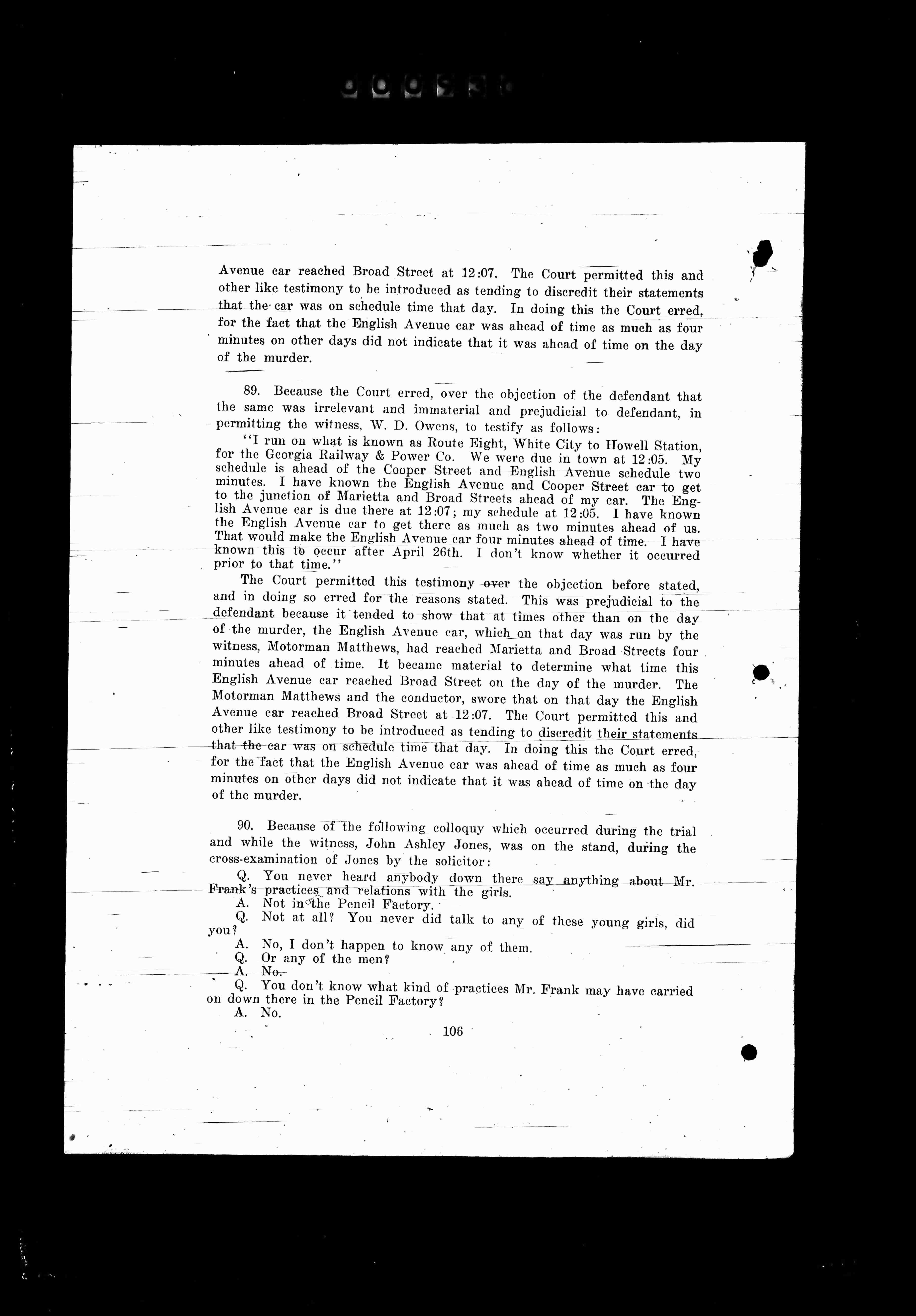 The Court permitted this testimony over the objection before stated, and in doing so erred for the reasons stated. This was prejudicial to the defendant because it tended to show that at times other than on the day of the murder, the English Avenue car, which on that day was run by the witness, Motorman Matthews, had reached Marietta and Broad Streets four minutes ahead of time. It became material to determine what time this English Avenue car reached Broad Street on the day of the murder. The Motorman Matthews and the conductor, swore that on that day the English Avenue car reached Broad Street at 12:07. The Court permitted this and other like testimony to be introduced as tending to discredit their statements that the car was on schedule time that day. In doing this the Court erred, for the fact that the English Avenue car was ahead of time as much as four minutes on other days did not indicate that it was ahead of time on the day of the murder.