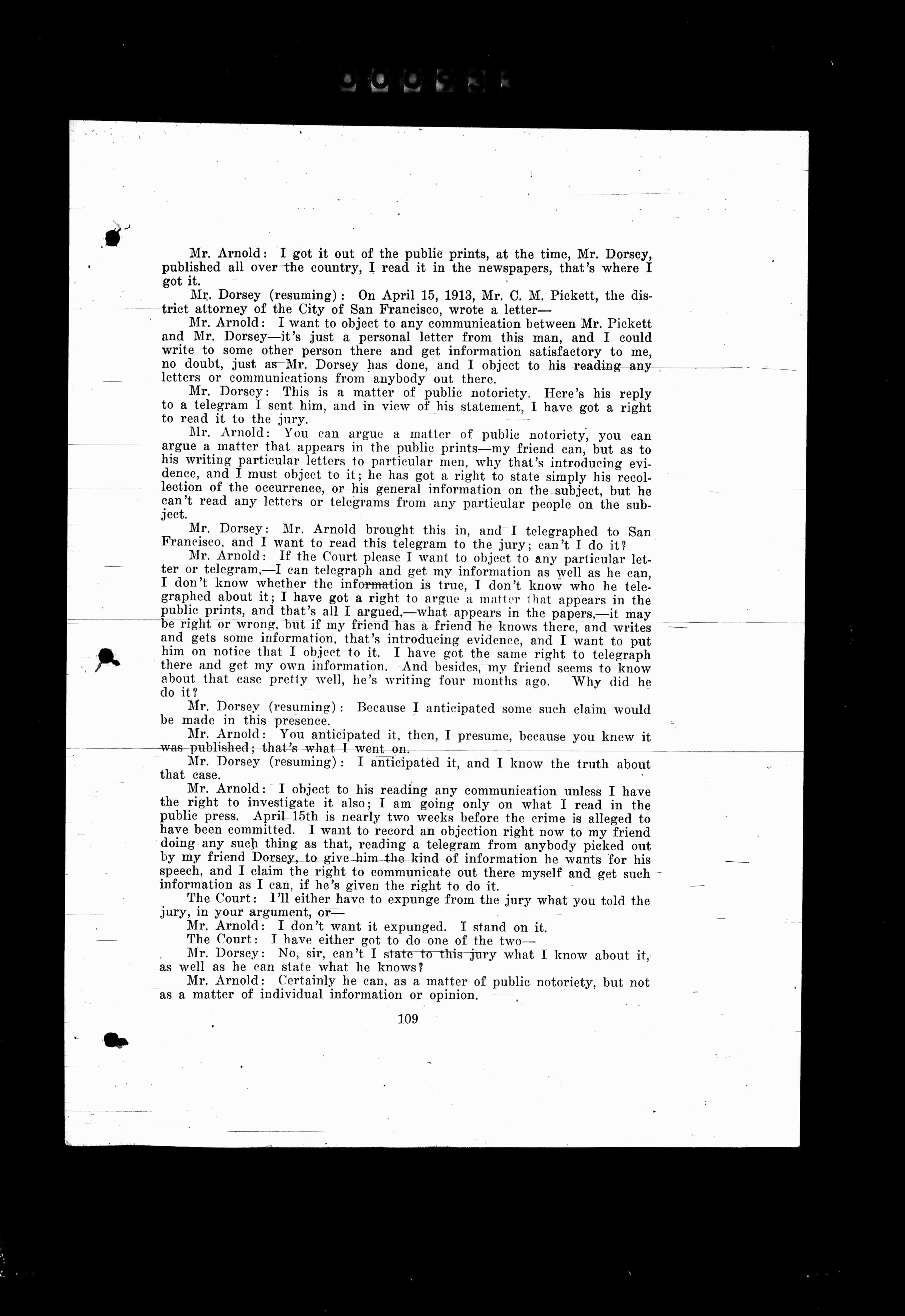 Mr. Dorsey (resuming): On April 15, 1913, Mr. C. M. Pickett, the district attorney of the City of San Francisco, wrote a letter—Mr. Pickett and Mr. Arnold. I want to object to any communication between Mr. Pickett and Mr. Dorsey—it's just a personal letter from one man, and I could write to some other person there and get fifty just as satisfactory to me, no doubt, just as Mr. Dorsey has done, and I object to his reading any letters or communication from anybody else there.