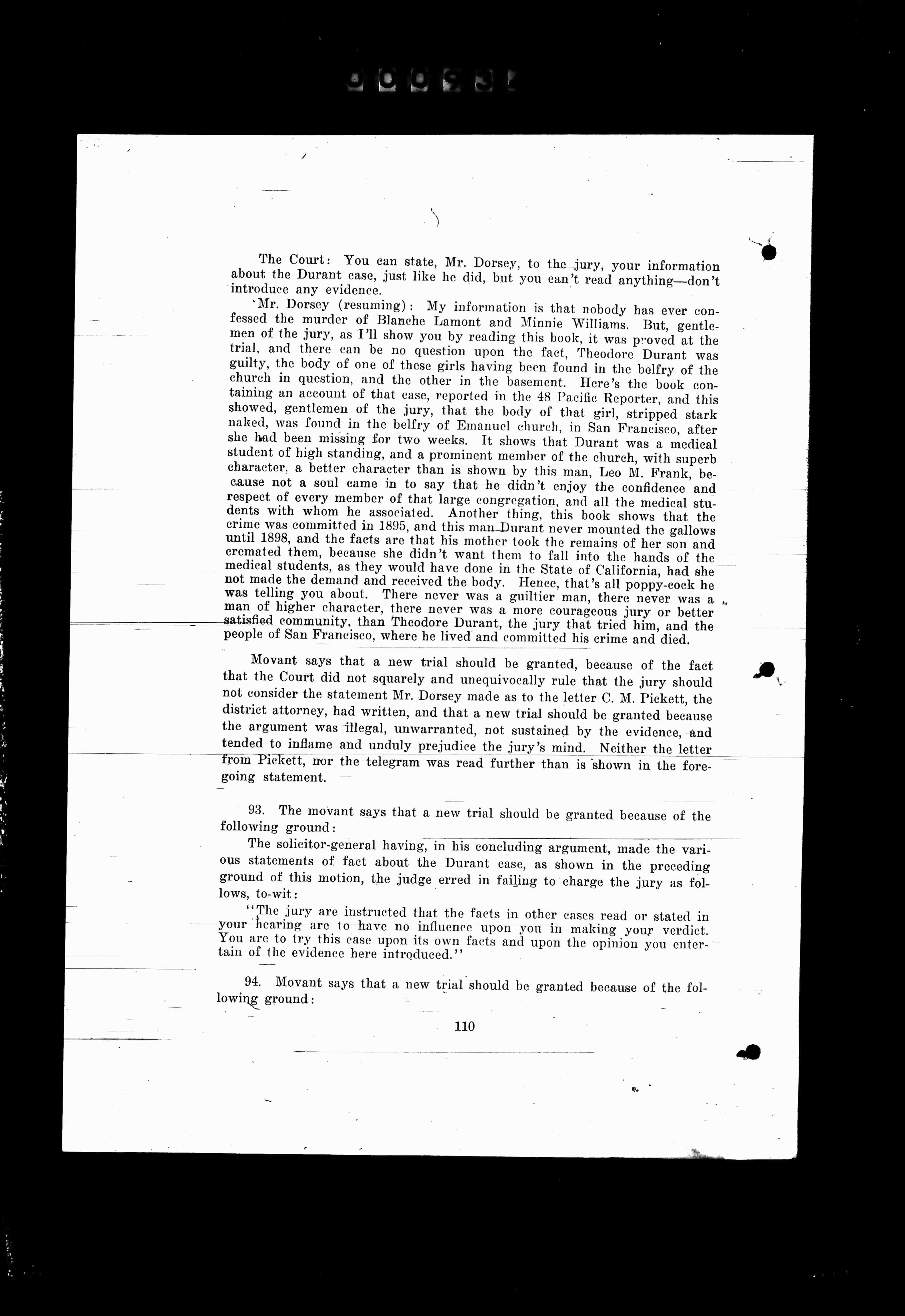 Mr. Dorsey (resuming): My information is that nobody has ever confessed the murder of Blanche Lamont and Minnie Williams. But, gentlemen of the jury, as I’ll show you by reading this book, it was proved at the trial, and there can be no question about the fact, Theodore Durant was guilty, the body of one of these girls had been found in the belfry of the church in question, and the other in the basement. Here’s the book containing an account of that case, reported in the 48 Pacific Reporter, and this showed, gentlemen of the jury, that the body of that girl, stripped stark naked, was found in the belfry of Emanuel church, in San Francisco, after she had been missing for two weeks. It shows that Durant was a medical student of high standing and a prominent member of the church, with superb character; a better character than is shown by this man, Leo M. Frank, because not a soul came in to say that he didn’t enjoy the confidence and respect of every member of that large congregation, and all the medical students with whom he associated. Another thing, this book shows that the crime was committed in 1895, and that his man Durant never mounted the gallows until 1898, and the facts are that his mother took the remains of her son and cremated them, because she didn’t want them to fall into the hands of the medical students, as they would have done in the State of California, had she not made the demand and received the body. Hence, that’s all poppy-cock he was telling you about. There never was a guiltier man, there never was a man of higher character, there never was a more courageous jury or better satisfied community, than Theodore Durant, the jury that tried him, and the people of San Francisco, where he lived and committed his crime and died.