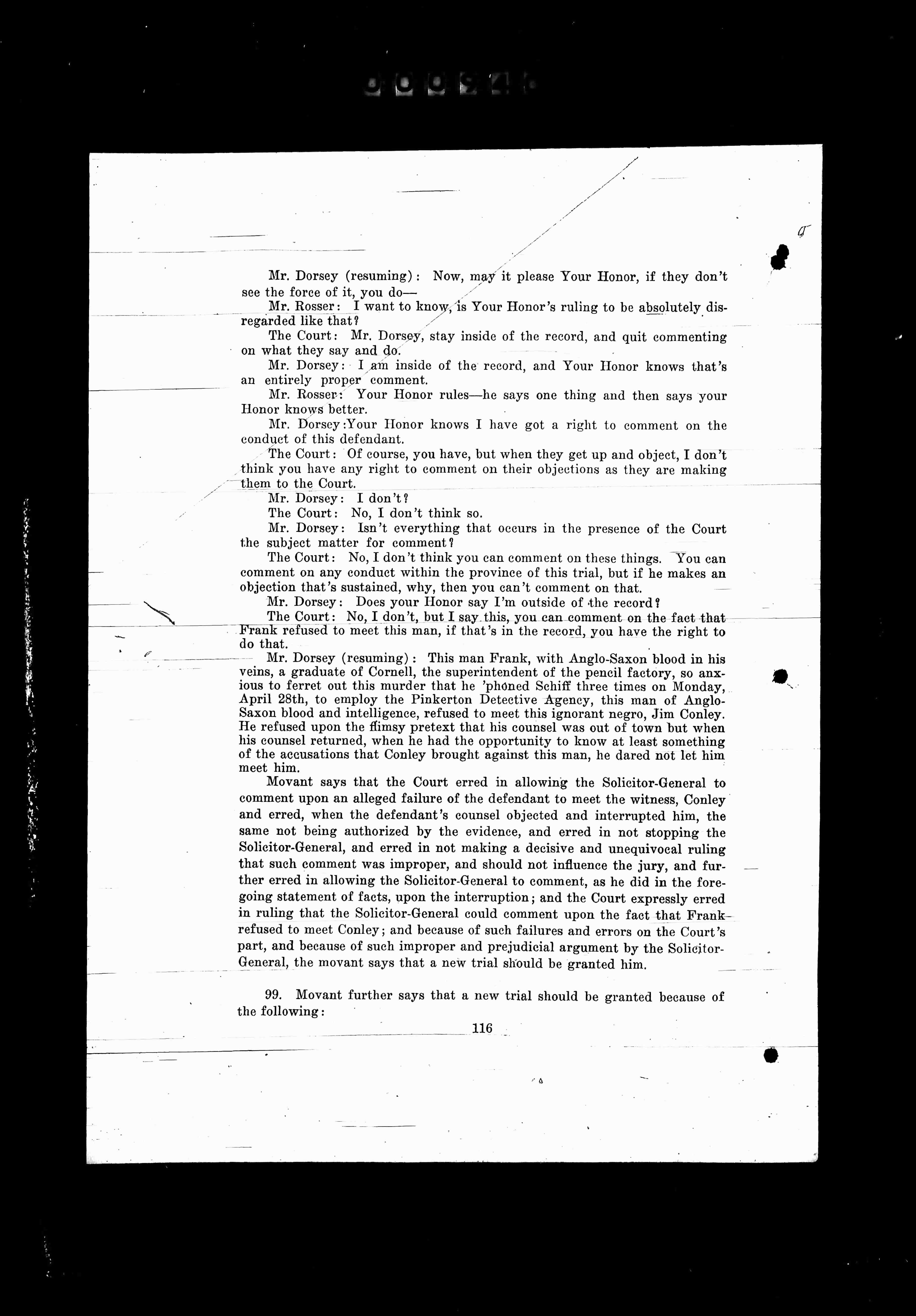Mr. Dorsey (resuming): This man Frank, with Anglo-Saxon blood in his veins, a graduate of Cornell, the superintendent of the pencil factory, so anxious to ferret out this murder that he 'phoned Schiff three times on Monday, April 28th, to employ the Pinkerton Detective Agency, this man of Anglo-Saxon blood and intelligence, refused to meet this ignorant negro, Jim Conley. He refused upon the flimsy pretext that his counsel was out of town but when his counsel returned, when he had the opportunity to know at least something of the accusations that Conley brought against this man, he dared not let him meet him.
