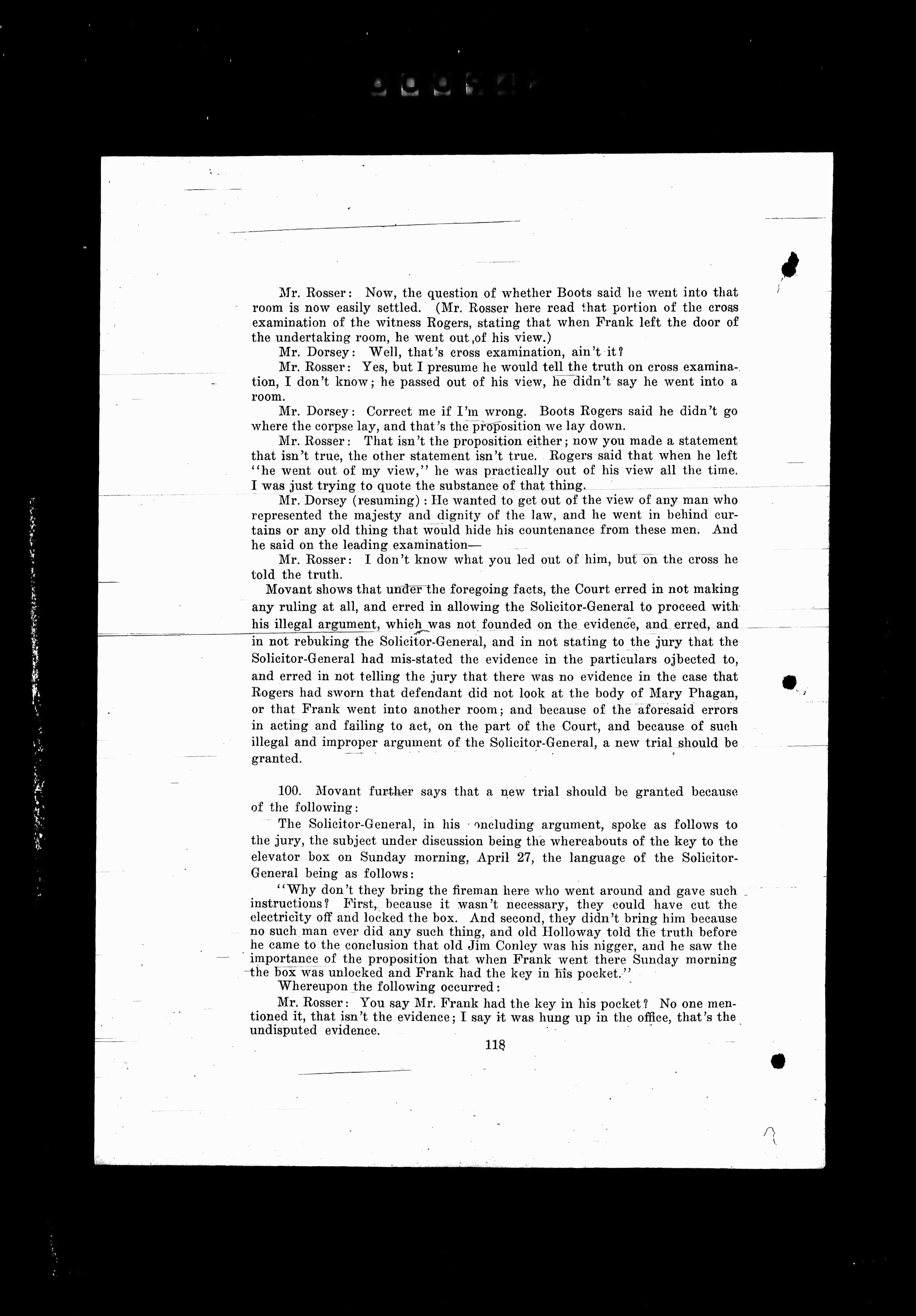 "Why don't they bring the fireman here who went around and gave such instructions? First, because it wasn't necessary, they could have cut the electricity off and locked the box. And second, they didn't bring him because no such man ever did any such thing, and old Holloway told the truth before he came to the conclusion that old Jim Conley was his nigger, and he saw the importance of the proposition that when Frank went there Sunday morning the box was unlocked and Frank had the key in his pocket."