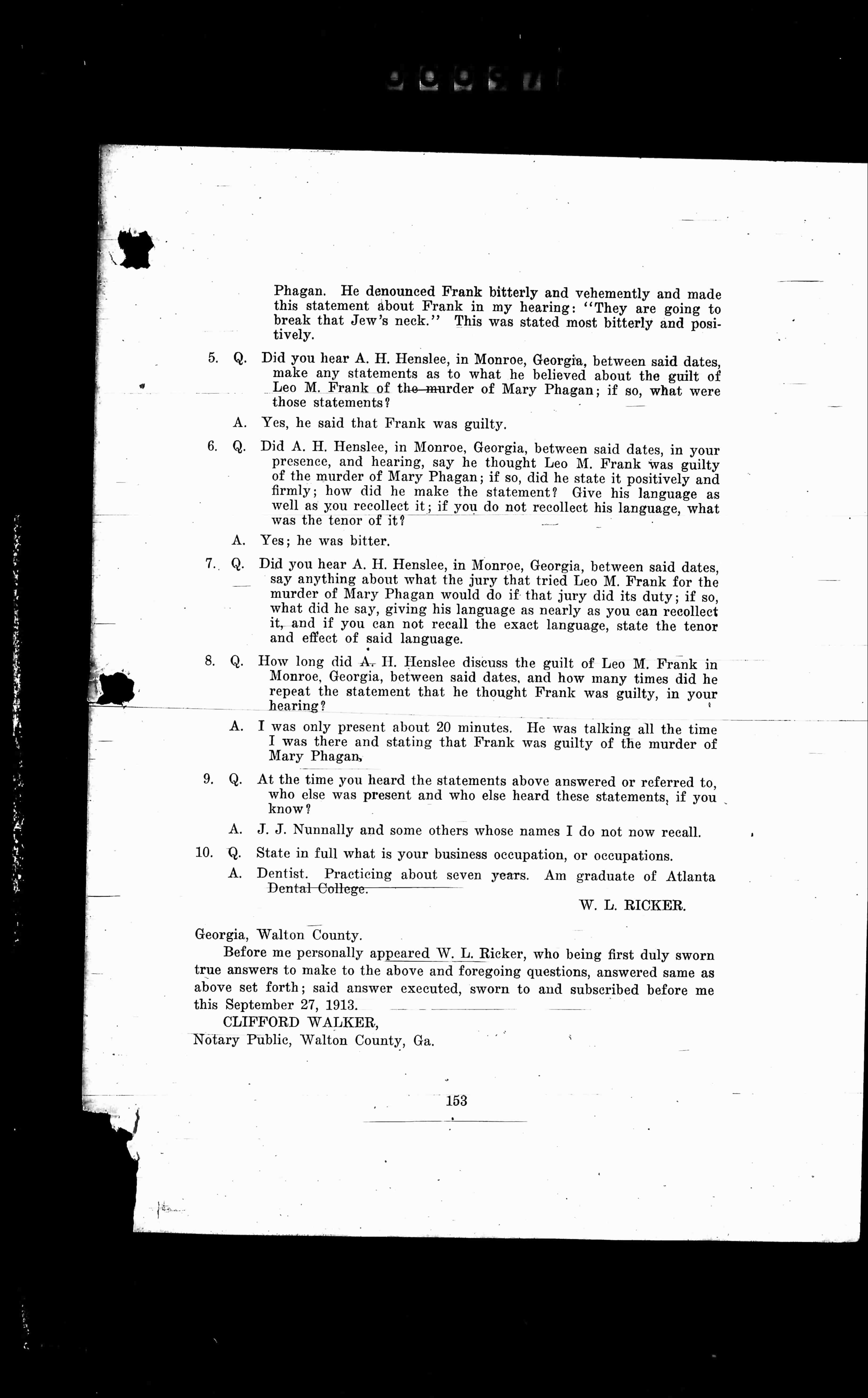 5. Q. Did you hear A. H. Henselee, in Monroe, Georgia, between said dates, make any statements as to what he believed about the guilt of Leo M. Frank of the murder of Mary Phagan; if so, what were those statements?