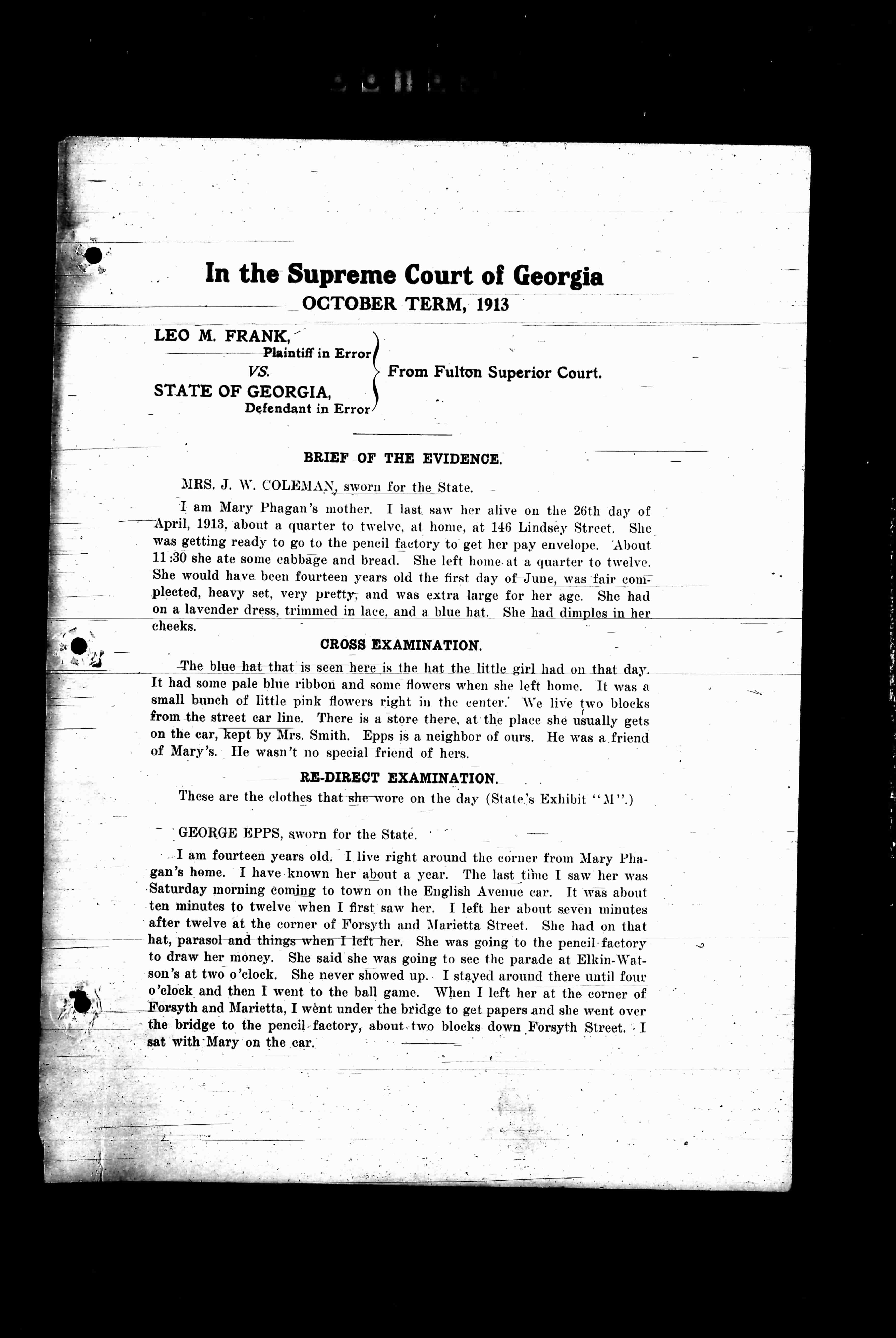 I am fourteen years old. I live right around the corner from Mary Phagan's home. I have known her about a year. The last time I saw her was Saturday morning coming to town on the English Avenue car. It was about ten minutes to twelve when I first saw her. I left her about seven minutes after twelve at the corner of Forsyth and Marietta Street. She had on that hat, parasol and things when I left her. She was going to the pencil factory to draw her money. She said she was going to see the parade at Elkin-Wat. son's at two o'clock. She never showed up. I stayed around there until four o'clock and then I went to the ball game. When I left her at the corner of Forsyth and Marietta, I went under the bridge to get papers and she went over the bridge to the pencil factory, about two blocks down Forsyth Street. I sat with Mary on the car.