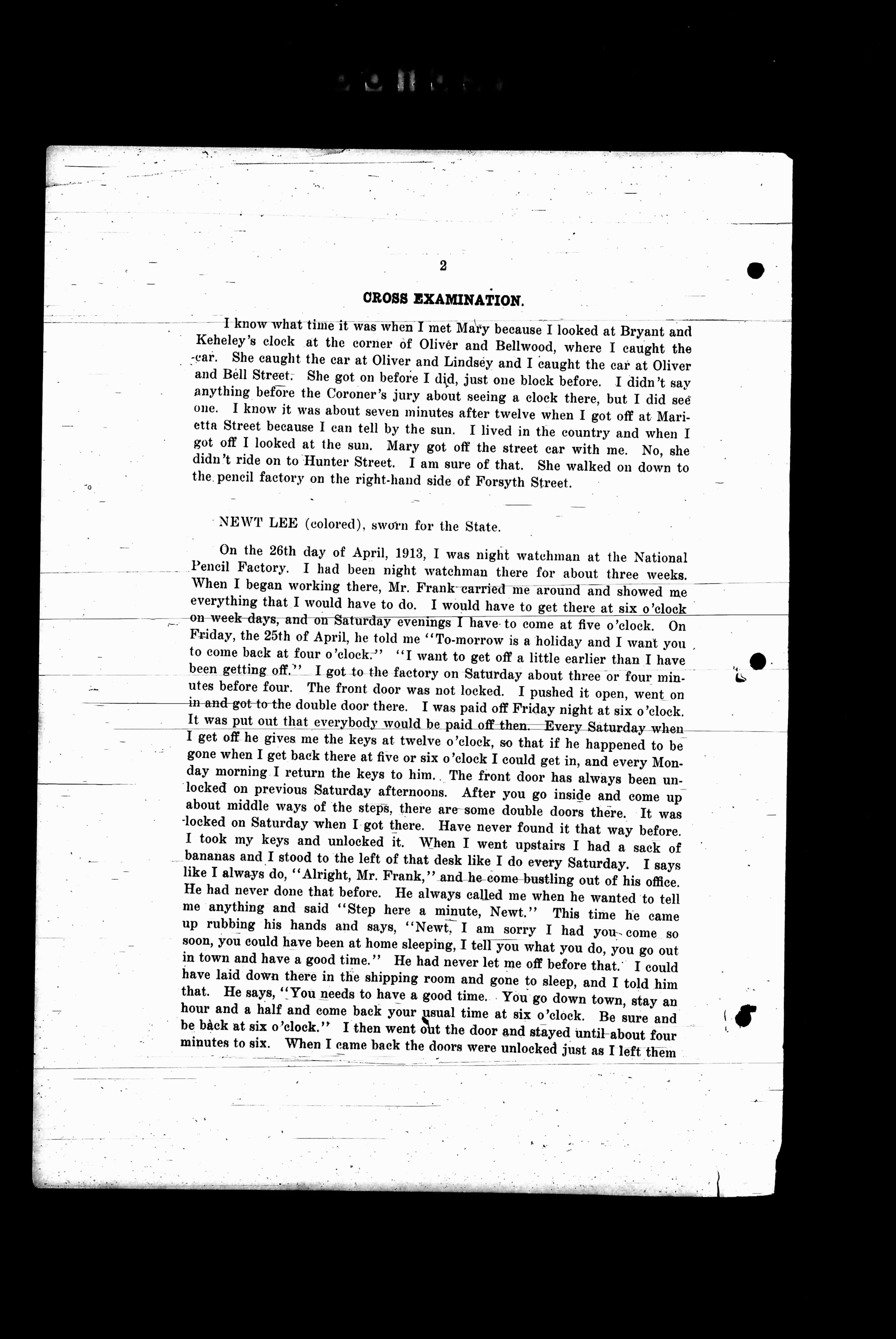 On the 26th day of April, 1913, I was night watchman at the National Pencil Factory. I had been night watchman there for about three weeks. When I began working there, Mr. Frank carried me around and showed me everything that I would have to do. I would have to get there at six o'clock on week-days, and on Saturday evenings I have to come at five o'clock. On Friday, the 25th of April, he told me "To-morrow is a holiday and I want you to come back at four o'clock." I want to get off a little earlier than I have been getting off." I got to the factory on Saturday about three or four minutes before four. The front door was not locked. I pushed it open, went on in and got to the double door there. I was paid off Friday night at six o'clock. It was put out that everybody would be paid off then. Every Saturday when I get off he gives me the keys at twelve o'clock, so that if he happened to be gone when I get back there at five or six o'clock I could get in, and every Monday morning I return the keys to him. The front door has always been unlocked on previous Saturday afternoons. After you go inside and come up about middle ways of the steps, there are some double doors there. It was locked on Saturday when I got there. I have some keys that I had before. I took my keys and unlocked it. When I went upstairs I had a sack of bananas and I stood to the left of that desk like I do every Saturday. I says like I always do, "Alright, Mr. Frank," and he come bustling out of his office. He had never done that before. He always called me when he wanted to tell me anything and said "Step here a minute, Newt." This time he came up rubbing his hands and says, "Newt, I am sorry I had you come so soon, you could have been at home sleeping, I tell you what you do, you go out in town and have a good time." He had never let me off before that. I could have laid down there in the shipping room and gone to sleep, and I told him that. He says, "You needs to have a good time. You go down town, stay an hour and a half and come back your meal time at six o'clock. Be sure and be back at six o'clock." I then went out the door and stayed until about four minutes to six. When I came back the doors were unlocked just as I left them