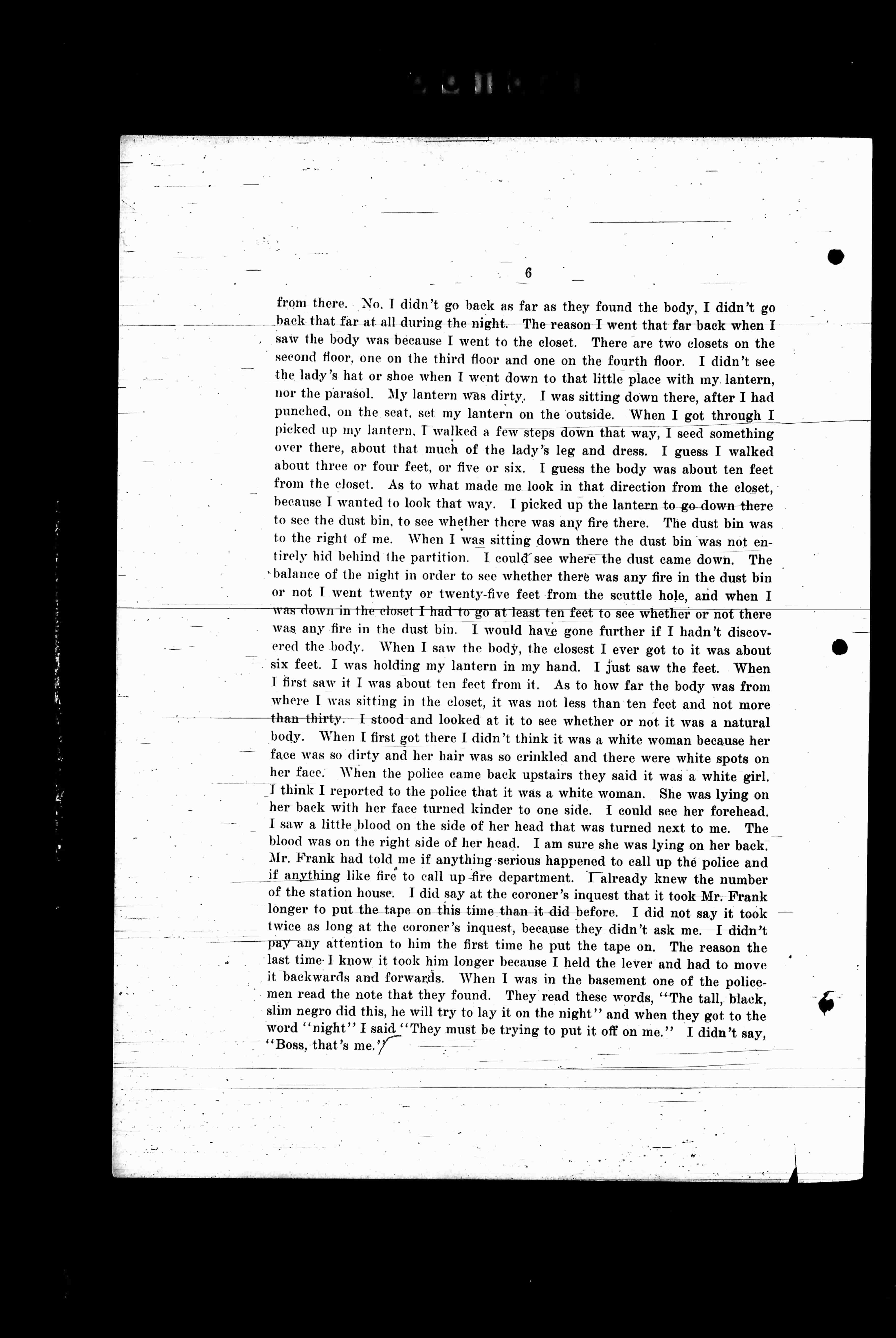 from there. No. I didn't go back as far as they found the body. I didn't go back that far at all during the night - The reason I went that far back when I saw the body was because I was after the closet. There are two closets on the second floor, one on the third floor and one on the fourth floor. I didn't see the lady's hat or shoe when I went down to that little place with my lantern, nor the parasol. My lantern was dirty. I was sitting down there, after I had punched, on the seat, set my lantern on the outside. When I got through I picked up my lantern. I walked a few steps down that way. I seed something over there, about that much of the lady's leg and dress. I guess I walked about three or four feet, or five or six. I guess the body was about ten feet from the closet. As to what made me look in that direction from the closet, because I wanted to look that way. I picked up the lantern-to go-down-there to see the dust bin, to see whether there was any fire there. The dust bin was to the right of me. When I was sitting down there the dust bin was not entirely hid behind the partition. I could see where the dust came down. The balance of the night in order to see whether there was any fire in the dust bin or not I went twenty or twenty-five feet from the scuttle hole, and when I was down in the closet I had to go at least ten feet to see whether or not there was any fire in the dust bin. I would have gone further if I hadn't discovered the body. When I saw the body, the closest I ever got to it was about six feet. I was holding my lantern in my hand. I just saw the feet. When I first saw it I was about ten feet from it. As to how far the body was from where I was sitting in the closet, it was not less than ten feet and not more than thirty - I stood and looked at it to see whether or not it was a natural body. When I first got there I didn't think it was a white woman because her face was so dirty and her hair was so crinkled and there were white spots on her face. When the police came back upstairs they said it was a white girl. I think I reported to the police that it was a white woman. She was lying on her back with her face turned kinder to one side. I could see her forehead. I saw a little blood on the side of her head that was turned next to me. The blood was on the right side of her head. I am sure she was lying on her back. Mr. Frank had told me if anything serious happened to call up the police and if anything like fire to call up fire department. I already knew the number of the station house. I did say at the coroner's inquest that it took Mr. Frank longer to put the tape on his time than it did before. I did not say it took twice as long at the coroner's inquest, because they didn't ask me. I didn't pay any attention to him the first time he put the tape on. The reason the last time I know it took him longer because I held the lever and had to move it backwards and forwards. When I was in the basement one of the policemen read the note that they found. They read these words, "The tall, black, slim negro did this, he will try to lay it on the night" and when they got to the word "night" I said "They must be trying to put it off on me." I didn't say, "Boss, that's me."