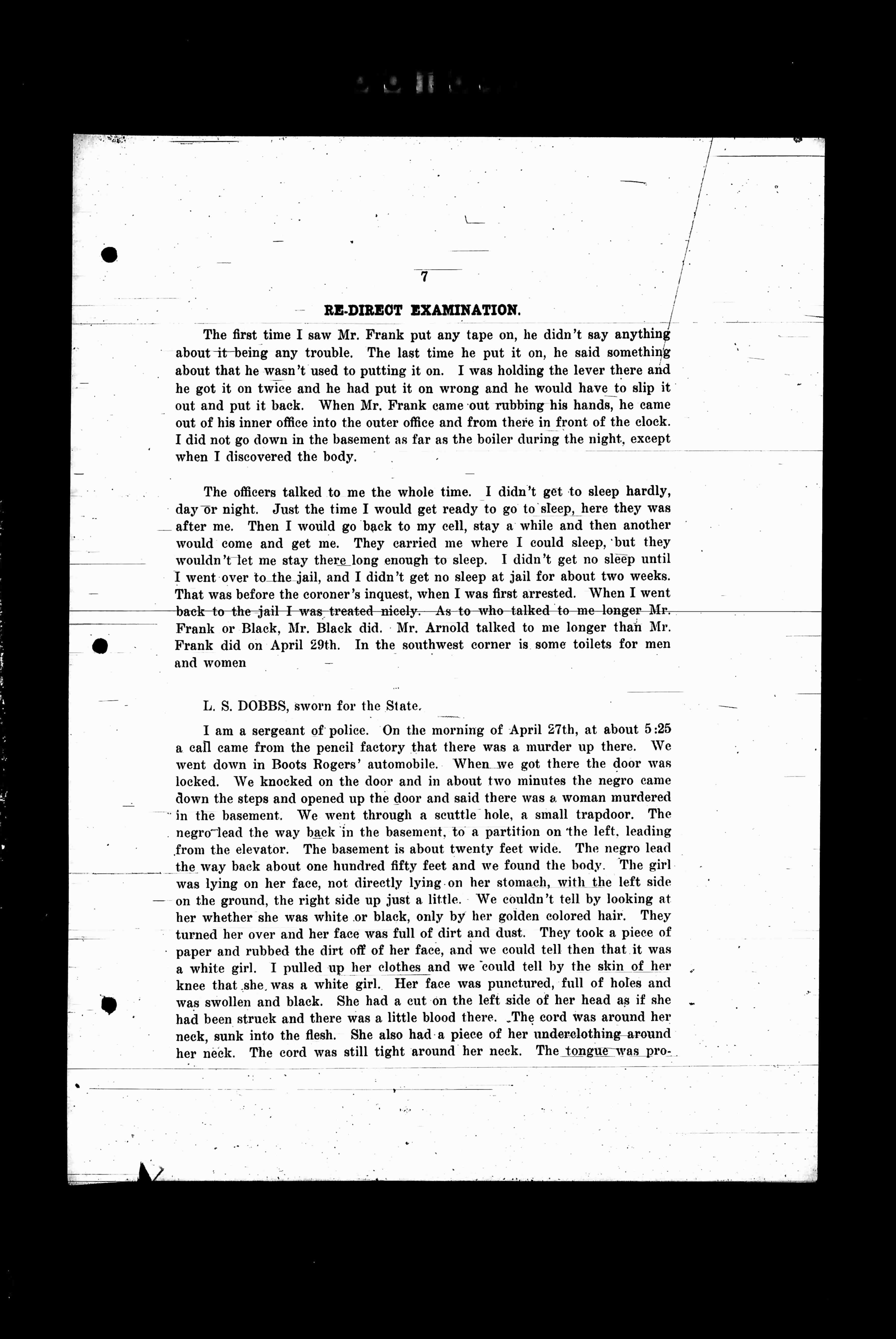 I am a sergeant of police. On the morning of April 27th, at about 5:25 a call came from the pencil factory that there was a murder up there. We went down in Boots Rogers' automobile. When we got there the door was locked. We knocked on the door and in about two minutes the negro came down the steps and opened up the door and said there was a woman murdered in the basement. We went through a scuttle hole, a small trapdoor. The negro-lead the way back in the basement, to the location on the left, leading from the elevator. The basement is about twenty feet wide. The negro lead the way back about one hundred fifty feet and we found the body. The girl was lying on her face, not directly lying on her stomach, with the left side on the ground, the right side up just a little. We couldn't tell by looking at her whether she was white or black, only by her golden colored hair. They turned her over and her face was full of dirt and dust. They took a piece of paper and rubbed the dirt off of her face, and we could tell then that it was a white girl. I pulled up her clothes and we could tell by the skin of her knee that she was a white girl. Her face was punctured, full of holes and was swollen and black. She had a cut on the left side of her head as if she had been struck and there was a little blood there. The cord was around her neck, sunk into the flesh. She also had a piece of her underclothing around her neck. The cord was still tight around her neck. The tongue was pro-