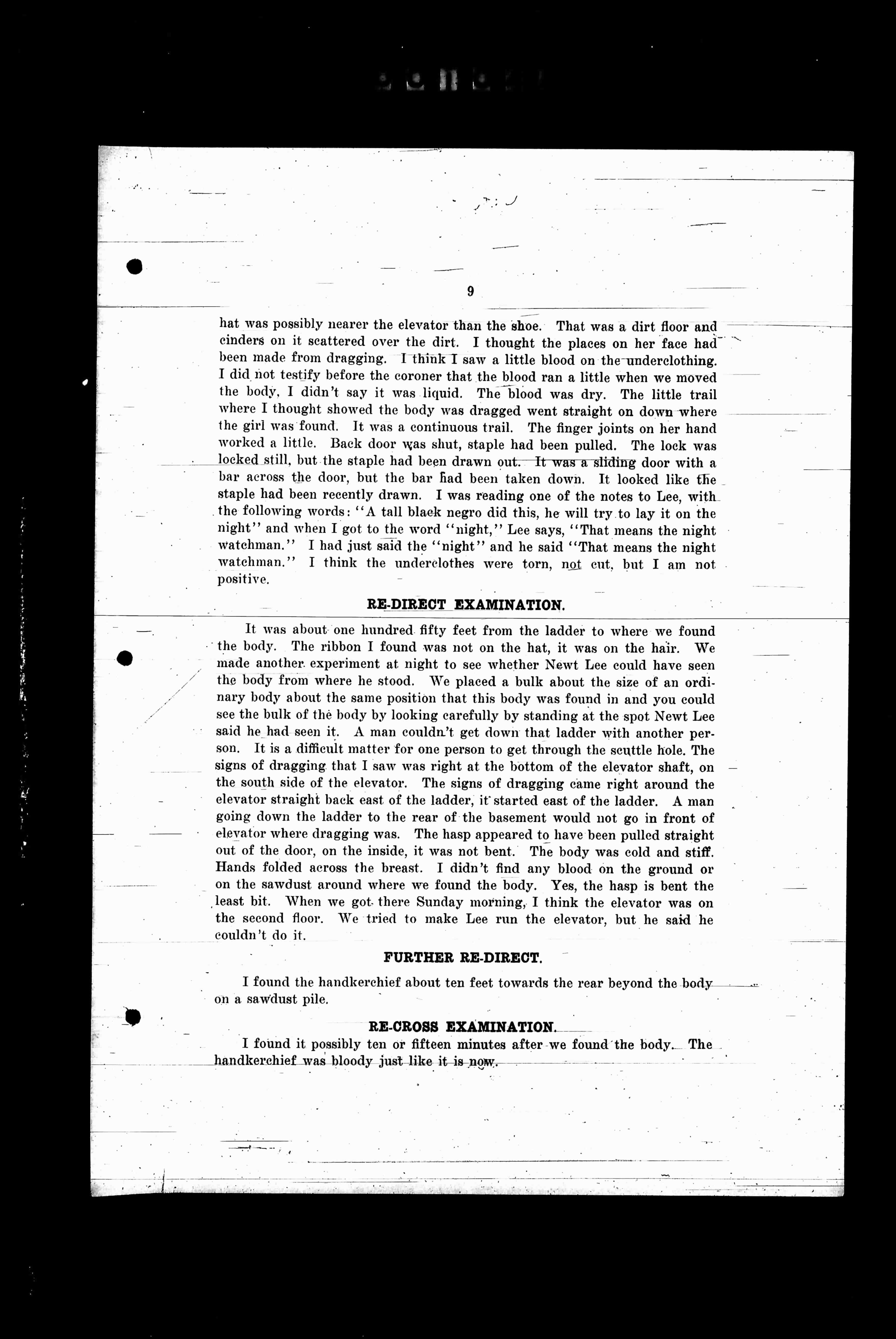 hat was possibly nearer the elevator than the shoe. That was a dirt floor and cinders on it scattered over the dirt. I thought the places on her face had been made from dragging. I think I saw little blood on the underclothing. I did not testify before the coroner that the blood ran a little when we moved the body. I didn't say it was liquid. The blood was dry. The little trail where I thought showed the body was dragged went straight on down where the girl was found. It was a continuous trail. The finger joints on her hand worked a little. Back door was shut, staple had been pulled. The lock was locked still, but the staple had been drawn out. It was a sliding door with a bar across the door, but the bar had been taken down. It looked like the staple had been recently drawn. I was reading one of the notes to Lee, with the following words: "A tall black negro did this, he will try to lay it on the night" and when I got to the word "night", Lee says, "That means the night watchman." I had just said the "night" and he said "That means the night watchman." I think the underclothes were torn, not cut, but I am not positive.