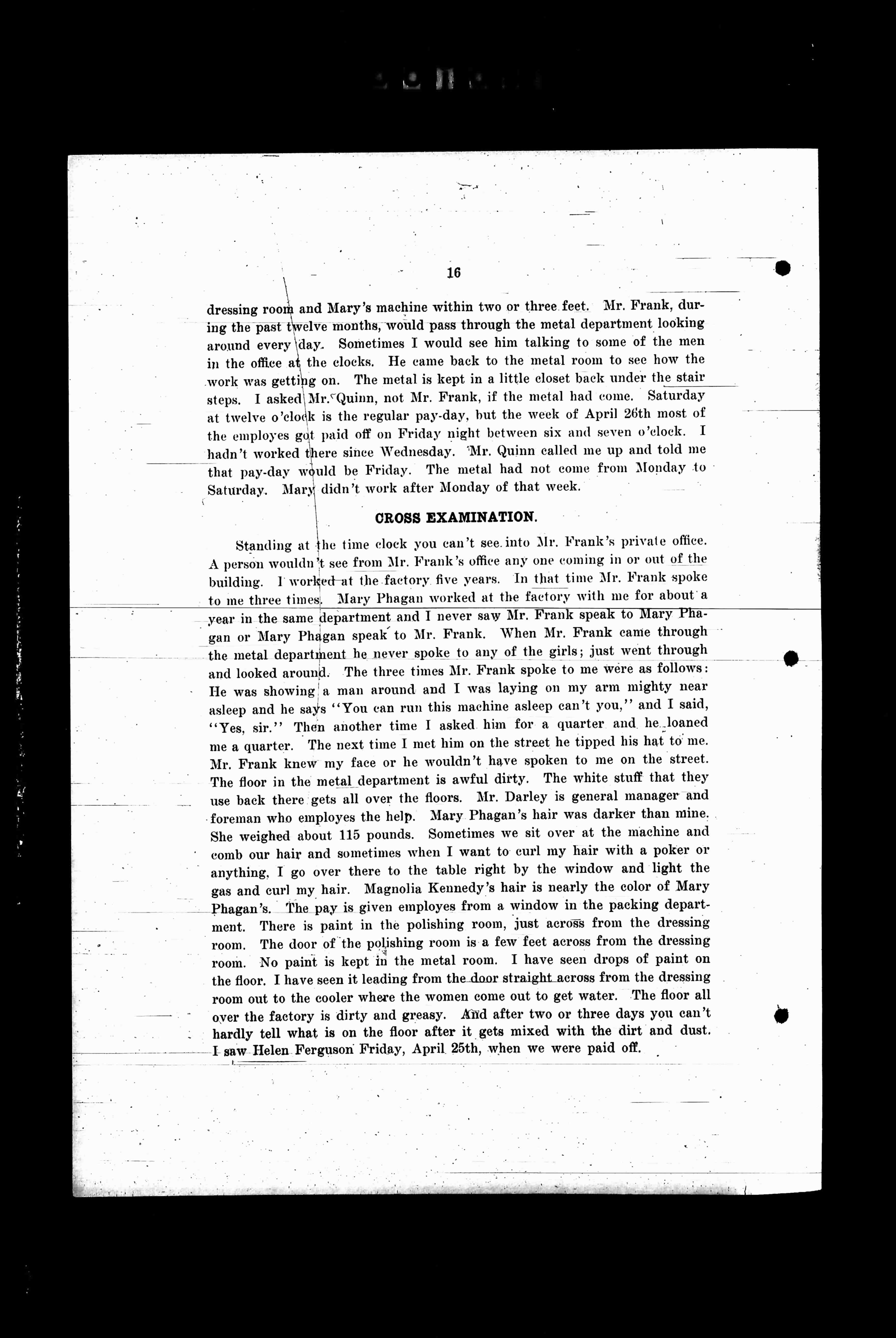 Standing at the time clock you can't see into Mr. Frank's private office. A person wouldn't see from Mr. Frank's office any one coming in or out of the building. I worked at the factory five years. In that time Mr. Frank spoke to me three times. Mary Phagan worked at the factory with me for about a year in the same department and I never saw Mr. Frank speak to Mary Phagan or Mary Phagan speak to Mr. Frank. When Mr. Frank came through the metal department he never spoke to any of the girls; just went through and looked around. The three times Mr. Frank spoke to me were as follows: He was showing a man around and I was laying on my arm mighty near asleep and he says "You can run this machine asleep can't you," and I said, "Yes, sir." Then another time I asked him for a quarter and he loaned me a quarter. The next time I met him on the street he tipped his hat to me. Mr. Frank knew my face or he wouldn't have spoken to me on the street. The floor in the metal department is awful dirty. The white stuff that they use back there gets all over the floors. Mr. Darley is general manager and foreman who employs the help. Mary Phagan's hair was darker than mine. She weighed about 115 pounds. Some days we sit over at the machine and comb our hair and sometimes when I want to curl my hair with a poker or anything, I go over there to the table right by the window and light the gas and curl my hair. Magnolia Kennedy's hair is nearly the color of Mary Phagan's. The pay is given employees from a window in the packing department. There is paint in the polishing room, just across from the dressing room. The door of the polishing room is a few feet across from the dressing room. No paint is kept in the metal room. I have seen drops of paint on the floor. I have seen it leading from the door straight across from the dressing room out to the cooler where the women come out to get water. The floor all over the factory is dirty and greasy. And after two or three days you can't hardly tell what is on the floor after it gets mixed with the dirt and dust. I saw Helen Ferguson Friday, April 25th, when we were paid off.