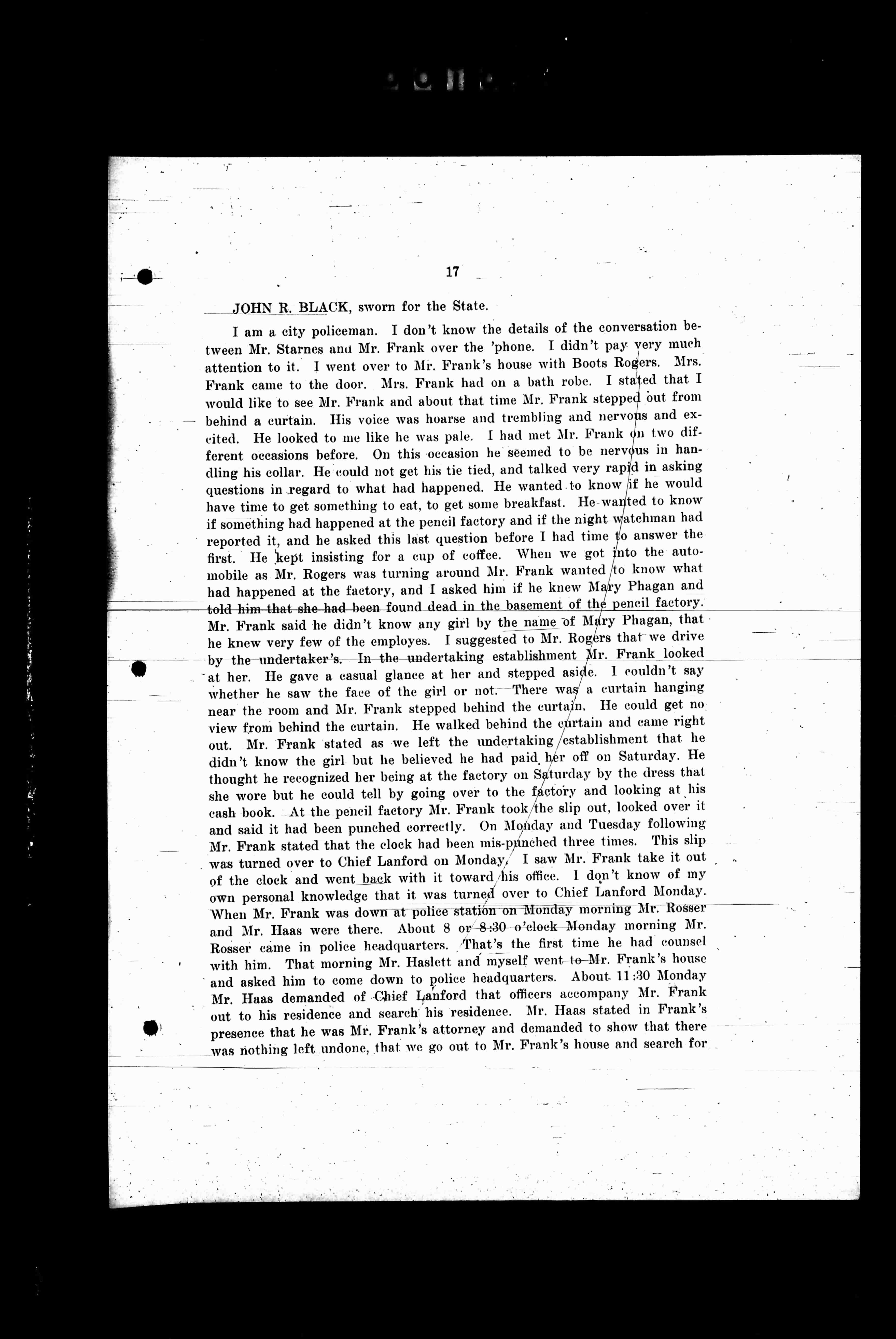 I am a city policeman. I don't know the details of the conversation between Mr. Starnes and Mr. Frank over the phone. I didn't pay very much attention to it. I went over to Mr. Frank's house with Boots Rogers. Mrs. Frank came to the door. Mrs. Frank had on a bath robe. I stated that I would like to see Mr. Frank and about that time Mr. Frank stepped out from behind a curtain. His voice was hoarse and trembling and nervous and excited. He looked to me like he was pale. I had met Mr. Frank on two different occasions before. On this occasion he seemed to be nervous in handling his collar. He could not get his tie tied, and talked very rapid in asking questions in regard to what had happened. He wanted to know if he would have time to get something to eat, to get some breakfast. He wanted to know if something had happened at the pencil factory and if the night watchman had reported it, and he asked this last question before I had time to answer the first. He kept insisting for a cup of coffee. When we got into the automobile as Mr. Rogers was turning around Mr. Frank wanted to know what had happened at the factory, and I asked him if he knew Mary Phagan and told him that she had been found dead in the basement of the pencil factory. Mr. Frank said he didn't know any girl by the name of Mary Phagan, that he knew very few of the employees. I suggested to Mr. Rogers that we drive by the undertaker's. In the undertaking establishment Mr. Frank looked at her. He gave a casual glance at her and stepped aside. I couldn't say whether he saw the face of the girl or not. There was a curtain hanging near the room and Mr. Frank stepped behind the curtain. He could get no view from behind the curtain. He walked behind the curtain and came right out. Mr. Frank stated as we left the undertaking establishment that he didn't know the girl but he believed he had paid her off on Saturday. He thought he recognized her being at the factory on Saturday by the dress that she wore but he could tell by going over to the factory and looking at his cash book. At the pencil factory Mr. Frank took the slip out, looked over it and said it had been punched correctly on Monday and Tuesday following Mr. Frank stated that the clock had been unpunched three times. This slip was turned over to Chief Lanford on Monday. I saw Mr. Frank take it out of the clock and went back with it toward his office. I don't know of my own personal knowledge that it was turned over to Chief Lanford Monday. When Mr. Frank was down at police station on Monday morning Mr. Rosser and Mr. Haas were there. About 8 or 8:30 o'clock Monday morning Mr. Rosser came in police headquarters. That's the first time he had counsel with him. That morning Mr. Haslett and myself went to Mr. Frank's house and asked him to come down to police headquarters. About 11:30 Monday Mr. Haas demanded of Chief Lanford that officers accompany Mr. Frank out to his residence and search his residence. Mr. Haas stated in Frank's presence that he was Mr. Frank's attorney and demanded to show that there was nothing left undone, that we go out to Mr. Frank's house and search for