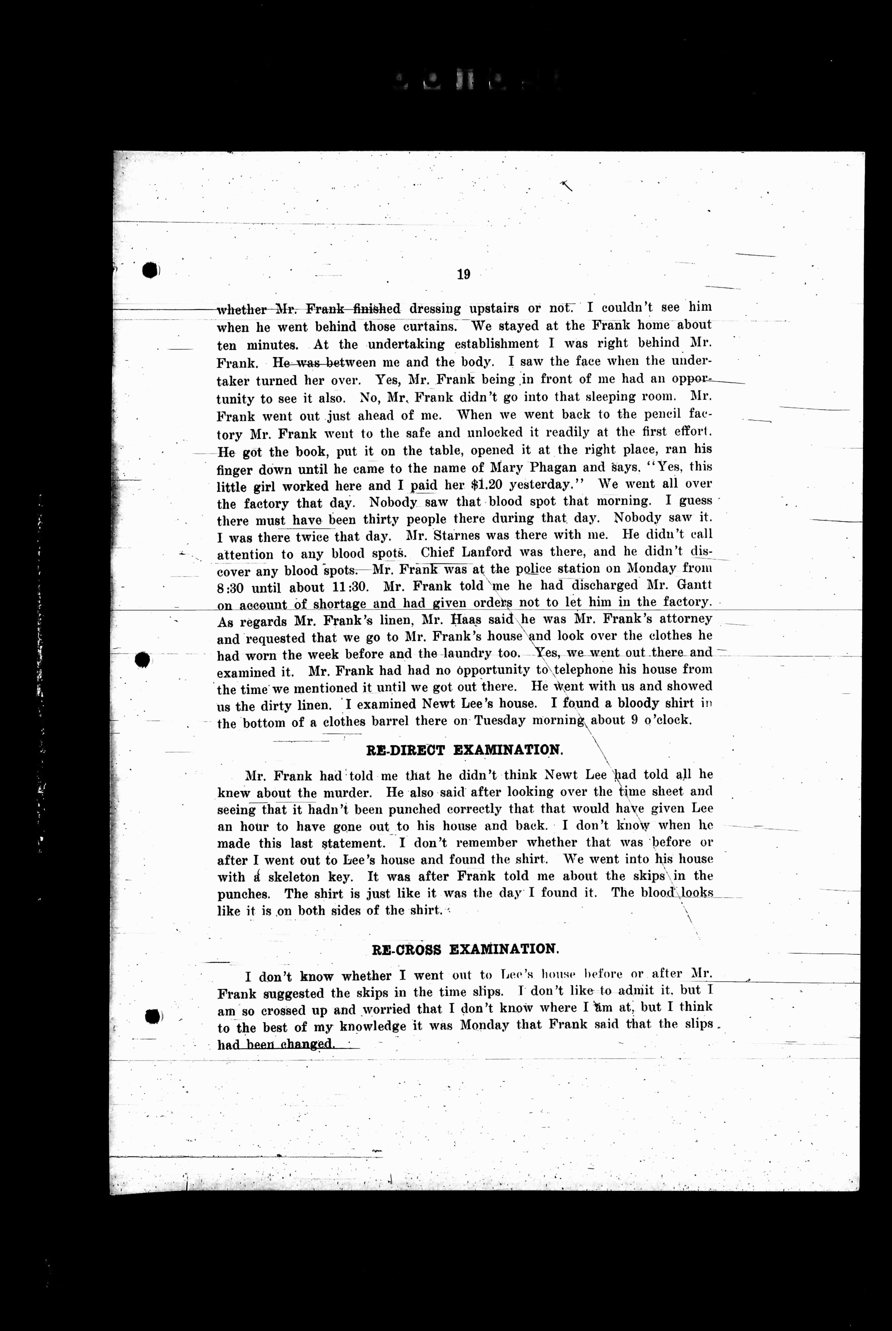 whether Mr. Frank finished dressing upstairs or not. I couldn't see him when he went behind those curtains. We stayed at the Frank home about ten minutes. At the undertaking establishment I was right behind Mr. Frank. He-was-between me and the face when I saw the face when the undertaker turned her over. Yes, Mr. Frank was in front of me had an opportunity to see it also. No, Mr. Frank didn't go into that sleeping room. Mr. Frank went out just ahead of me. When we went back to the pencil factory Mr. Frank went to the safe and unlocked it readily at the first effort. He got the book, put it on the table, opened it at the right place, ran his finger down until he came to the name of Mary Phagan and says, "Yes, this little girl worked here and I paid her $1.20 yesterday." We went all over the factory that day. Nobody saw that blood spot that morning. I guess there must have been thirty people there during that day. Nobody saw it. I was there twice that day. Mr. James was there with me. He didn't call attention to any blood spots. Chief Lanford was there, and he didn't discover any blood spots. Mr. Frank was at the police station on Monday from 8:30 until about 11:30. Mr. Frank told me he had discharged Mr. Gantt on account of shortage and had given orders not to let him in the factory. As regards Mr. Frank's linen, Mrs. Haas said he was Mr. Frank's attorney and requested that we go to Mr. Frank's house and look over the clothes he had worn the week before and the laundry too. Yes, we went out there and examined it. Mr. Frank had had no opportunity to telephone his house from the time we mentioned it until we got there. He went with us and showed us the dirty linen. I examined Newt Lee's house. I found a bloody shirt in the bottom of a clothes barrel there on Tuesday morning about 9 o'clock.