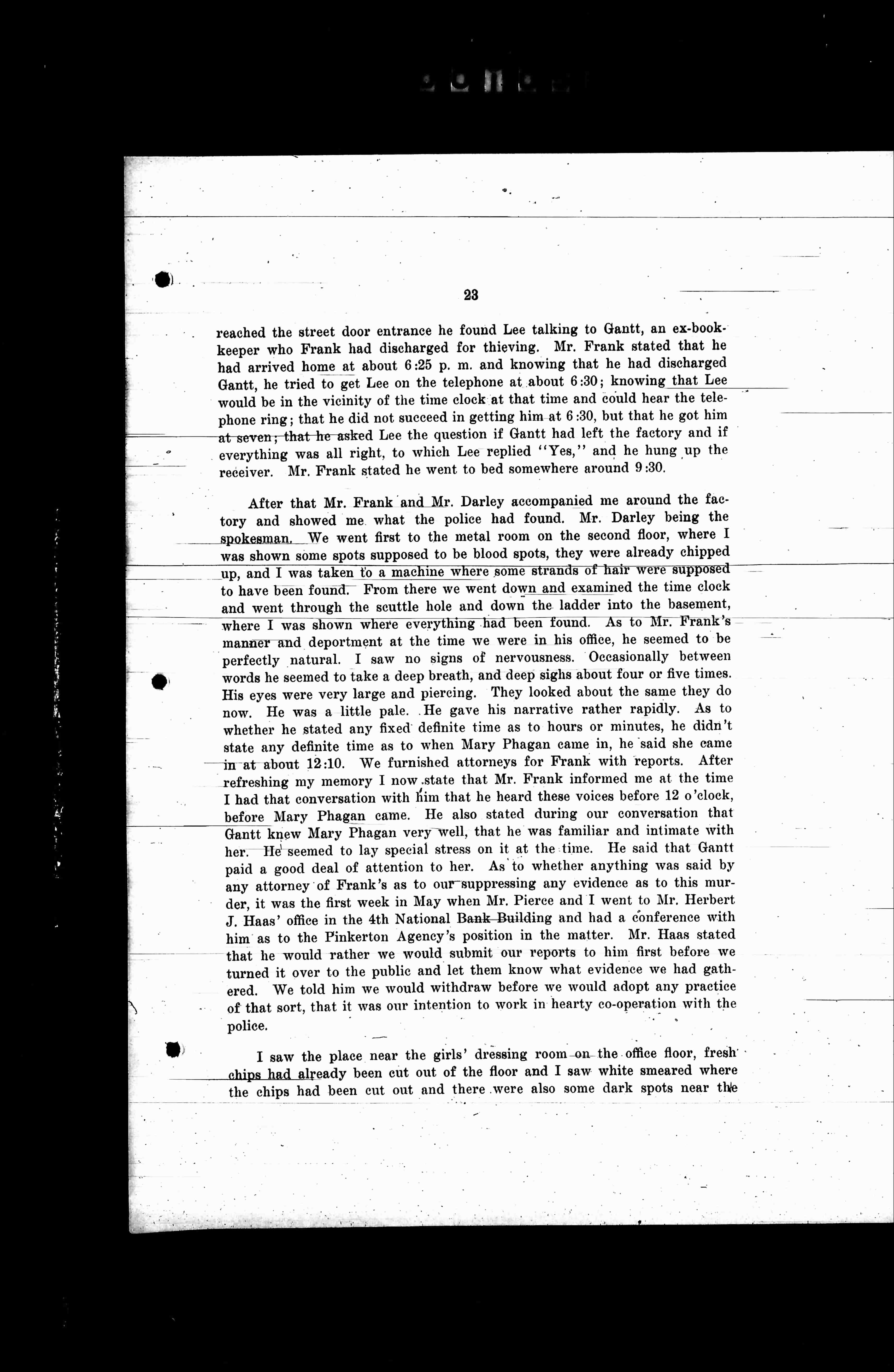 After that Mr. Frank and Mr. Darley accompanied me around the fac- tory and showed me what the police had found. Mr. Darley being the spokesman. We went first to the metal room on the second floor, where I was shown some spots supposed to be blood spots, they were already chipped up, and I was taken to a machine where some strands of hair were supposed to have been found. From there we went down and examined the time clock and went through the scuttle hole and down the ladder into the basement, where I was shown where everything had been found. As to Mr. Frank's manner and deportment at the time we were in his office, he seemed to be perfectly natural. I saw no signs of nervousness. Occasionally between words he seemed to take a deep breath, and deep sighs about four or five times. His eyes were very large and piercing. They looked about the same they do now. He was a little pale. He gave his narrative rather rapidly. As to whether he stated any fixed definite time as to hours or minutes, he didn't state any definite time as to when Mary Phagan came in, he said she came in at about 12:10. We furnished attorneys for Frank with reports. After refreshing my memory I now state that Mr. Frank informed me at the time I had that conversation with him that he had heard these voices before 12 o'clock, before Mary Phagan came. He also told me during our conversation that Gantt knew Mary Phagan very well, that he was familiar and intimate with her. He seemed to lay special stress on it at the time. He said that Gantt paid a good deal of attention to her. As to whether anything was said by any attorney of Frank's as to our suppressing any evidence as to this mur- der, it was the first week in May when Mr. Pierce and I went to Mr. Herbert J. Haas' office in the 4th National Bank-Building and had a conference with him as to the Pinkerton Agency's position in the matter. Mr. Haas stated that he would rather we would submit our reports to him first before we turned it over to the public and let them know what evidence we had gath- ered. We told him we would withdraw before we would adopt any practice of that sort, that it was our intention to work in hearty co-operation with the police.