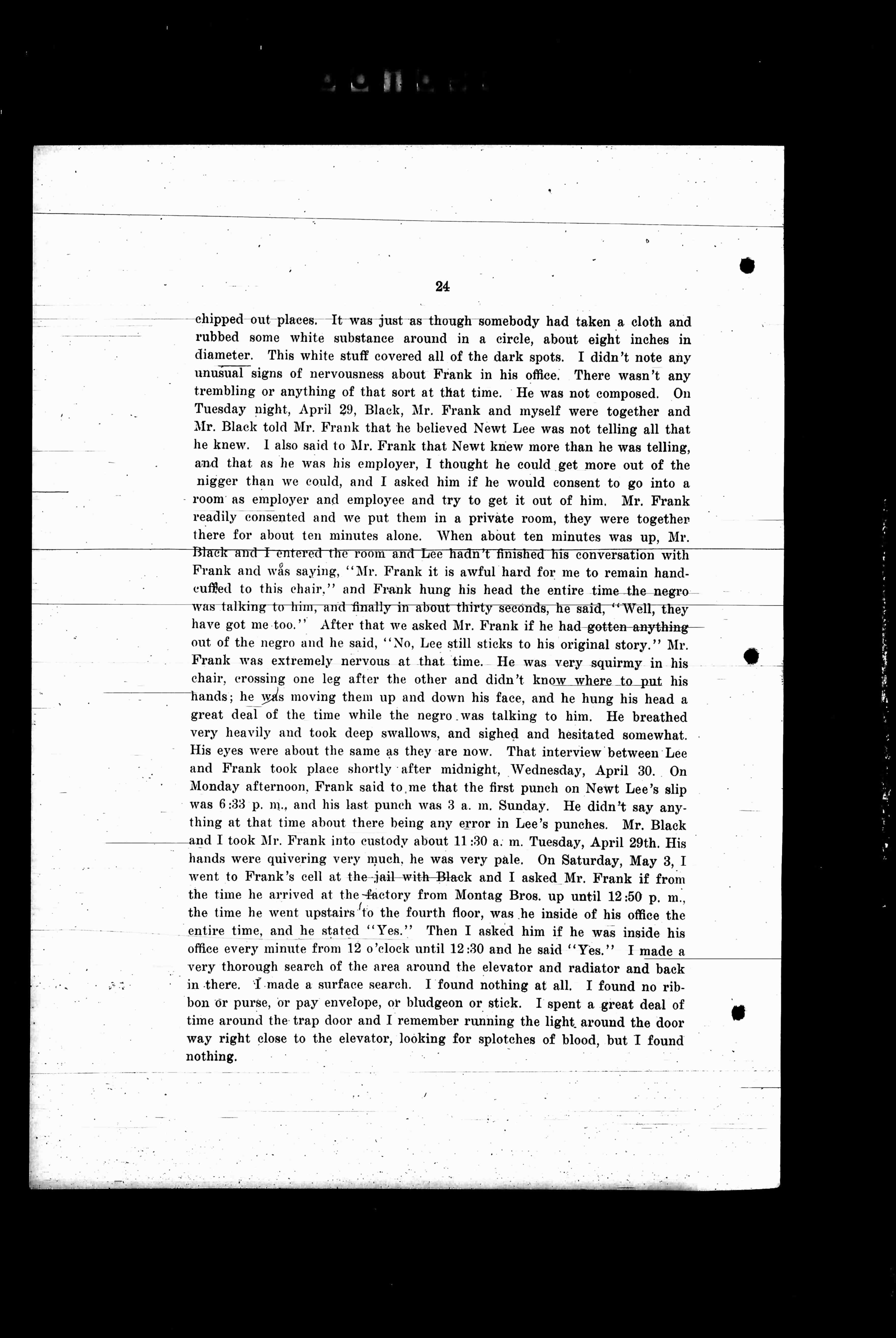 chipped out places. It was just as though somebody had taken a cloth and rubbed some white substance around in a circle, about eight inches in diameter. This white stuff covered all of the dark spots. I didn't note any unusual signs of nervousness about Frank in his office. There wasn't any trembling or anything of that sort at that time. He was not composed. On Tuesday night, April 29, Black, Mr. Frank and myself were together and Mr. Black told Mr. Frank that he believed Newt Lee was not telling all that he knew. I also said to Mr. Frank that Newt Lee knew more than he was telling, and that as he was his employer, I thought he could get more out of the nigger than we could, and I asked him if he would consent to go into a room as employer and employee and try to get it out of him. Mr. Frank readily consented and we put them in a private room, they were together there for about ten minutes alone. Then about ten minutes was up, Mr. Black and I entered the room and Lee hadn't finished his conversation with Frank and was saying, "Mr. Frank it is awful hard for me to remain handcuffed to this chair," and Frank hung his head the entire time the negro was talking to him, and finally in about thirty seconds, he said, "Well, they have got me too." After that we asked Mr. Frank if he had gotten anything out of the negro and he said, "No, Lee still sticks to his original story." Mr. Frank was extremely nervous at that time. He was very squirmy in his chair, crossing one leg after the other and didn't know where to put his hands; he was moving them up and down his face, and he hung his head a great deal of the time while the negro was talking to him. He breathed very heavily and took deep swallows, and sighed and hesitated somewhat. His eyes were about the same as they are now. That interview between Lee and Frank took place shortly after midnight, Wednesday, April 30. On Monday afternoon, Frank said to me that the first punch on Newt Lee's slip was 6:33 p. m., and his last punch was 3 a. m. Tuesday. He didn't say anything at the time about there being any error in Lee's punches. Mr. Black and I took Mr. Frank into custody about 11:30 a. m. Tuesday, April 29th. His hands were quivering very much, he was very pale. On Saturday, May 3, I went to Frank's cell at the jail with Black and I asked Mr. Frank if from the time he arrived at the factory from Montag Bros. up until 12:50 p. m. the time he went upstairs to the fourth floor, was he inside of his office the entire time, and he stated "Yes." Then I asked him if he was inside his office every minute from 12 o'clock until 12:30 and he said "Yes." I made a very thorough search of the area around the elevator and radiator and back in there. I made a surface search. I found nothing at all. I found no ribbon or purse, or pay envelope, or bludgeon or stick. I spent a great deal of time around the trap door and I remember running the light around the door way right close to the elevator, looking for splotches of blood, but I found nothing.