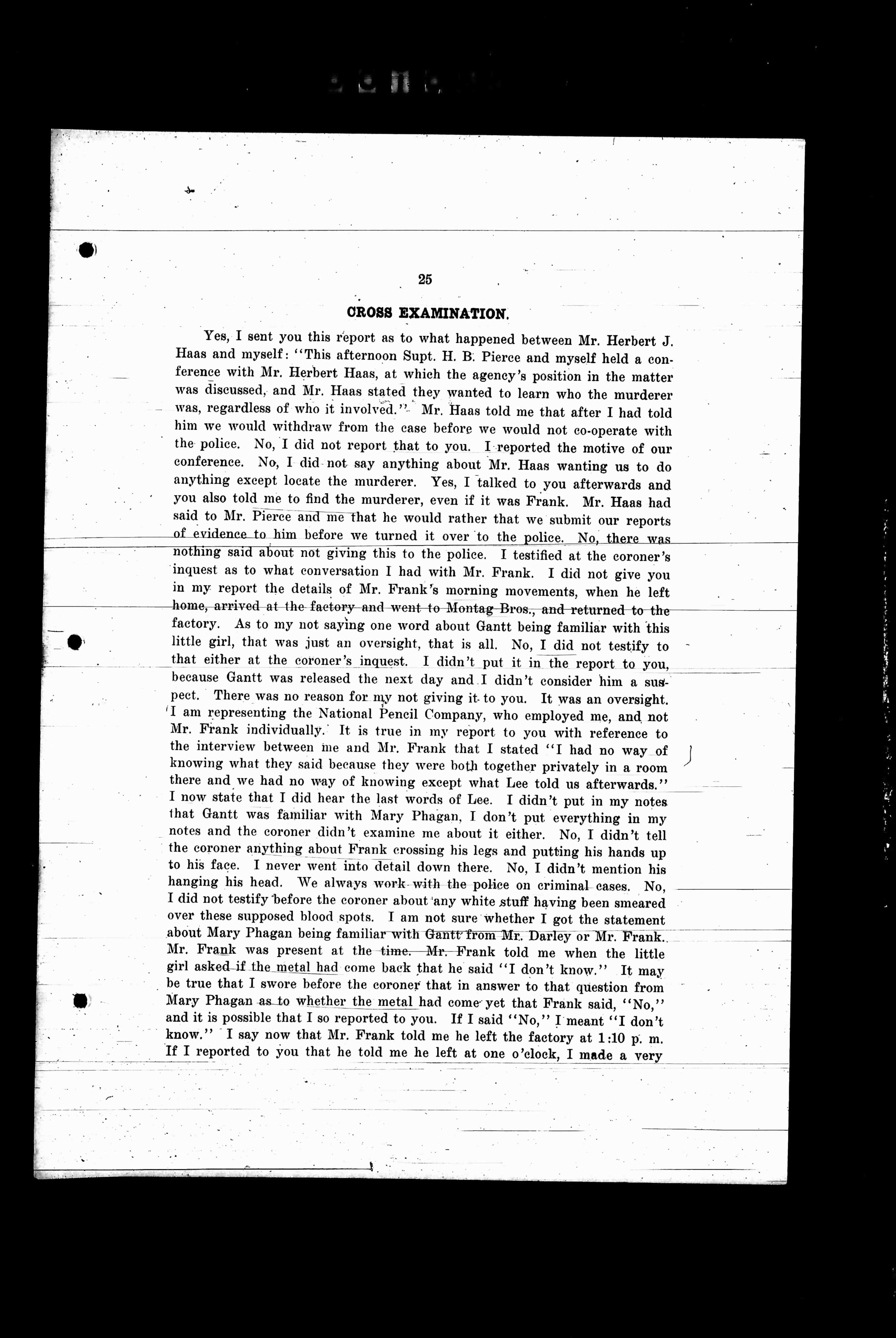 Yes, I sent you this report as to what happened between Mr. Herbert J. Haas and myself: "This afternoon Supt. H. B. Starnes and myself held a conference with Mr. Herbert Haas, at which time Darley's position in the matter was discussed, and Mr. Haas stated they wanted to learn who the murderer was, regardless of who it involved."- Mr. Haas told me that after I had told him we would withdraw from the case before we would not co-operate with the police. No, I did not report that to you. I reported the motive of our conference. No, I did not say anything about Mr. Haas wanting us to do anything except locate the murderer. Yes, I talked to you afterwards and you also told me to find the murderer, even if it was Frank. Mr. Haas had said to Mr. Pierce and me that he would rather that we submit our reports of evidence to him before we turned it over to the police. No, there was nothing said about not giving this to the police. I testified at the coroner's inquest as to what conversation I had with Mr. Frank. I did not give you in my report the details of Mr. Frank's morning movements, when he left home, arrived-at-the factory-and-went-to-Montag-Bros., and returned-to-the factory. As to my not saying one word about Gantt being familiar with this little girl, that was just an oversight, that is all. No, I did not testify to that either at the coroner's inquest. I didn't put it in the report to you, because Gantt was released the next day and I didn't consider him a suspect. There was no reason for my not giving it to you. It was an oversight. 'I am representing the National Pencil Company, who employed me, and not Mr. Frank individually.' It is true in my report to you with reference to the interview between me and Mr. Frank that I stated 'I had no way of knowing what they said because they were both together privately in a room there and we had no way of knowing except what Lee told us afterwards.' I now state that I did hear the last words of what L. didn't put in my notes that Gantt was familiar with Mary Phagan, and I didn't put everything in my notes and the coroner didn't examine me about it either. No, I didn't tell the coroner anything about Frank crossing his legs and putting his hands up to his face. I never went into detail down there. No, I didn't mention his hanging his head. We always work-with the police on criminal cases. No, I did not testify before the coroner about any white stuff having been smeared over these supposed blood spots. I am not sure whether I got the statement about Mary Phagan being familiar with Gantt from Mr. Darley or Mr. Frank. Mr. Frank was present at the time.-Mr. Frank told me when the little girl asked-if the metal had come back the said 'I don't know.' It may be true that I swore before the coroner that in answer to that question from Mary Phagan as to whether the metal had come yet that Frank said, 'No,' and it is possible that I so reported to you. If I said 'No,' I meant 'I don't know.' I say now that Mr. Frank told me he left the factory at 1:10 p.m. If I reported to you that he told me he left at one o'clock, I made a very