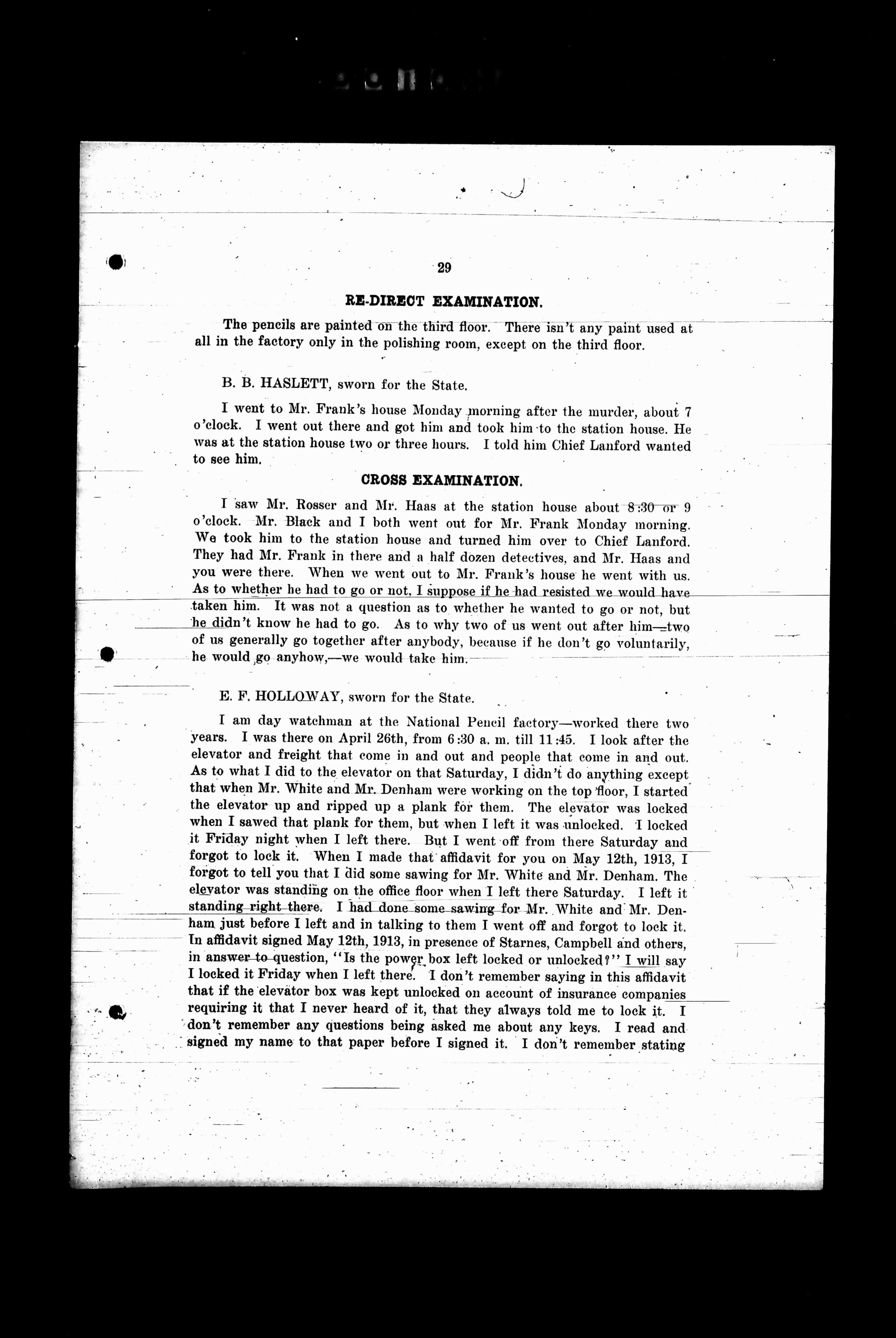 I saw Mr. Rosser and Mr. Haas at the station house about 8:30 or 9 o’clock. Mr. Black and I both went out for Mr. Frank Monday morning. We took him to the station house and turned him over to Chief Lanford. They had Mr. Frank in there and a half dozen detectives, and Mr. Haas and you were there. When we went out to Mr. Frank’s house he went with us. As to whether he had to go or not, I suppose if he had resisted we would have taken him. It was not a question as to whether he wanted to go or not, but he didn’t know he had to go. As to why two of us went out after him—two of us generally go together after anybody, because if he don’t go voluntarily, he would go anyhow,—we would take him.