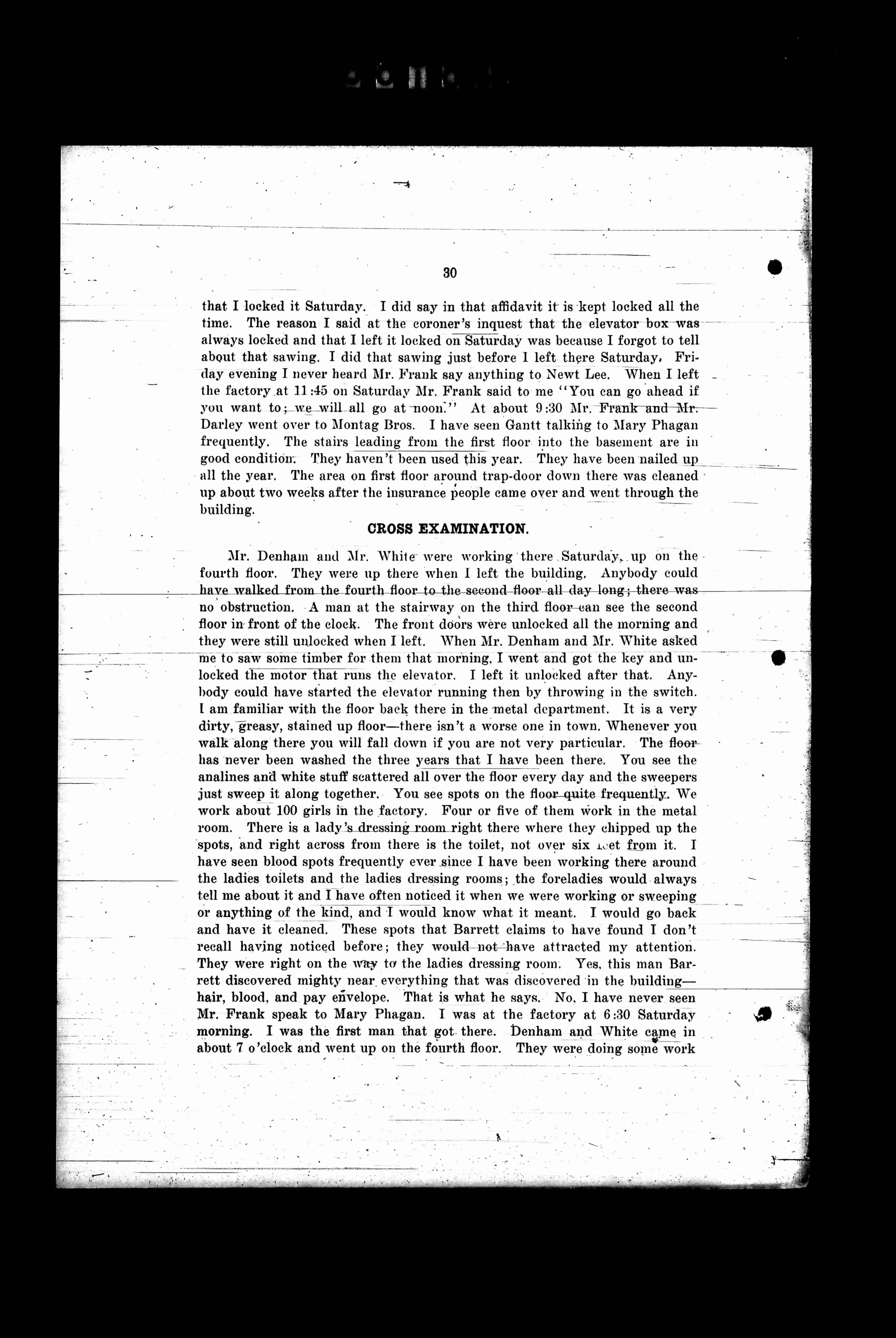 Mr. Denham and Mr. White were working there Saturday, up on the fourth floor. They were up there when I left the building. Anybody could have walked from the fourth floor to the second floor all day long; there was no obstruction. A man at the stairway on the third floor can see the second floor in front of the clock. The front doors were unlocked all the morning and they were still unlocked when I left. When Mr. Denham and Mr. White asked me to saw some timber for them that morning I went and got the key and unlocked the motor that runs the elevator. I left it unlocked after that. Anybody could have started the elevator running then by throwing in the switch. I am familiar with the floor back there in the metal department. It is a very dirty, greasy, stained up floor-there isn't a worse one in town. Whenever you walk along there you will fall down if you are not very particular. The floor has never been washed the three years that I have been there. You see the analines and white stuff scattered all over the floor every day and the sweepers just sweep it along together. You see spots on the floor quite frequently. We work about 100 girls in the factory. Four or five of them work in the metal room. There is a lady's dressing room right where they chipped up the spots, and right across from there is the toilet, not over six feet from it. I have seen blood spots frequently ever since I have been working there around the ladies toilets and the ladies dressing rooms; the foreladies would always tell me about it and I have often noticed it when we were working or sweeping or anything of the kind, and I would know what it meant. I would go back and have it cleaned. These spots that Barrett claims to have found I don't recall having noticed before; they would not have attracted my attention. They were right on the way to the ladies dressing room. Yes, this man Barrett discovered mighty near everything that was discovered in the building- hair, blood, and pay envelope. That's what he says. No, I have never seen Mr. Frank speak to Mary Phagan. I was at the factory at 6:30 Saturday morning. I was the first man that got there. Denham and White came in about 7 o'clock and went up on the fourth floor. They were doing some work