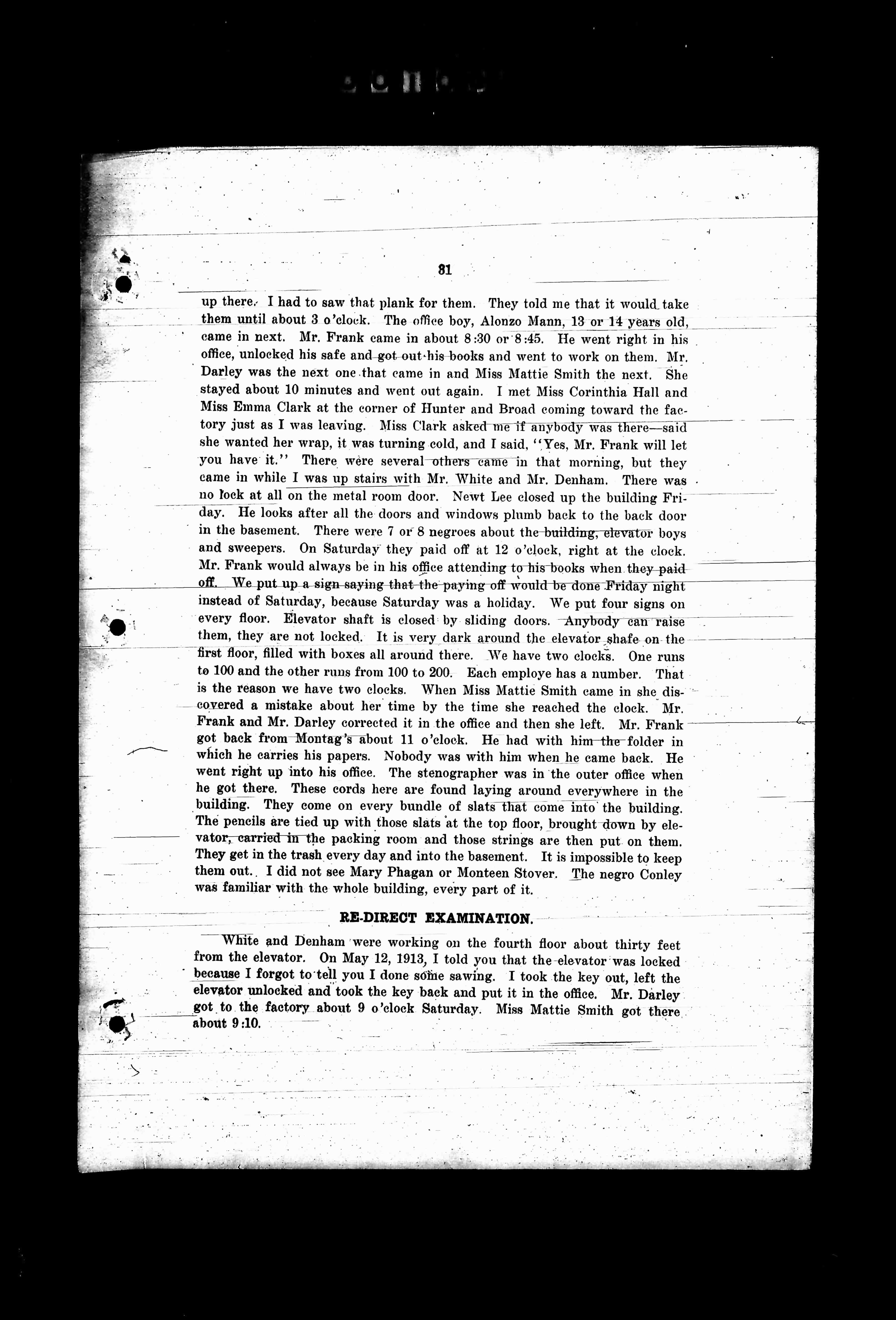 up there; I had to saw that plank for them. They told me that it would take them until about 3 o'clock. The office boy, Alonzo Mann, 18 or 14 years old, came in next. Mr. Frank came in about 8:20 or 8:45. He went right in his office, unlocked his safe and got out-his books. I went to work on them. Mr. Darley was the next one that came in and then Mattie Smith the next. She stayed about 10 minutes and went out again. I met Miss Corinthia Hall and Miss Emma Clark at the corner of Hunter and Broad coming toward the factory just as I was leaving. Miss Clark asked me if anybody was there-said she wanted her wrap, it was turning cold, and I said, "Yes, Mr. Frank will let you have it." There were several others came in that morning, but they came in while I was up stairs with Mr. White and Mr. Denham. There was no lock at all on the metal room door. Newt Lee closed up the building Friday. He looks after all the doors and windows; plumb back to the back door in the basement. There were 7 or 8 negroes about the building; elevator boys and sweepers. On Saturday they paid off at 12 o'clock, right at the clock. Mr. Frank would always be in his office attending to his books when they paid off. We put up a sign-saying that the paying-off would be done Friday night instead of Saturday, because Saturday was a holiday. We put four signs on every floor. Elevator shaft is closed by sliding doors. Anybody can raise them, they are not locked. It is very dark around the elevator shaft on the first floor, filled with boxes all around there. We have two clocks. One runs to 100 and the other runs from 100 to 200. Each employe has a number. That is the reason we have two clocks. When Miss Mattie Smith came in she discovered a mistake about her time by the time she reached the clock. Mr. Frank and Mr. Darley corrected it in the office and then she left. Mr. Frank got back from Montag's about 11 o'clock. He had with him the folder in which he carries his papers. Nobody was with him when he came back. He went right up into his office. The stenographer was in the outer office when he got there. These cords here are found all around everywhere in the building. They come on every bundle of slats that come into the building. The pencils are tied up with those slats at the top of the floor, brought down by elevator, carried in the packing room and those strings are then put on them. They get in the trash every day and into the basement. It is impossible to keep them out. I did not see Mary Phagan or Monteen Stover. The negro Conley was familiar with the whole building, every part of it.