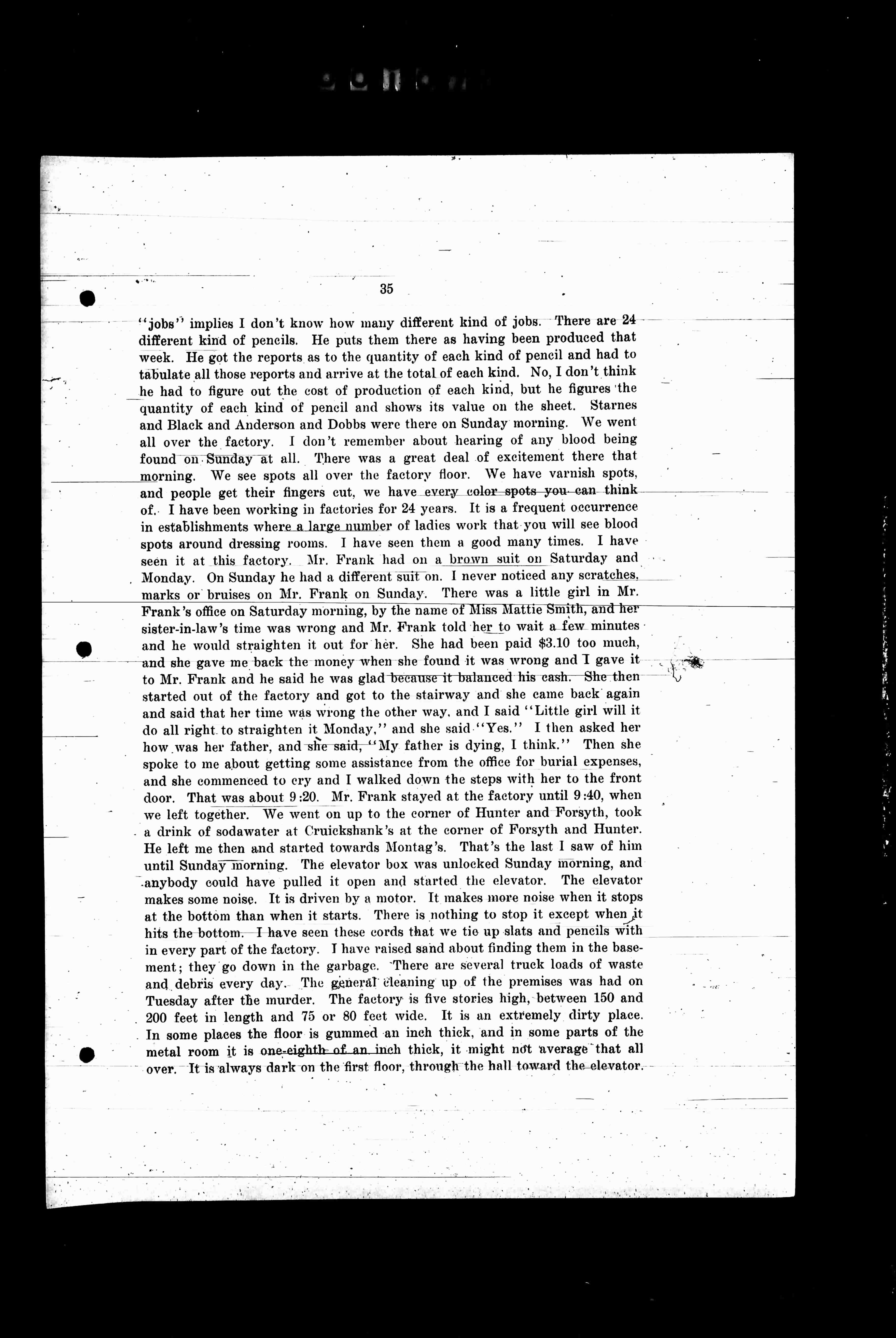 "jobs" implies I don't know how many different kind of jobs. There are 24 different kind of pencils. He puts them there as having been produced that week. He got the reports as to the quantity of each kind of pencil and had to tabulate all those reports and arrive at the total of each kind. No, I don't think he had to figure out the cost of production of each kind, but he figures the quantity of each kind of pencil and shows its value on the sheet. Starnes and Black and Anderson and Dobbs were there on Sunday morning. We went all over the factory. I don't remember about hearing of any blood being found on Sunday at all. There was a great deal of excitement there that morning. We see spots all over the factory floor. We have varnish spots, and people get their fingers cut, we have every color-spots-you-can think of. I have been working in factories for 24 years. It is frequent occurrence in establishments where a large number of ladies work that you will see blood spots around dressing rooms. I have seen them a good many times. I have seen it at this factory. Mr. Frank had on a brown suit on Saturday and Monday. On Sunday he had a different suit on. I never noticed any scratches, marks or bruises on Mr. Frank on Sunday. There was a little girl in Mr. Frank's office on Saturday morning, by the name of Miss Mattie Smith, and her sister-in-law's time was wrong and Mr. Frank told her to wait a few minutes; and he would straighten it out for her. She had been paid $3.10 too much, and she gave me back the money when she found it was wrong and I gave it to Mr. Frank and he said he was glad because it balanced his cash. She then started out of the factory and got to the stairway and she came back again and said that her time was wrong the other way, and I said "Little girl will it do all right to straighten it Monday," and she said "Yes." I then asked her how was her father, and she said, "My father is dying, I think." Then she spoke to me about getting some assistance from the office for burial expenses, and she commenced to cry and I walked down the steps with her to the front door. That was about 9:20. Mr. Frank stayed at the factory until 9:40, when we left together. We went on up to the corner of Hunter and Forsyth, took a drink of soda water at Cruickshank's at the corner of Forsyth and Hunter. He left me then and started towards Montag's. That's the last I saw of him until Sunday morning. The elevator box was unlocked Sunday morning, and anybody could have pulled it open and started the elevator. The elevator makes some noise. It is driven by a motor. It makes more noise when it stops at the bottom than when it starts. There is nothing to stop it except when it hits the bottom. I have seen these cords that we tie up slats and pencils with in every part of the factory. I have raised sand about finding them in the basement; they go down in the garbage. There are several truck loads of waste and debris every day. The general cleaning up of the premises was had on Tuesday after the murder. The factory is five stories high, between 150 and 200 feet in length and 75 or 80 feet wide. It is an extremely dirty place. In some places the floor is gummed an inch thick, and in some parts of the metal room it is one-eighth-of-an inch thick, it might not average that all over. It is always dark on the first floor, through the hall toward the elevator.