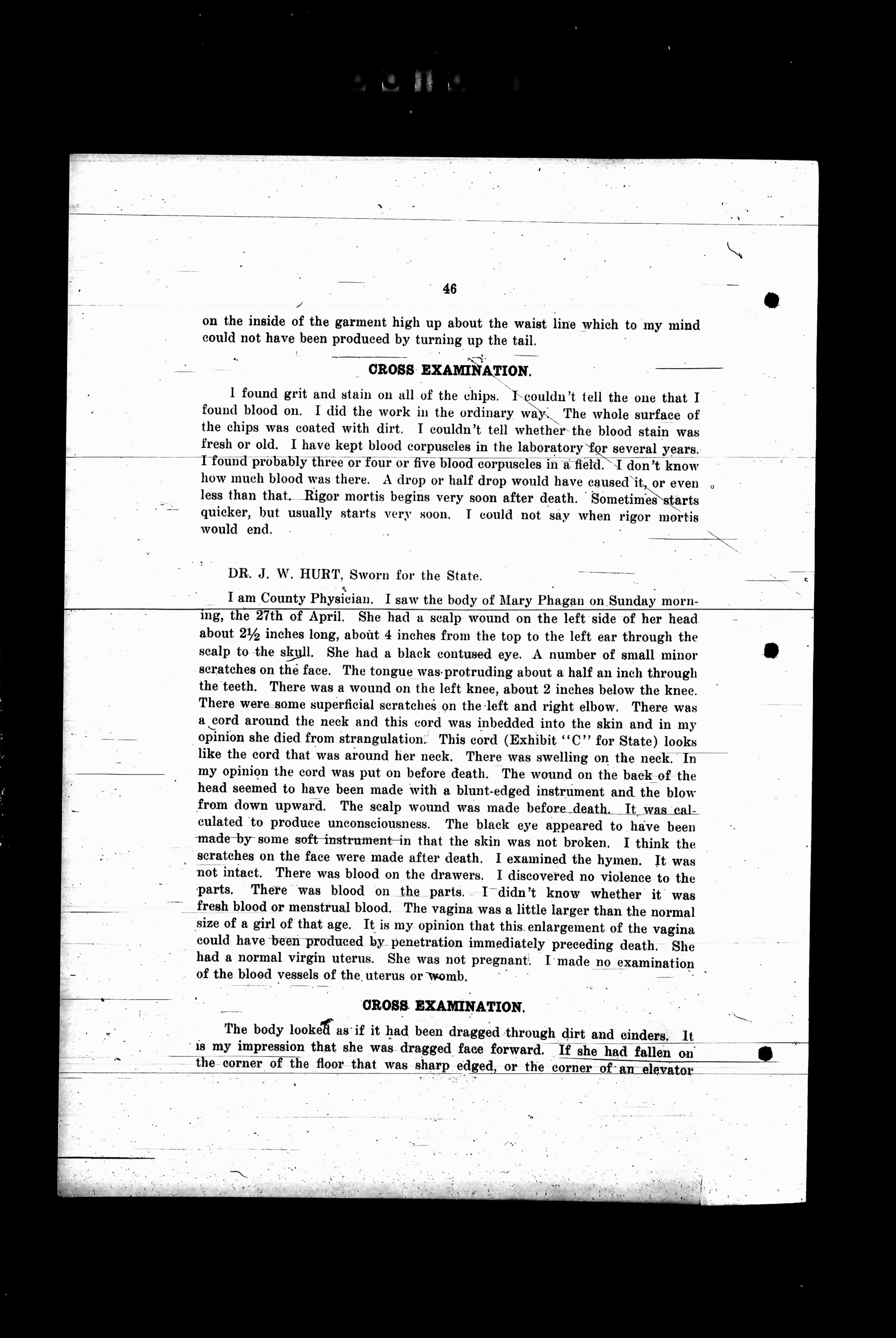 I am County Physician. I saw the body of Mary Phagan on Sunday morning, the 27th of April. She had a scalp wound on the left side of her head about 2 1/2 inches long, about 4 inches from the top to the left ear through the scalp to the skull. She had a black contused eye. A number of small minor scratches on the face. The tongue was protruding about a half an inch through the teeth. There was a wound on the left knee, about 2 inches below the knee. There were some superficial scratches on the left elbow and right elbow. There was a cord around the neck and this cord was imbedded into the skin and in my opinion she died from strangulation. This cord (Exhibit "C" for State) looks like the cord that was around her neck. There was swelling on the neck. In my opinion the cord was put on before death. The wound on the back of the head seemed to have been made with a blunt edged instrument and the blow from down upward. The scalp wound was made before death. It was calculated to produce unconsciousness. There were appearances to have been made by some soft instrument in that the skin was not broken. I think the scratches on the face were made after death. I examined the hymen. It was not intact. There was blood on the drawers. I discovered no violence to the parts. There was blood on the parts. I didn't know whether it was fresh blood or menstrual blood. The vagina was a little larger than the normal size of a girl of that age. It is my opinion that this enlargement of the vagina could have been produced by penetration immediately preceding death. She had a normal virgin uterus. She was not pregnant. I made no examination of the blood vessels of the uterus or womb.