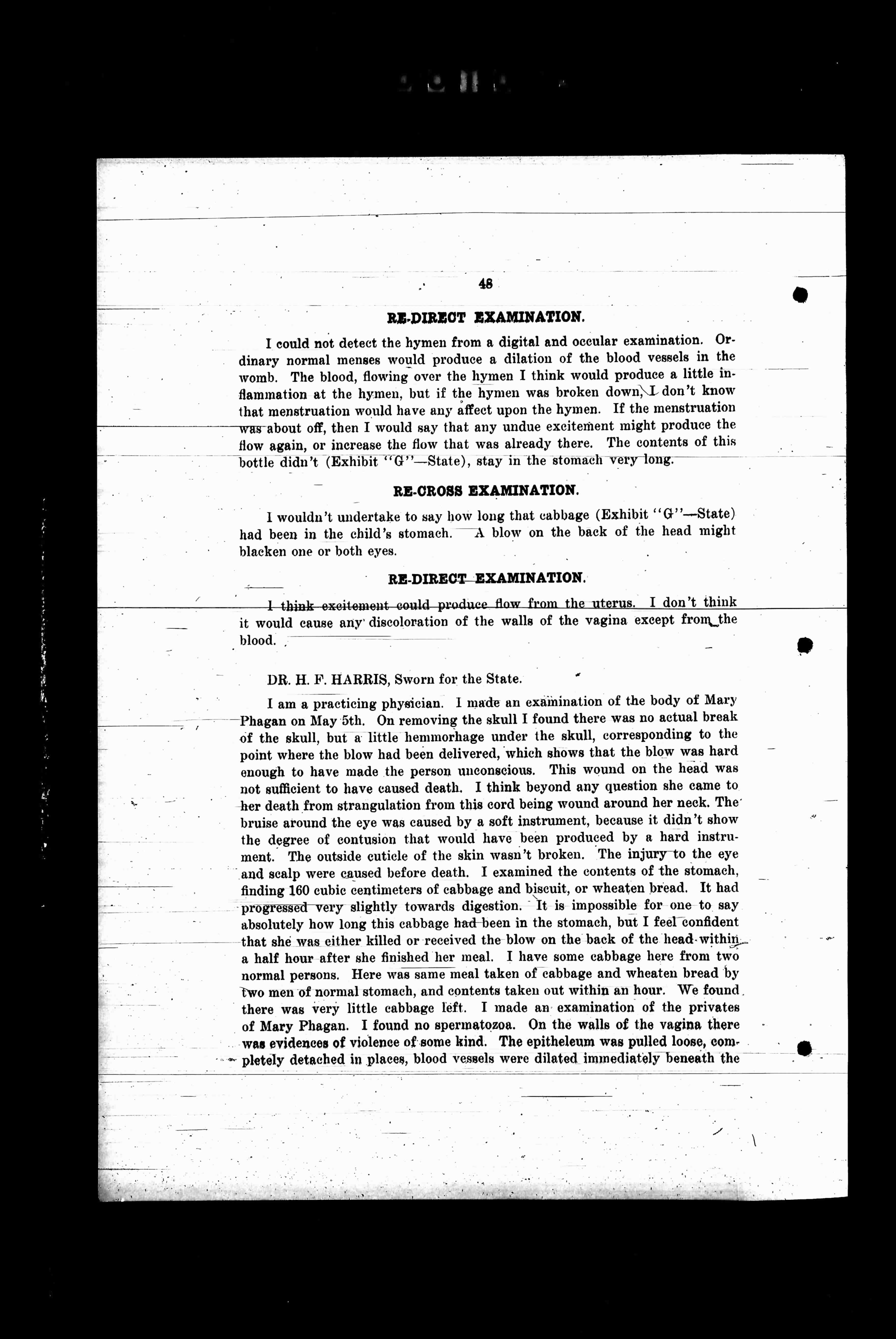 I am a practicing physician. I made an examination of the body of Mary Phagan on May 5th. On removing the skull I found there was no actual break of the skull, but a little hemorrhage under the skull, corresponding to the point where the blow had been delivered, which shows that the blow was hard enough to have made the person unconscious. This wound on the head was not sufficient to have caused death. I think beyond any question she came to her death from strangulation from a cord being wound around her neck. The bruise around the eye was caused by some blunt instrument, because it didn’t show the degree of contusion that would have been produced by a hard instrument. The outside cuticle of the skin wasn’t broken. The injury to the eye and scalp were caused before death. I examined the contents of the stomach, finding 160 cubic centimeters of cabbage and biscuit, or wheaten bread. It had progressed very slightly toward digestion. It is impossible for one to say absolutely how long this cabbage had been in the stomach, but I feel confident that she was either killed or received the blow on the back of the head within a half hour after she finished her meal. I have some cabbage here from two normal persons. Here was some meal taken out of cabbage and wheaten bread by two men of normal stomach, and contents taken out within an hour. We found there was very little cabbage left. I made an examination of the privates of Mary Phagan. I found no spermatozoa. On the walls of the vagina there was evidence of violence of some kind. The epithelium was pulled loose, completely detached in places, blood vessels were dilated immediately beneath the