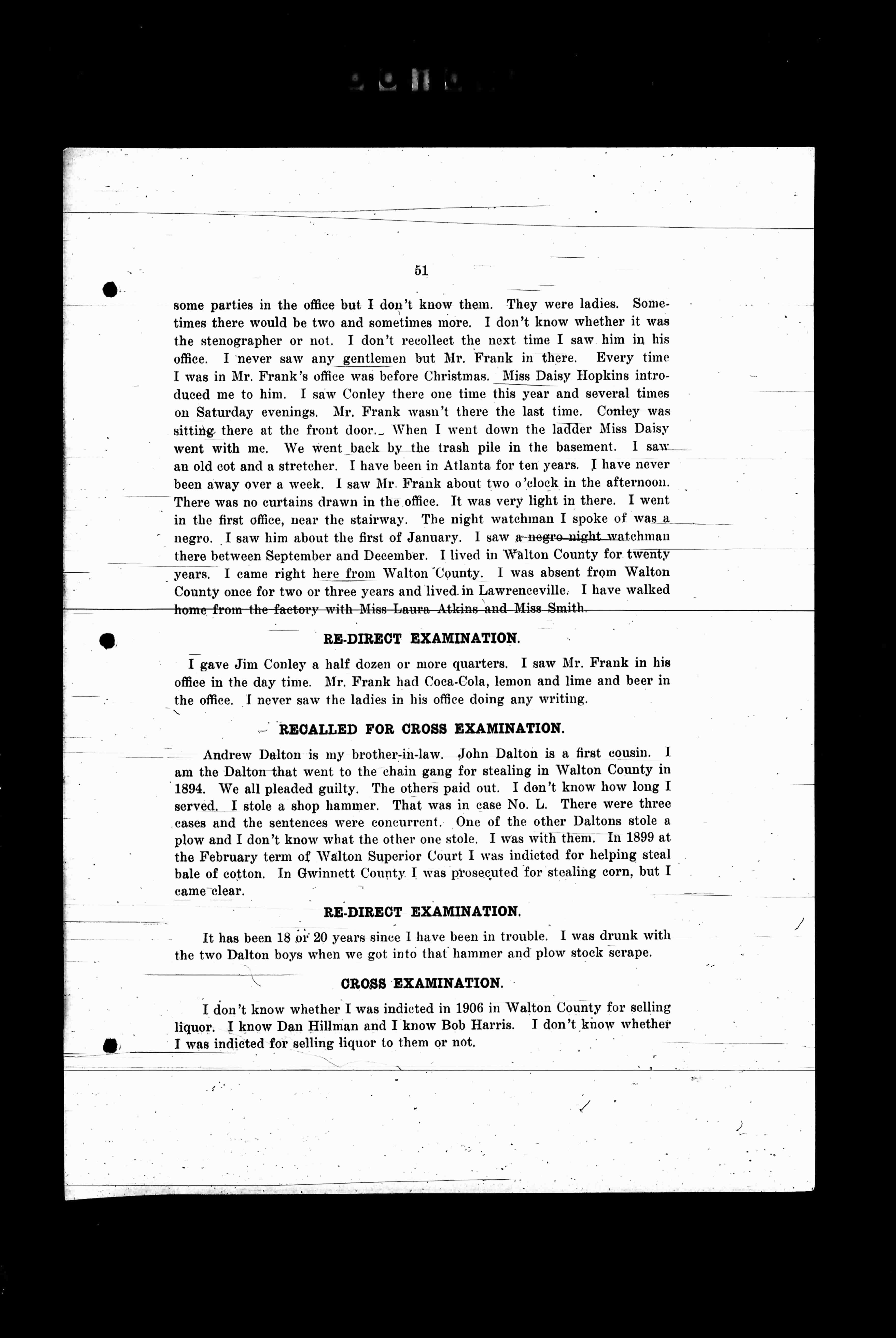 some parties in the office but I don’t know them. They were ladies. Sometimes there would be two and sometimes more. I don’t know whether it was the stenographer or not. I don’t recollect the next time I saw him in his office. I never saw any gentlemen but Mr. Frank in there. Every time I was in Mr. Frank’s office was before Christmas. Miss Daisy Hopkins introduced me to him. I saw Conley there one time this year and several times on Saturday evenings. Mr. Frank wasn’t there the last time. Conley was sitting there at the front door. When I went down the ladder Miss Daisy went with me. We went back by the trash pile in the basement. I saw an old cot and a stretcher. I have been in Atlanta for ten years. I have never been away over a week. I saw Mr. Frank about two o’clock in the afternoon. There was no curtains drawn in the office. It was very light in there. I went in the first office, near the stairway. The night watchman I spoke of was a negro. I saw him about the first of January. I saw a negro-night-watchman there between September and December. I lived in Walton County for twenty years. I came right here from Walton County. I was absent from Walton County once for two or three years and lived in Lawrenceville. I have walked home from the factory with Miss Laura Atkins and Miss Smith.