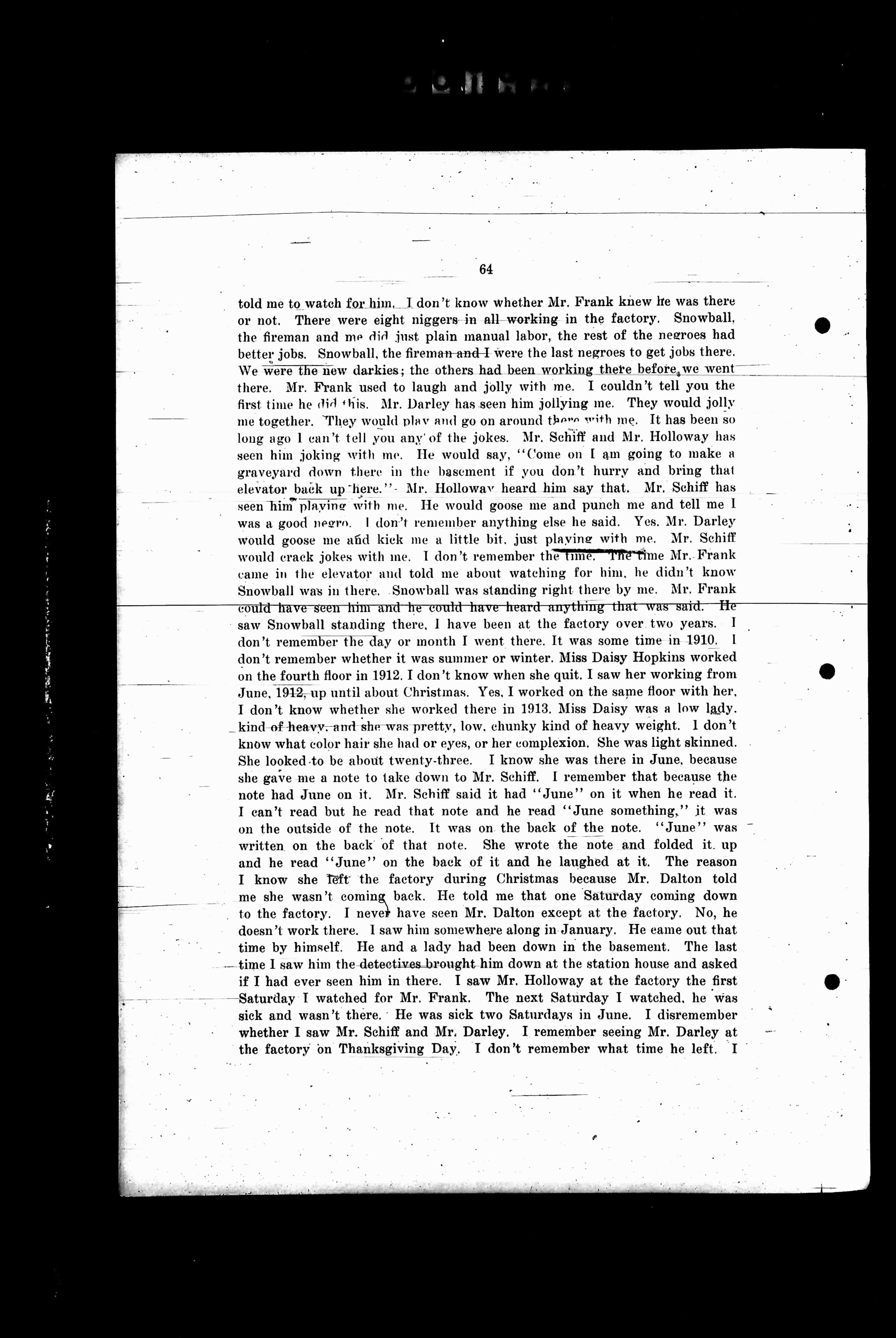 told me to watch for him. I don't know whether Mr. Frank knew he was there or not. There were eight niggers in all working in the factory. Snowball, the fireman and me did just plain manual labor, the rest of the negroes had better jobs. Snowball, the fireman and me were the last negroes to get jobs there. We were the new darkies; the others had been working there before we went there. Mr. Frank used to laugh and jolly with me. I couldn't tell you the first time he did this. Mr. Darley has seen him jollying me. They would jolly me together. They would play and go on around there with me. It has been so long ago I can't tell you any of the jokes. Mr. Schiff and Mr. Holloway has seen him joking with me. He would say, "Come on, I am going to make a graveyard down there in the basement if you don't hurry and bring that elevator back up here." Mr. Holloway heard him say that. Mr. Schiff has seen him playing with me. He would goose me and punch me and tell me I was a good negro. I don't remember anything else he said. Yes, Mr. Darley would goose me and kick me a little bit, just playing with me. Mr. Schiff would crack jokes with me. I don't remember the time. The time Mr. Frank came in the elevator and told me about watching for him, he didn't know Snowball was in there. Snowball was standing right there by me. Mr. Frank could have seen him and he couldn't have heard anything that was said. He saw Snowball standing there. I have been at the factory over two years. I don't remember the day or month I went there. It was some time in 1910. I don't remember whether it was summer or winter. Miss Daisy Hopkins worked on the fourth floor in 1912. I don't know when she quit. I saw her working from June, 1912, up until about Christmas. Yes, I worked on the same floor with her. I don't know whether she worked there in 1913. Miss Daisy was a low lady, kind of heavy, and she was pretty, low, chunky kind of heavy weight. I don't know what color hair she had or eyes, or her complexion. She was light skinned. She looked to be about twenty-three. I know she was there in June, because she gave me a note to take down to Mr. Schiff. I remember that because the note had June on it. Mr. Schiff said it had "June" on it when he read it. I can't read but he read that note to me. He read "June something," it was on the outside of the note. It was one of the notes. "June" was written on the back of that note. She wrote the note and folded it up and he read "June" on the back of it and he laughed at it. The reason I know she left the factory during Christmas because Mr. Dalton told me she wasn't coming back. He told me that one Saturday coming down to the factory. I never have seen Mr. Dalton except at the factory. No, he doesn't work there. I saw him somewhere along in January. He came out that time by himself. He and a lady had been down in the basement. The last time I saw him the detectives brought him down at the station house and asked if I had ever seen him in the mill. I saw Mr. Holloway at the factory the first Saturday I watched for Mr. Frank. The next Saturday I watched, he was sick and wasn't there. He was sick two Saturdays in June. I disremember whether I saw Mr. Schiff and Mr. Darley. I remember seeing Mr. Darley at the factory on Thanksgiving Day. I don't remember what time he left. I