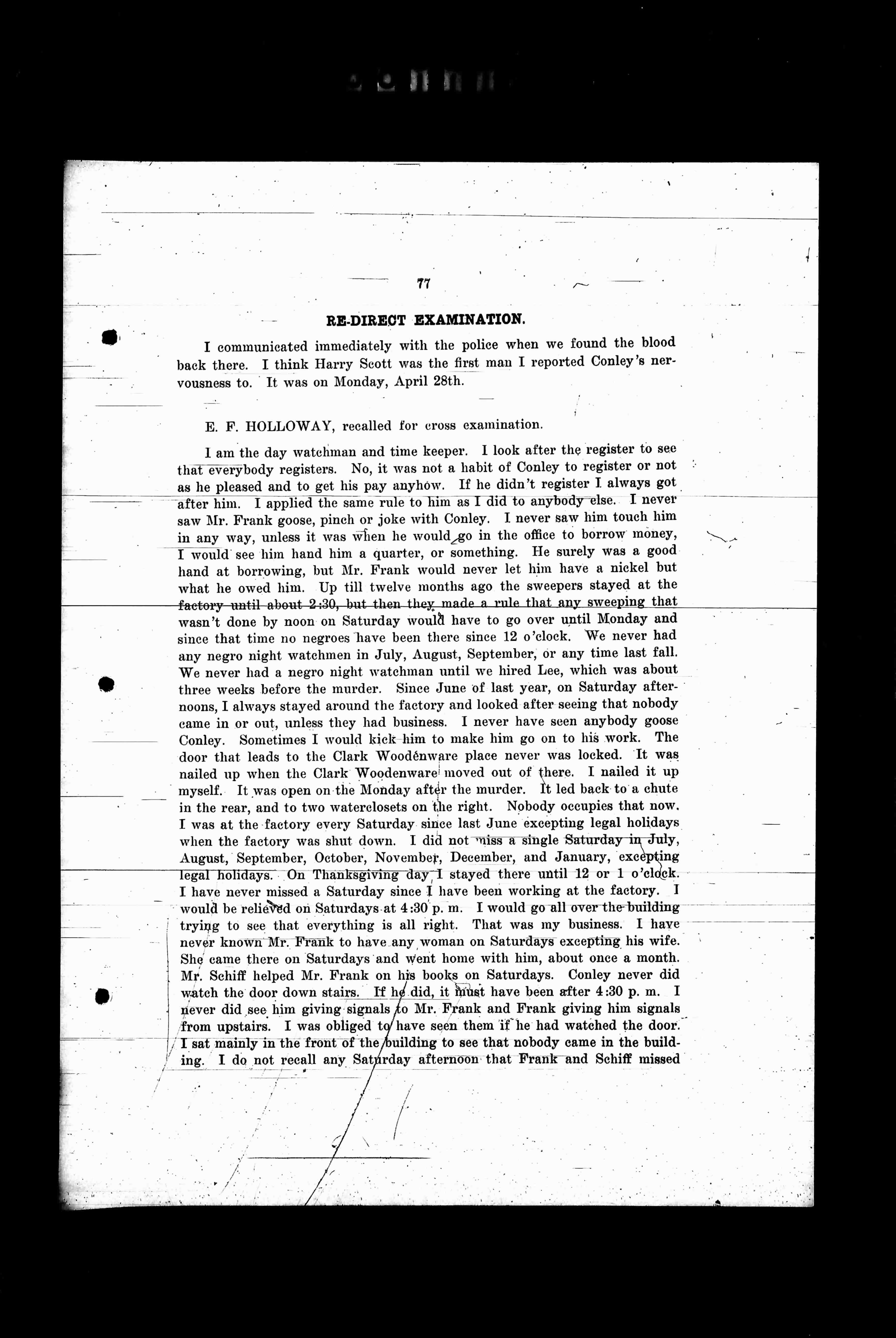I am the day watchman and time keeper. I look after the register to see that everybody registers. No, it was not a habit of Conley to register or not as he pleased and to get his pay anyhow. If he didn't register I always got after him. I applied the same rule to him as I did to anybody else. I never saw Mr. Frank goose, pinch or joke with Conley. I never saw him touch him in any way, unless it was when he would go in the office to borrow money, I would see him hand him a quarter, or something. He surely was a good hand at borrowing, but Mr. Frank would never let him have a nickel but what he owed him. Up till twelve months ago the sweepers stayed at the factory until about 2:30, but then they made a rule that any sweeping that wasn't done by noon on Saturday would have to go over until Monday and since that time no negroes have been there since 12 o'clock. We never had any negro night watchmen in July, August, September, or any time last fall. We never had a negro night watchman until we hired Lee, which was about three weeks before the murder. Since June of last year, on Saturday afternoons, I always stayed around the factory and looked after seeing that nobody came in or out, unless they had business. I never have seen anybody goose Conley. Sometimes I would kick him to make him go on to his work. The door that leads to the Clark Woodenware place never was locked. It was nailed up when the Clark Woodenware moved out of there. I nailed it up myself. It was open on the Monday after the murder. It led back to a chute in the rear, and to two waterclosets on the right. Nobody occupies that now. I was at the factory every Saturday since last May excepting legal holidays when the factory was shut down. I did not miss a single Saturday in July, August, September, October, November, December, and January, excepting legal holidays. On Thanksgiving day I stayed there until 12 or 1 o'clock. I have never missed a Saturday since I have been working at the factory. I would be relieved on Saturdays at 4:30 p.m. I would go all over the building trying to see that everything is all right. That was my business. I have never known Mr. Frank to have any woman on Saturdays excepting his wife. She came there on Saturdays and went home with him, about once a month. Mr. Schiff helped Mr. Frank on his books on Saturdays. Conley never did watch the door downstairs. If he did, he must have been after 4:30 p.m. I never did see him giving signals to Mr. Frank and Frank giving him signals from upstairs. I was obliged to have seen them if he had watched the door. I sat mainly in the front of the building to see that nobody came in the building. I do not recall any Saturday afternoon that Frank and Schiff missed