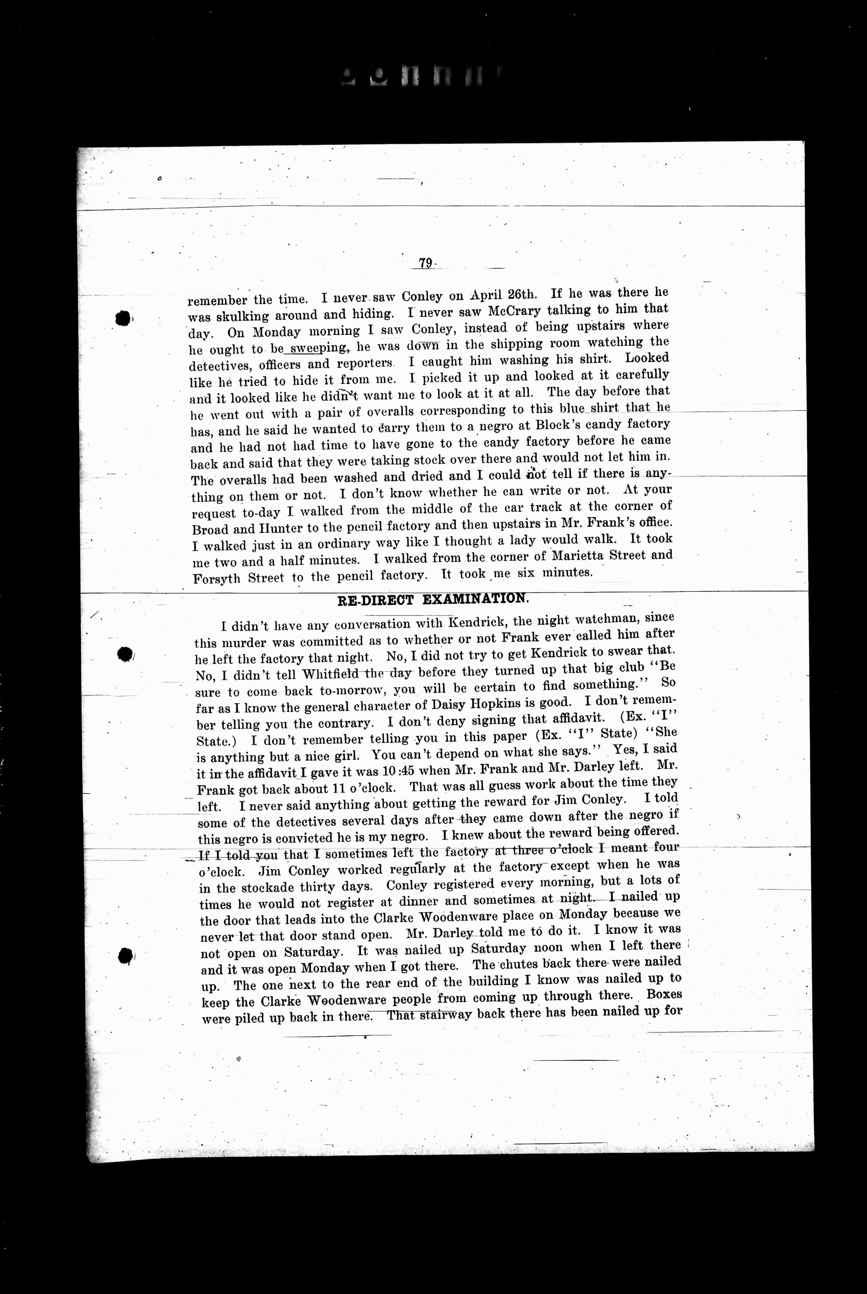 I didn’t have any conversation with Kendrick, the night watchman, since this murder was committed as to whether or not Frank ever called him after he left the factory that night. No, I did not try to get Kendrick to swear that. No, I didn’t tell Whitfield the day before they turned up that big club “Be sure to come back to-morrow, you will be certain to find something.” So far as I know the general character of Daisy Hopkins is good. I don’t remember being shown the following paper: (Ex. “I”, State.) I don’t remember telling you in this paper (Ex. “I”, State) “She is anything but a nice girl. You can’t depend on what she says.” Yes, I said it in the affidavit I gave it was 10:45 when Mr. Frank and Mr. Darley left. Mr. Frank got back about 11 o’clock. That was guess work about the time they left. I never said anything about getting a reward for Jim Conley. I told some of the detectives several days after they came down after the negro if this negro is convicted he is my negro. I knew about the reward being offered. If I told you that I sometimes left the factory at three o’clock I meant four o’clock. Jim Conley worked regularly at the factory except when he was in the stockade thirty days. Conley registered every morning, but a lots of times he would not register at dinner and sometimes at night. I nailed up the door that leads into the Clarke Woodenware place on Monday because we never let that door stand open. Mr. Darley told me to do it. I know it was not open on Saturday. It was nailed up Saturday noon when I left there and it was open Monday when I got there. The chutes back there were nailed up. The one next to the rear end of the building I know was nailed up to keep the Clarke Woodenware people from coming up through there. Boxes were piled up back in there. That stairway back there has been nailed up for