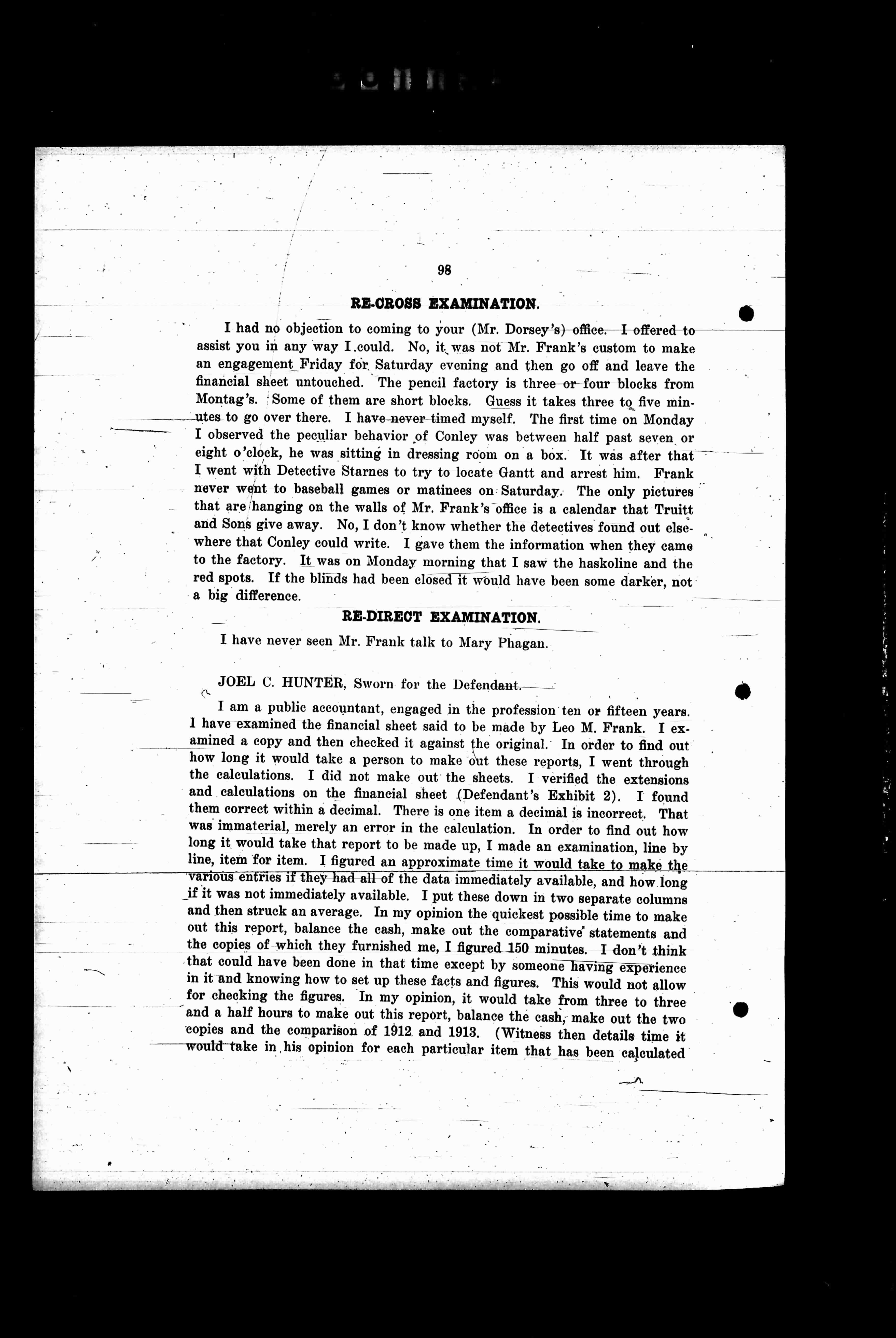 I had no objection to coming to your (Mr. Dorsey’s) office. - I offered to assist you in any way I could. No, it was not Mr. Frank’s custom to make an engagement Friday for Saturday evening and then go off and leave the financial sheet untouched. The pencil factory is three- or four blocks from Montag’s. Some of them are short blocks. Guess it takes three to five minutes to go over there. I have never timed myself. The first time on Monday I observed the peculiar behavior of Conley was between half past seven or eight o’clock, he was sitting in dressing room on a box. It was after that I went with Detective Starnes to try to locate Gantt and arrest him. Frank never went to baseball games or matinees on Saturday. The only pictures that are hanging on the walls of Mr. Frank’s office is a calendar that Truitt and Sons give away. No, I don’t know whether the detectives found out elsewhere that Conley could write. I gave them the information when they came to the factory. It was on Monday morning that I saw the haskoline and the red spots. If the blinds had been closed it would have been some darker, not a big difference.