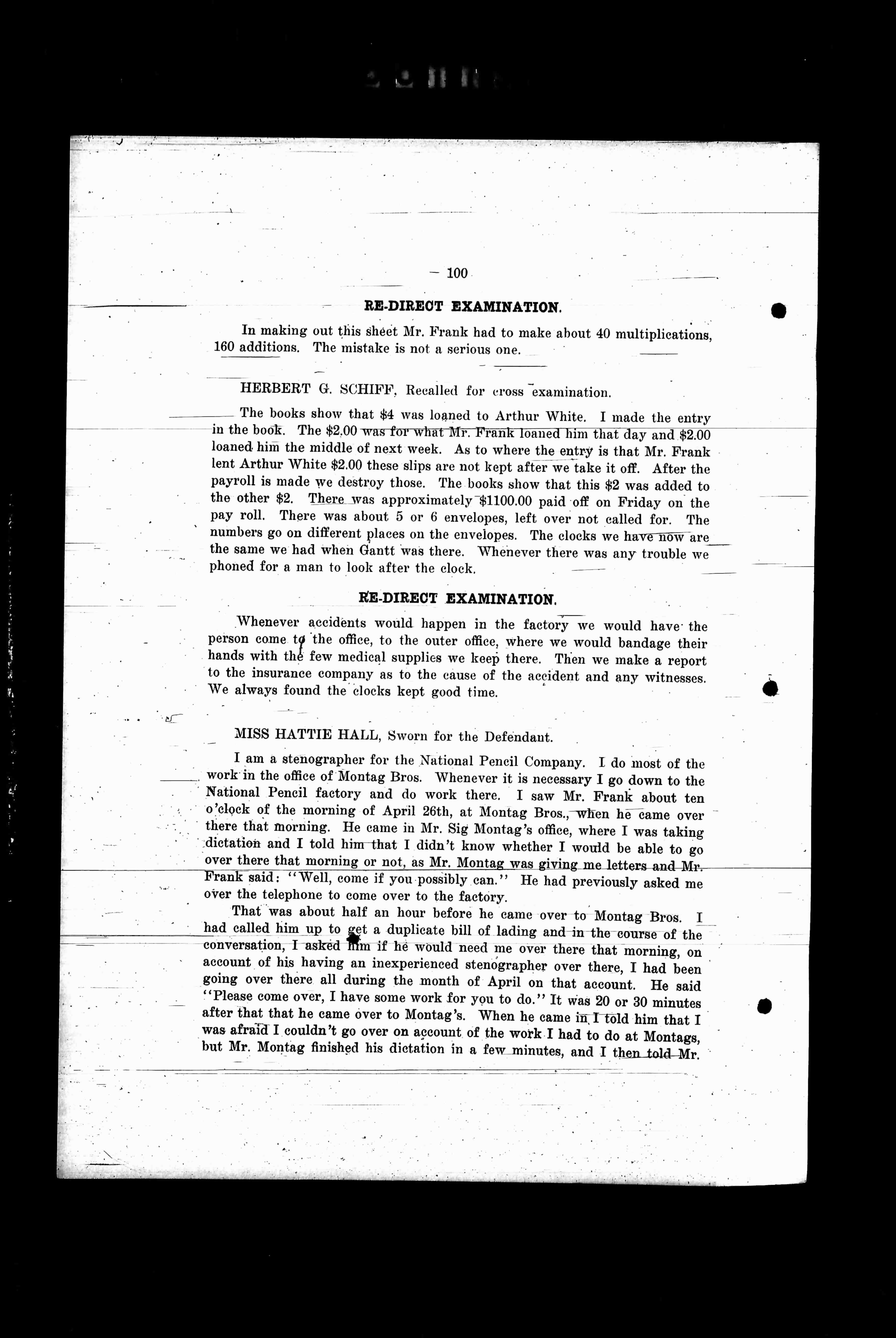 I am a stenographer for the National Pencil Company. I do most of the work in the office of Montag Bros. Whenever it is necessary I go down to the National Pencil factory and do work there. I saw Mr. Frank about ten o'clock of the morning of April 26th, at Montag Bros., when he came over there that morning. He came in Mr. Sig's office, where I was taking dictation and I told him that I didn't know whether I would be able to go over there that morning or not, as Mr. Montag was giving me letters and Mr. Frank said: "Well, come if you possibly can." He had previously asked me over the telephone to come over to the factory.