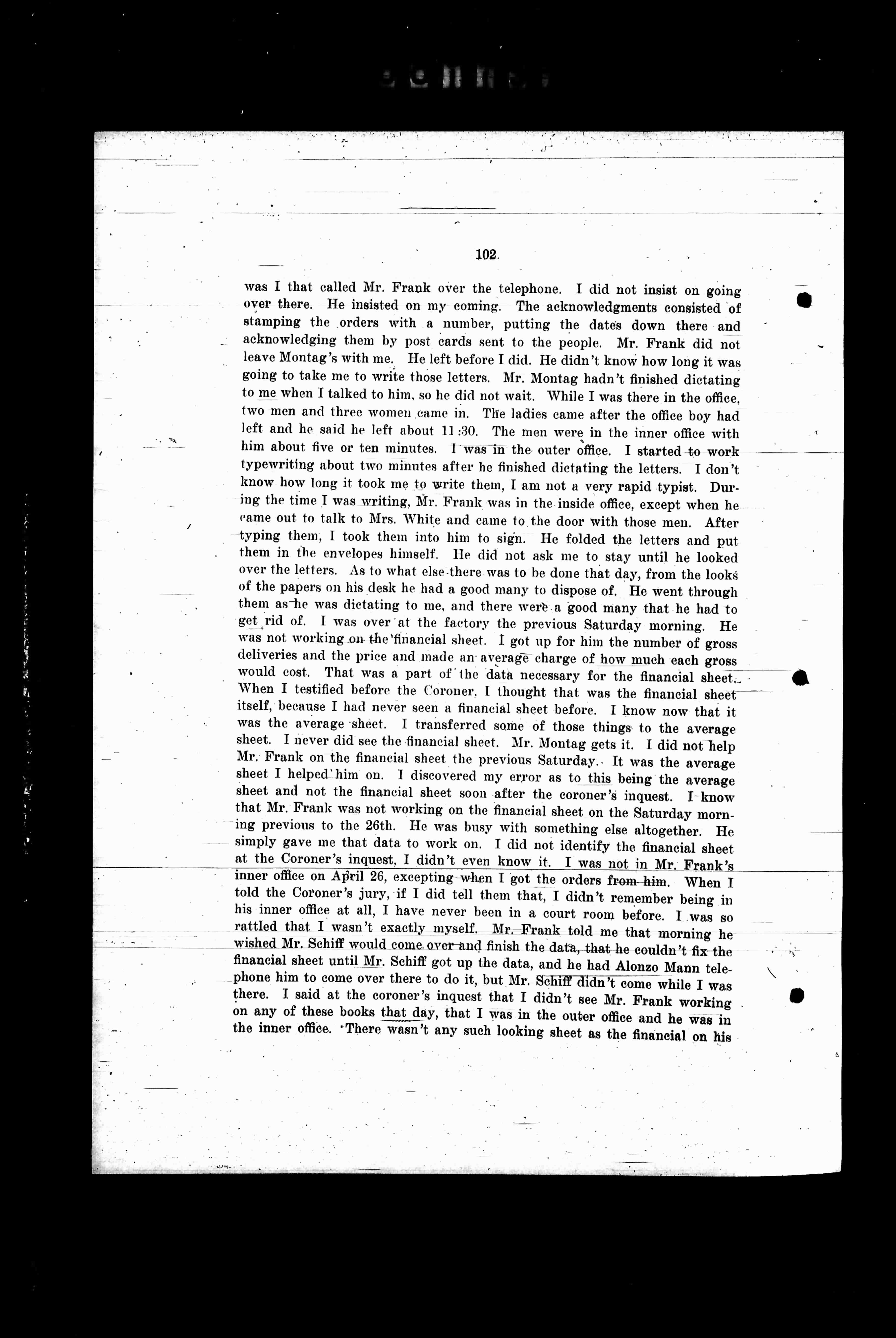 was I that called Mr. Frank over the telephone. I did not insist on going over there. He insisted on my coming. The acknowledgments consisted of stamping the orders with a number, putting the dates down there and acknowledging them by post cards to the people. Mr. Frank did not leave Montag's with me. He left before I did. He didn't know how long it was going to take me to write those letters. Mr. Montag hadn't finished dictating to me when I talked to him, so he did not wait. While I was there in the office, two men and three women came in. The ladies came after the office boy had left and he said he left about 11:30. The men were in the inner office with him about five or ten minutes. I was in the outer office. I started to work typewriting about two minutes after he finished dictating the letters. I don't know how long it took me to write them, I am not a very rapid typist. During the time I was writing, Mr. Frank was in the inside office, except when he came out to talk to Mrs. White and came to the door with those men. After typing them, I took them into him to sign. He folded the letters and put them in the envelopes himself. He did not ask me to stay until he looked over the letters. As to what else there was to be done that day, from the looks of the papers on his desk he had a good many to dispose of. He went through them as he was dictating to me, and there were a good many that he had to get rid of. I was over at the factory the previous Saturday morning. He was not working on the financial sheet. I got up for him the number of gross deliveries and the price and made an average charge of how much each gross would cost. That was a part of the data necessary for the financial sheet. When I testified before the Coroner, I thought that was the financial sheet itself, because I had never seen an financial sheet before. I know now that it was the average sheet. I transferred some of those things to the average sheet. I never did see the financial sheet. Mr. Montag gets it. I did not help Mr. Frank on the financial sheet the previous Saturday. It was the average sheet I helped him on. I discovered my error as to this being the average sheet and not the financial sheet some after the coroner's inquest. I know that Mr. Frank was not working on the financial sheet on the Saturday morning previous to the 26th. He was working on something else altogether. He simply gave me that data to work on. I did with something else altogether. He simply gave me that data to work on. I did not identify the financial sheet at the Coroner's inquest. I didn't even know it. I was not in Mr. Frank's inner office on April 26, excepting when I got the orders from him. When I told the Coroner's jury, if I did tell them that, I didn't remember being in his inner office at all. I have never been in a court room before. I was so rattled that I wasn't exactly myself. Mr. Frank told me that morning he wished Mr. Schiff would come over and finish the data, that he couldn't fix the financial sheet until Mr. Schiff got up the data, and he had Alonzo Mann telephone him to come over there too, but Mr. Schiff didn't come while I was there. I said at the coroner's inquest that I didn't see Mr. Frank working on any of these books that day, that I was in the outer office and he was in the inner office. There wasn't any such looking sheet as the financial on his
