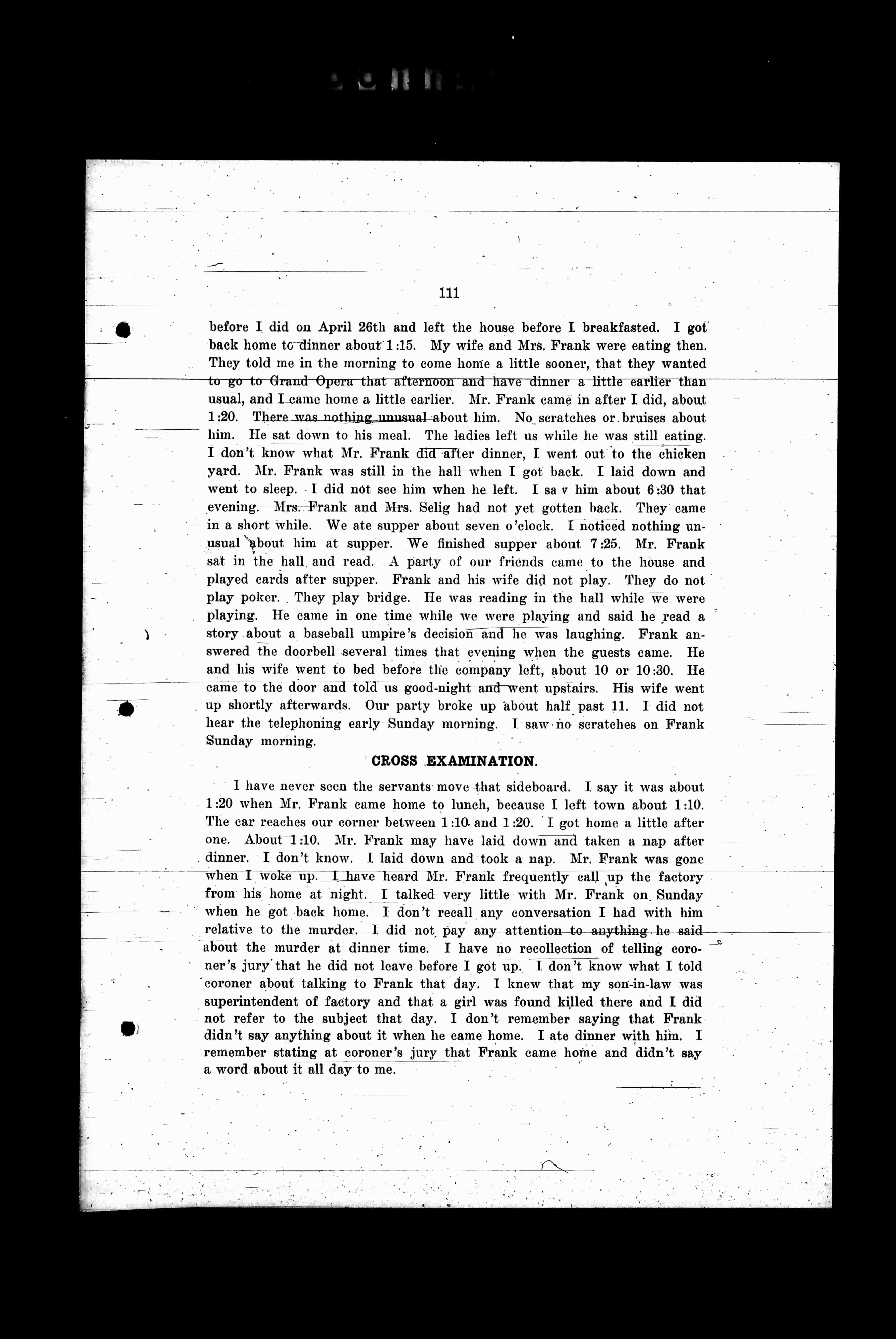 before I did on April 26th and left the house before I breakfasted. I got back home to dinner about 1:15. My wife and Mrs. Frank were eating then. They told me in the morning to come home a little sooner, that they wanted to go to Grand-Opera that afternoon. We have dinner a little earlier than usual, and I came home a little earlier. Mr. Frank came in after I did, about 1:20. There was nothing unusual about him. No scratches or bruises about him. He sat down to his meal. The ladies left us while he was still eating. I don't know what Mr. Frank did after dinner. I went out to the chicken yard. Mr. Frank was still in the hall when I got back. I laid down and went to sleep. I did not see him when he left. I saw him about 6:30 that evening. Mrs. Frank and Mrs. Selig had not yet gotten back. They came in a short while. We ate supper about seven o'clock. I noticed nothing unusual about him at supper. We finished supper about 7:25. Mr. Frank sat in the hall and read. A party of our friends came to the house and played cards after supper. Frank and his wife did not play. They do not play poker. They play bridge. He was reading in the hall while we were playing. He came in one time while we were playing and said he read a story about a baseball umpire's decision and he was laughing. Frank answered the doorbell several times that evening when the guests came. He and his wife went to bed before the company left, about 10 or 10:30. He came to the door and told us good-night and went upstairs. His wife went up shortly afterwards. Our party broke up about half past 11. I did not hear the telephoning early Sunday morning. I saw no scratches on Frank Sunday morning.