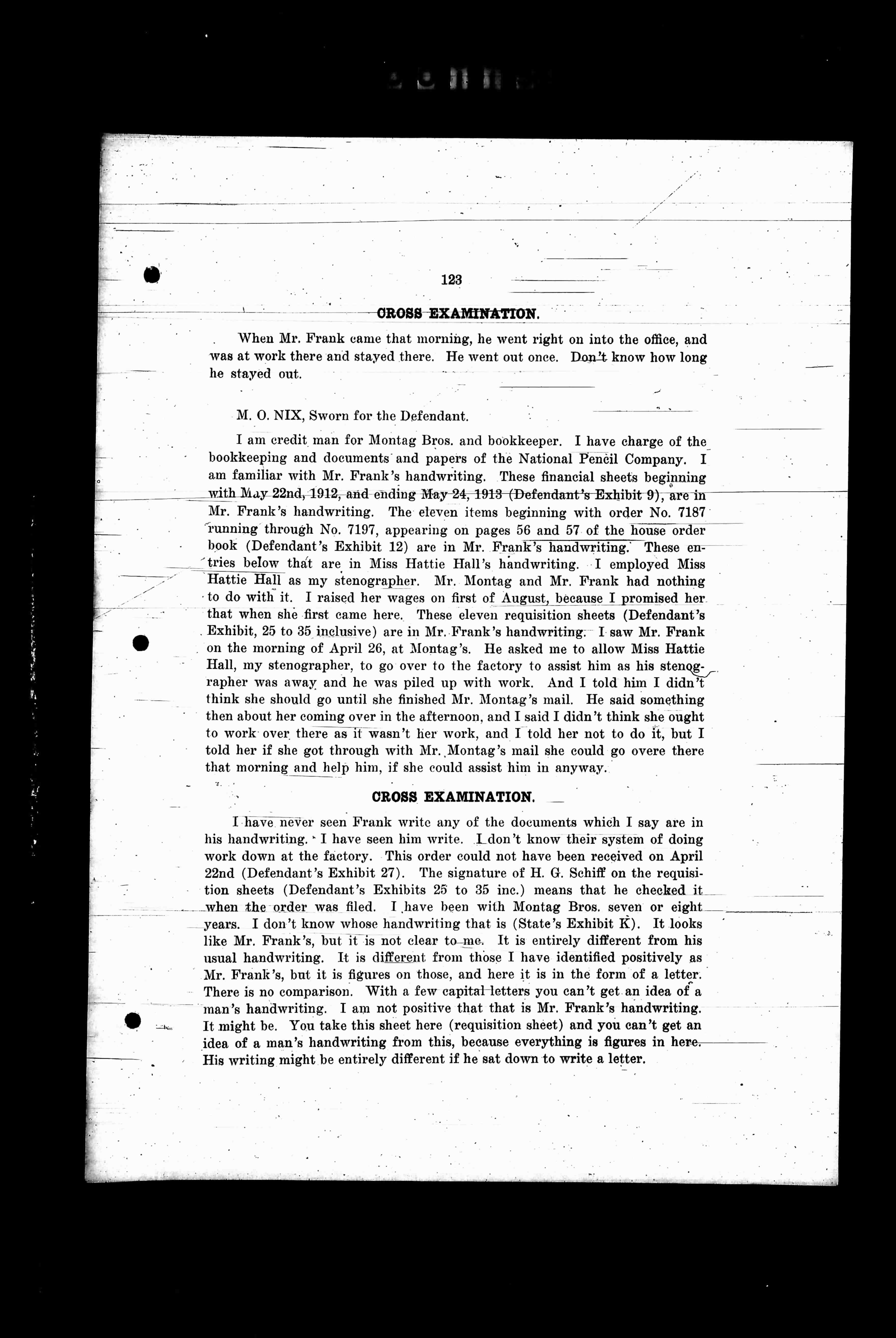 I am credit man for Montag Bros. and bookkeeper. I have charge of the bookkeeping and documents and papers of the National Pencil Company. I am familiar with Mr. Frank’s handwriting. These financial sheets beginning with May 22nd, 1912, and ending May 24, 1913 (Defendant’s Exhibit 9), are in Mr. Frank’s handwriting. The eleven items beginning with order No. 7187 running through No. 7197, appearing on pages 56 and 57 of the house order book (Defendant’s Exhibit 12) are in Mr. Frank’s handwriting. These entries below that are in Miss Hattie Hall’s handwriting. I employed Miss Hattie Hall as my stenographer. Mr. Montag and Mr. Frank had nothing to do with it. I raised her wages on first of August, because I promised her that when she first came here. These eleven requisition sheets (Defendant’s Exhibit, 25 to 35 inclusive) are in Mr. Frank’s handwriting. I saw Mr. Frank on the morning of April 26, at Montag’s. He asked me to allow Miss Hattie Hall, my stenographer, to go over to the factory to assist him as his stenographer was away and he was piled up with work. And I told him I didn’t think she should go until she finished Mr. Montag’s mail. He said something then about her coming over in the afternoon, and I said I didn’t think she ought to work over there as it wasn’t her work, and I told her not to do it, but I told her if she got through with Mr. Montag’s mail she could go over there that morning and help him, if she could assist him in anyway.