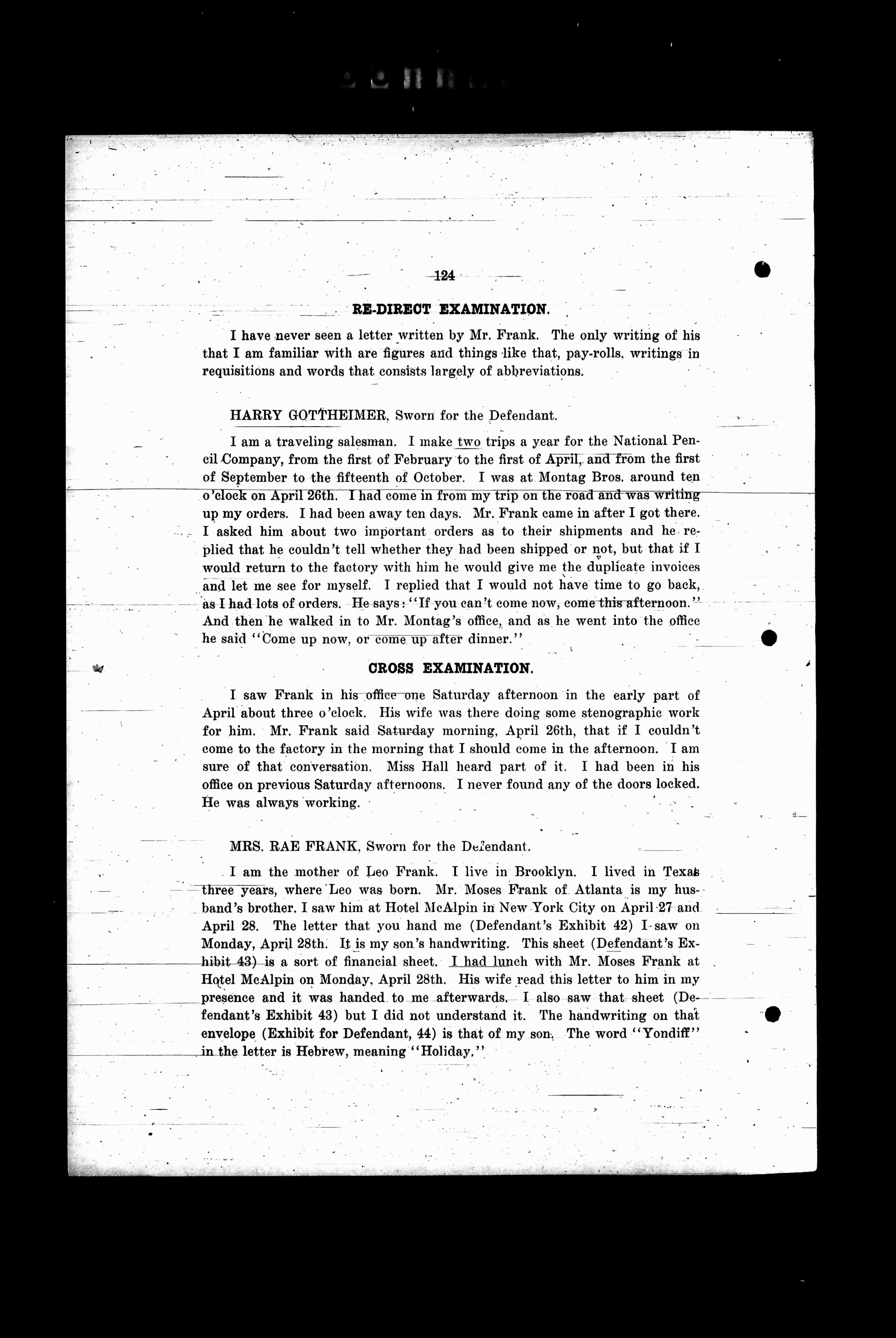 I am the mother of Leo Frank. I live in Brooklyn. I lived in Texas three years, where Leo was born. Mr. Moses Frank of Atlanta is my husband's brother. I saw him at Hotel McAlpin in New York City on April 27 and April 28. The letter that you hand me (Defendant's Exhibit 42) I saw on Monday, April 28th. It is my son's handwriting. This sheet (Defendant's Exhibit 43) is a sort of financial sheet. I had lunch with Mr. Moses Frank at Hotel McAlpin on Monday, April 28th. His wife read this letter to him in my presence and it was handed to me afterwards. I also saw that sheet (Defendant's Exhibit 43) but I did not understand it. The handwriting on that envelope (Exhibit for Defendant, 44) is that of my son. The word "Yondiff" in the letter is Hebrew, meaning "Holiday."