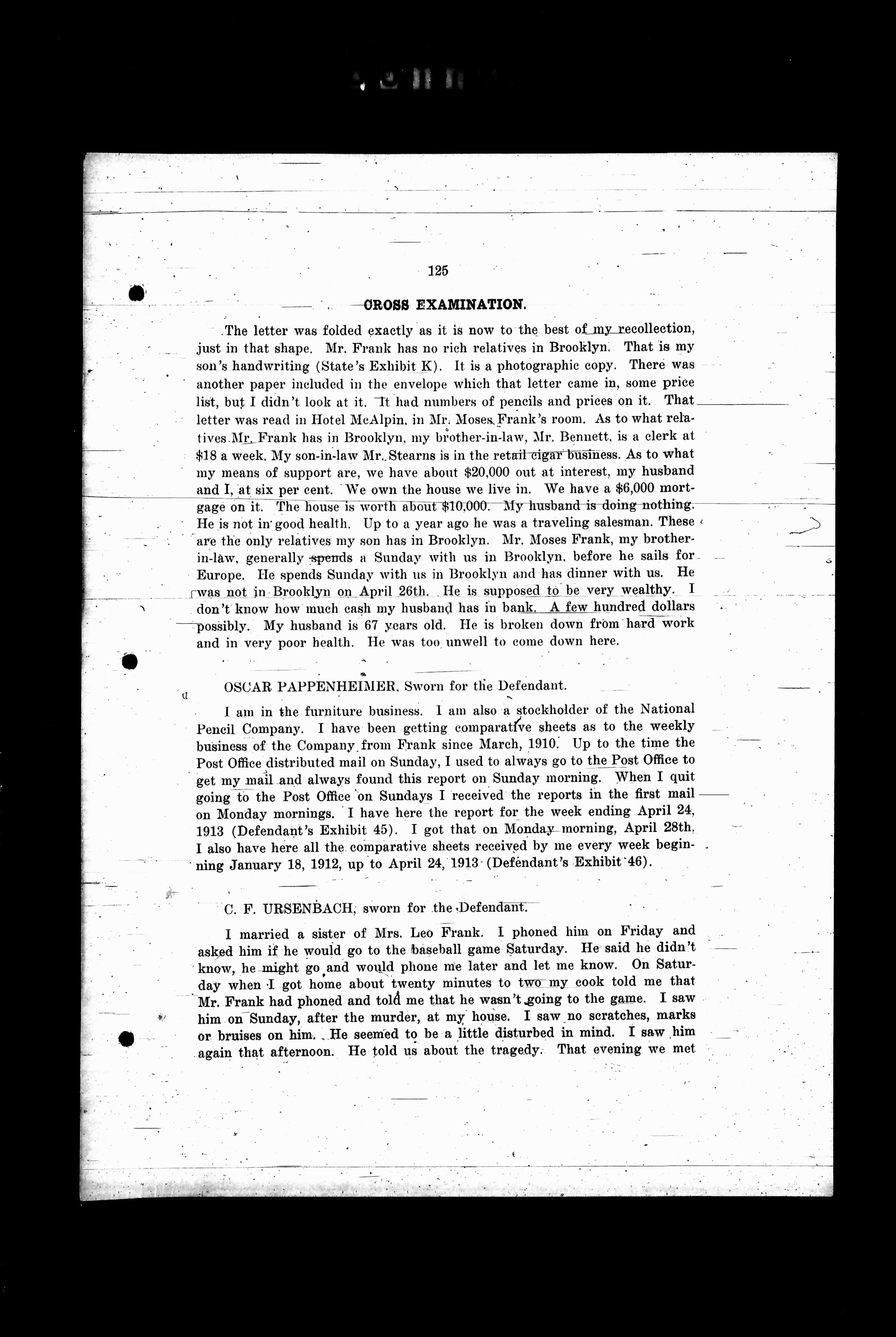 The letter was folded exactly as it is now to the best of my recollection, just in that shape. Mr. Frank has no rich relatives in Brooklyn. That is my son’s handwriting (State’s Exhibit K). It is a photographic copy. There was another paper included in the envelope which that letter came in, some price list, but I didn’t look at it. It had numbers of pencils and prices on it. That letter was read in Hotel McAlpin, in Mr. Moses Frank’s room. As to what relatives Mr. Frank has in Brooklyn, my brother-in-law, Mr. Bennett, is a clerk at $18 a week. My son-in-law Mr. Stearns is in the retail cigar business. As to what my means of support are, we have about $20,000 out at interest, my husband and I, at six per cent. We own the house we live in. We have a $6,000 mortgage on it. The house is worth about $10,000. My husband is doing nothing. He is not in good health. Up to a year ago he was a traveling salesman. These are the only relatives my son has in Brooklyn, Mr. Moses Frank, my brother-in-law, generally spends a Sunday with us in Brooklyn, before he sails for Europe. He spends Sunday with us in Brooklyn and has dinner with us. He was not in Brooklyn on April 26th. He is supposed to be very wealthy. I don’t know how much cash my husband has in bank. A few hundred dollars possibly. My husband is 67 years old. He is broken down from hard work and in very poor health. He was too unwell to come down here.