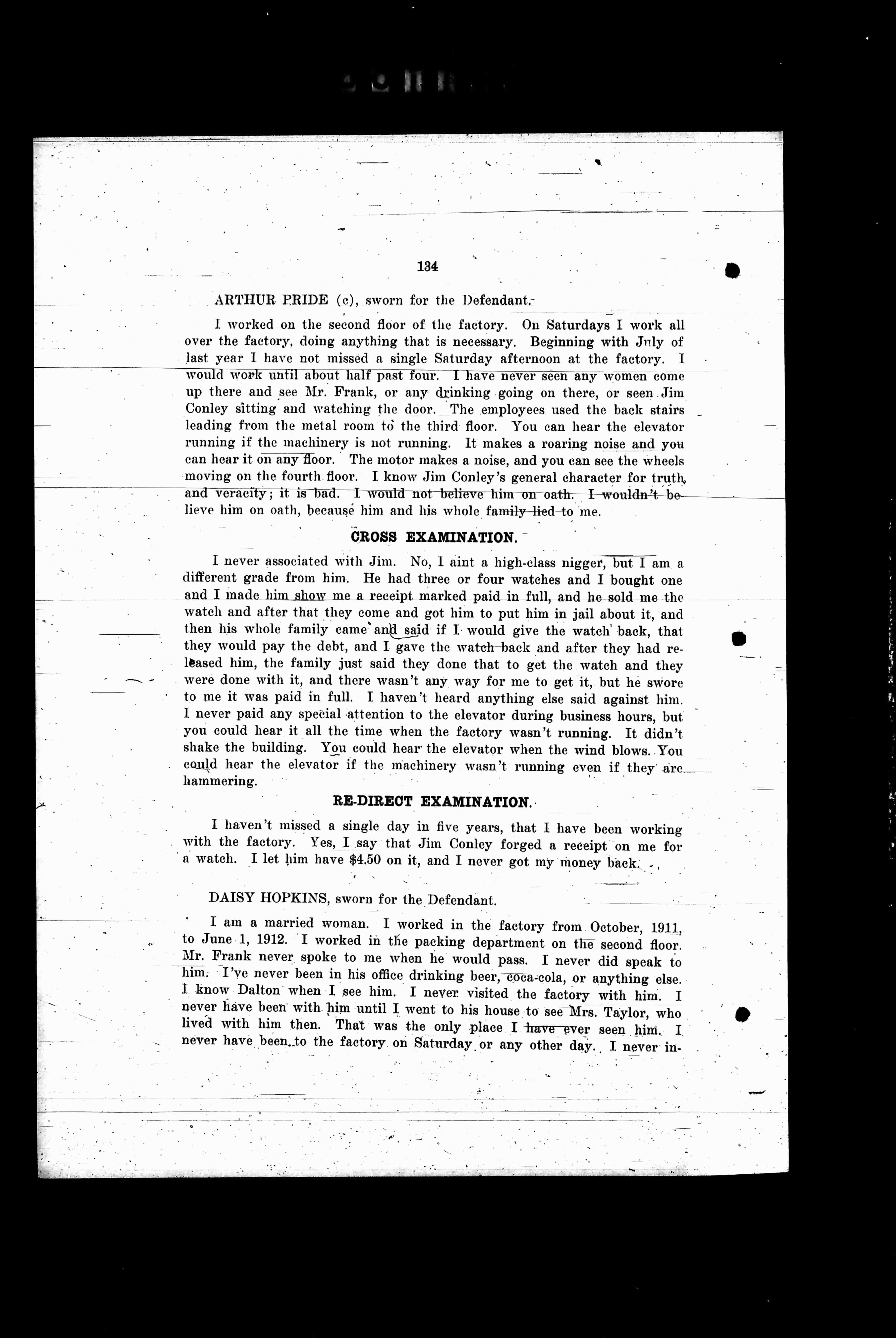 I am a married woman. I worked in the factory from October, 1911, to June 1, 1912. I worked in the packing department on the second floor. Mr. Frank never spoke to me when he would pass. I never did speak to him. I've never been in his office drinking beer, coca-cola, or anything else. I know Dalton when I see him. I never visited the factory with him. I never have been with him until I went to his house to see Mrs. Taylor, who lived with him then. That was the only place I have ever seen him. I never have been to the factory on Saturday or any other day. I never in-