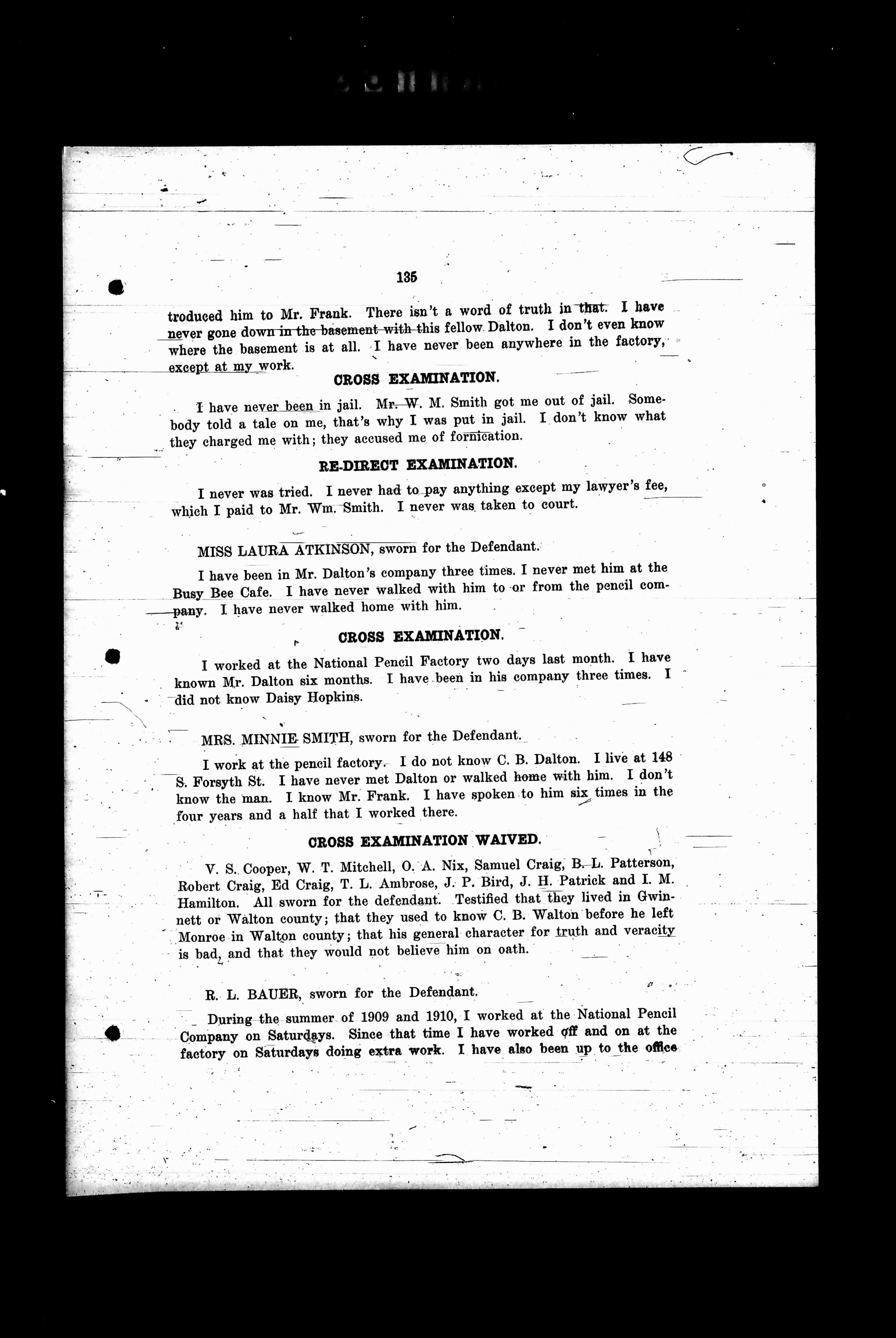 I work at the pencil factory. I do not know C. B. Dalton. I live at 148 S. Forsyth St. I have never met Dalton or walked home with him. I don't know the man. I know Mr. Frank. I have spoken to him six times in the four years and a half that I worked there.