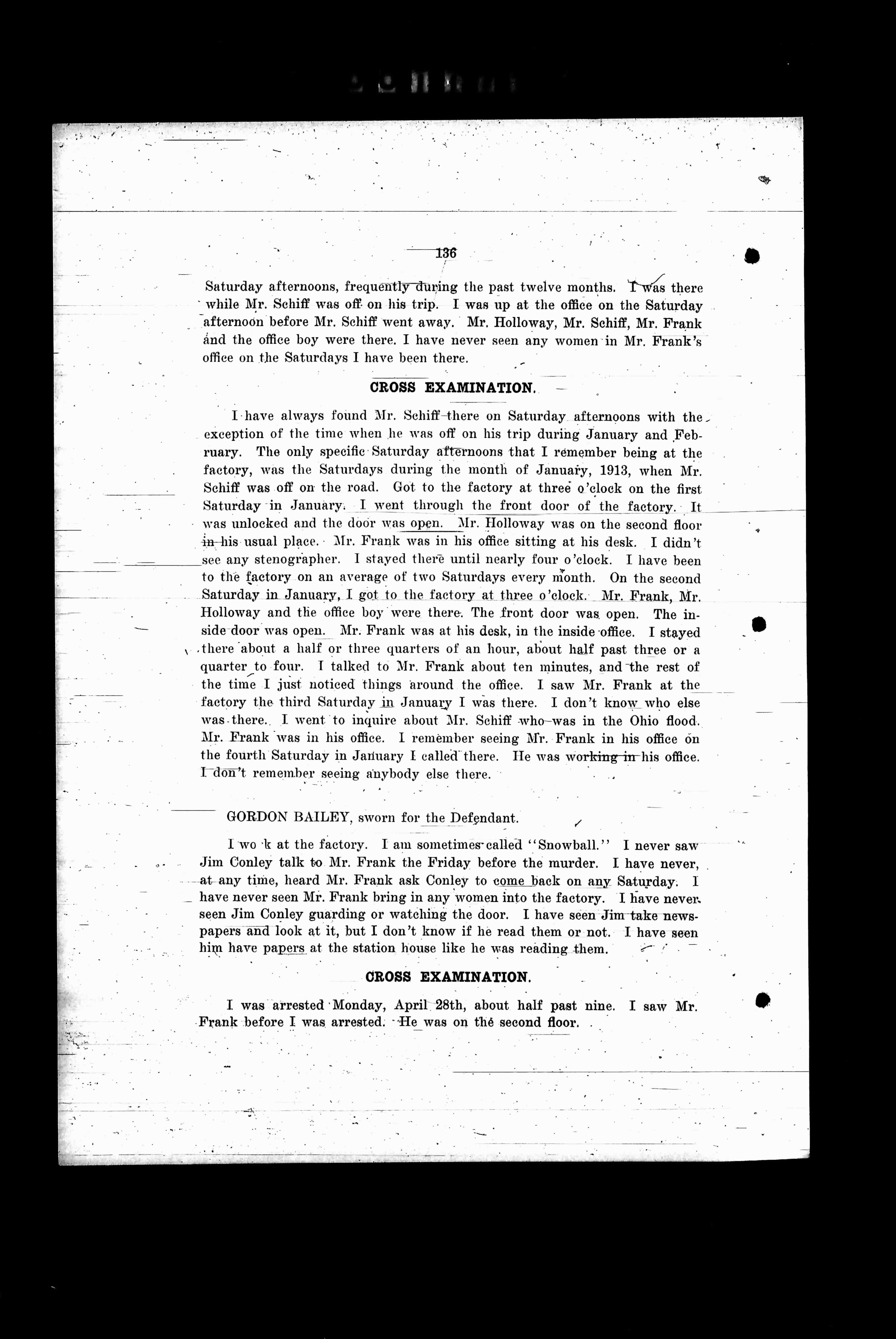 I wo k at the factory. I am sometimes called "Snowball." I never saw Jim Conley talk to Mr. Frank the Friday before the murder. I have never, at any time, heard Mr. Frank ask Conley to come back on any Saturday. I have never seen Mr. Frank bring in any women into the factory. I have never seen Jim Conley guarding or watching the door. I have seen Jim take newspapers and look at it, but I don't know if he read them or not. I have seen him have papers at the station house like he was reading them.